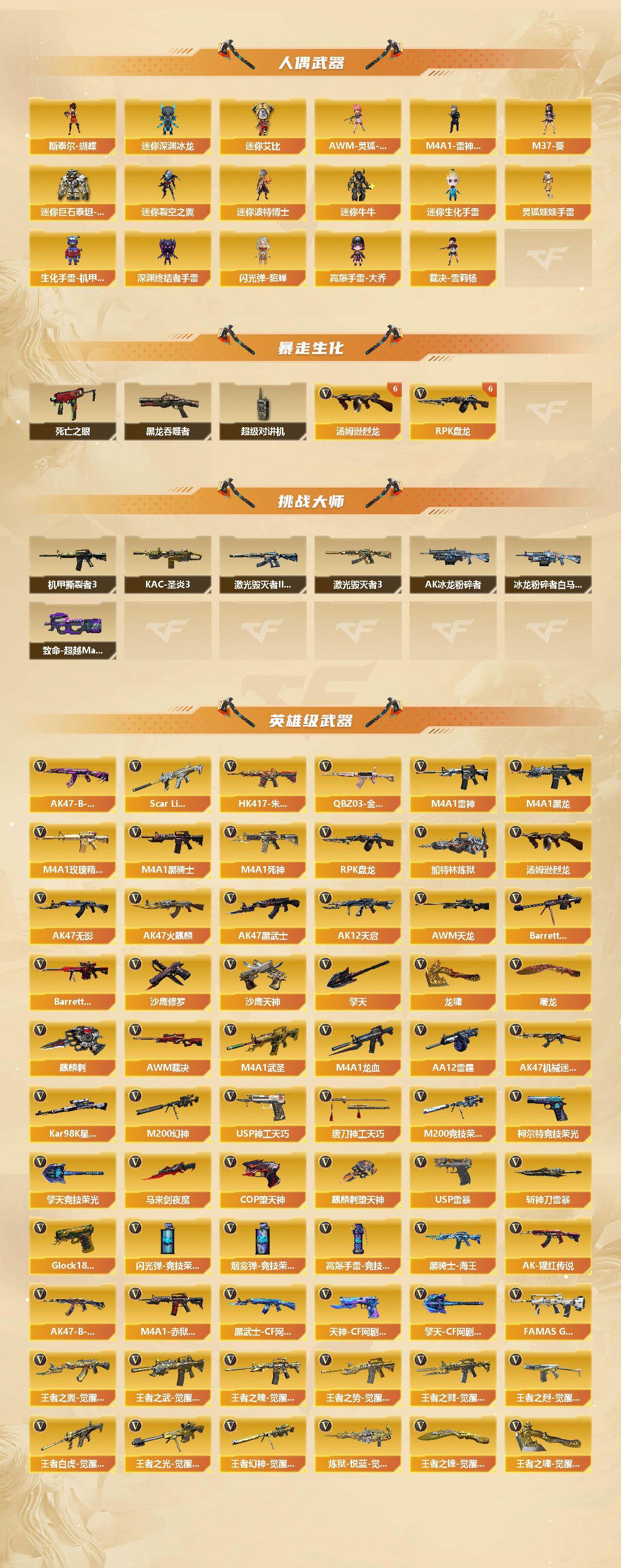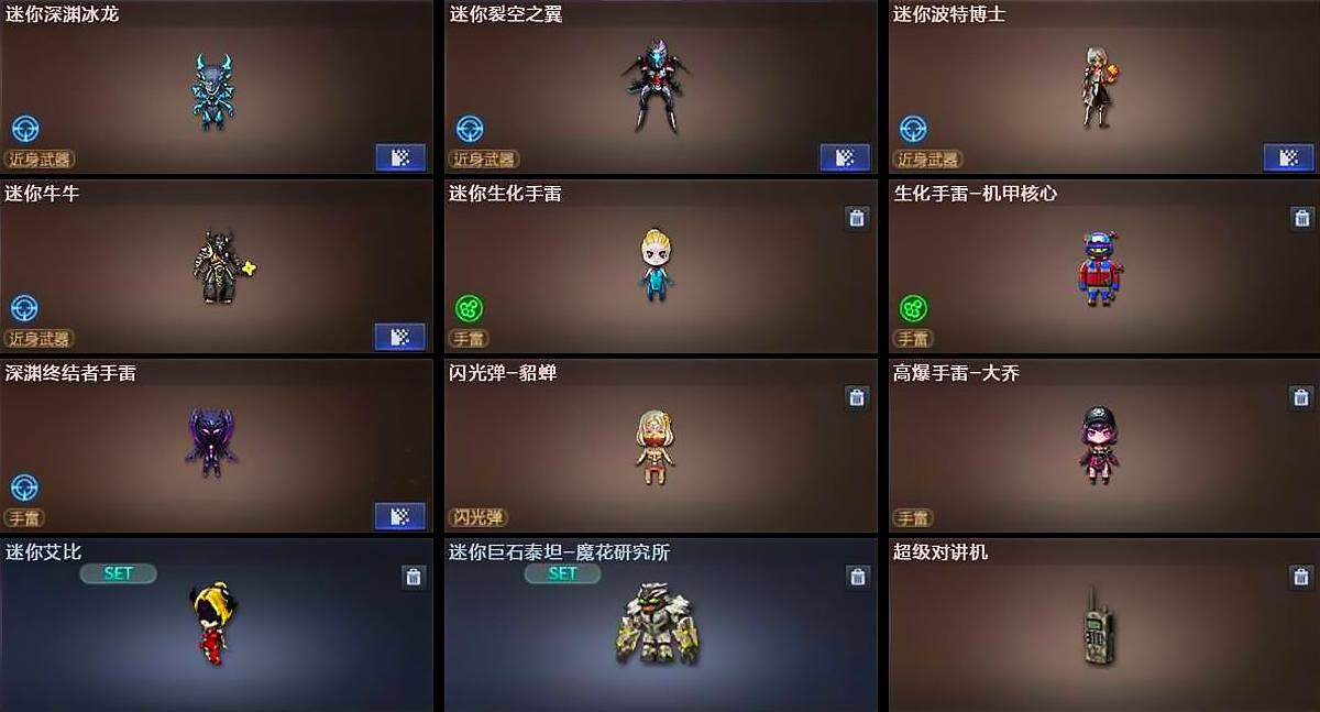 【人偶武器】:裁决-雪莉杨,M4A1-雷神-精英刀锋,斯泰尔-蝴蝶,AWM-灵狐-15周年嘉年华,M37-葵,迷你深渊冰龙,迷你裂空之翼,迷你波特博士,迷你牛牛,迷你生化手雷,生化手雷-机甲核心,深渊终结者手雷,闪光弹-貂蝉,高爆手雷-大乔,迷你艾比,迷你巨石泰坦-魔花研究所,灵狐娃娃手雷