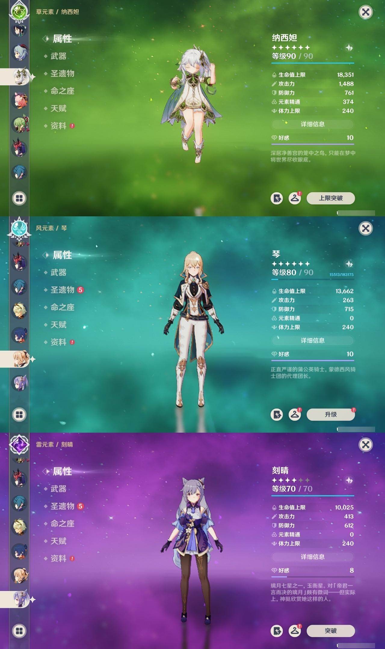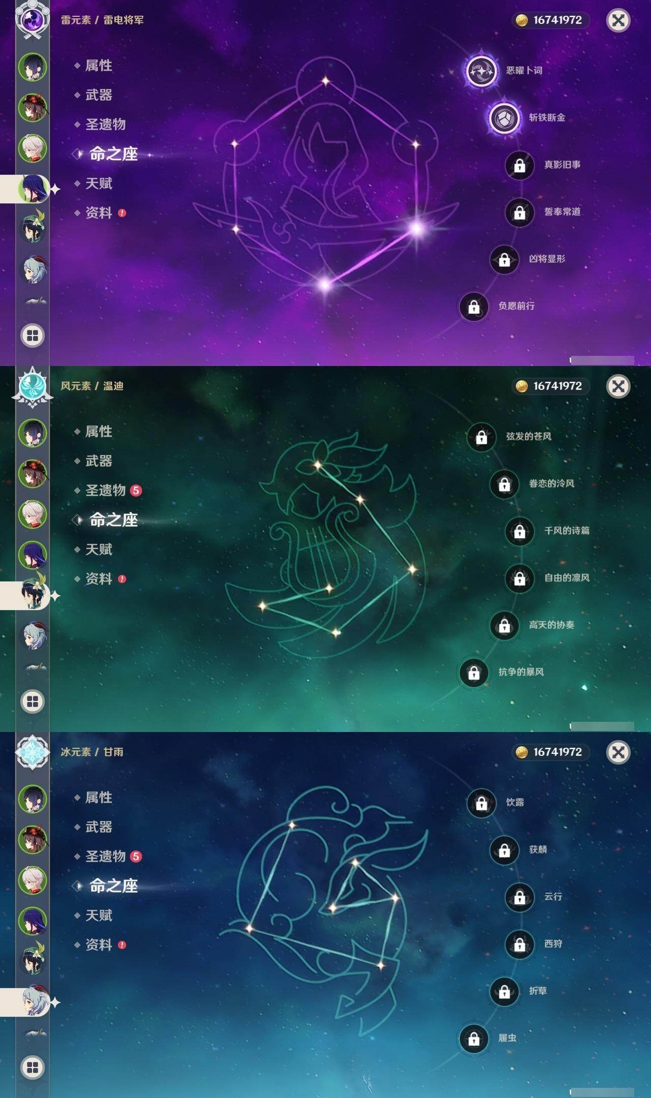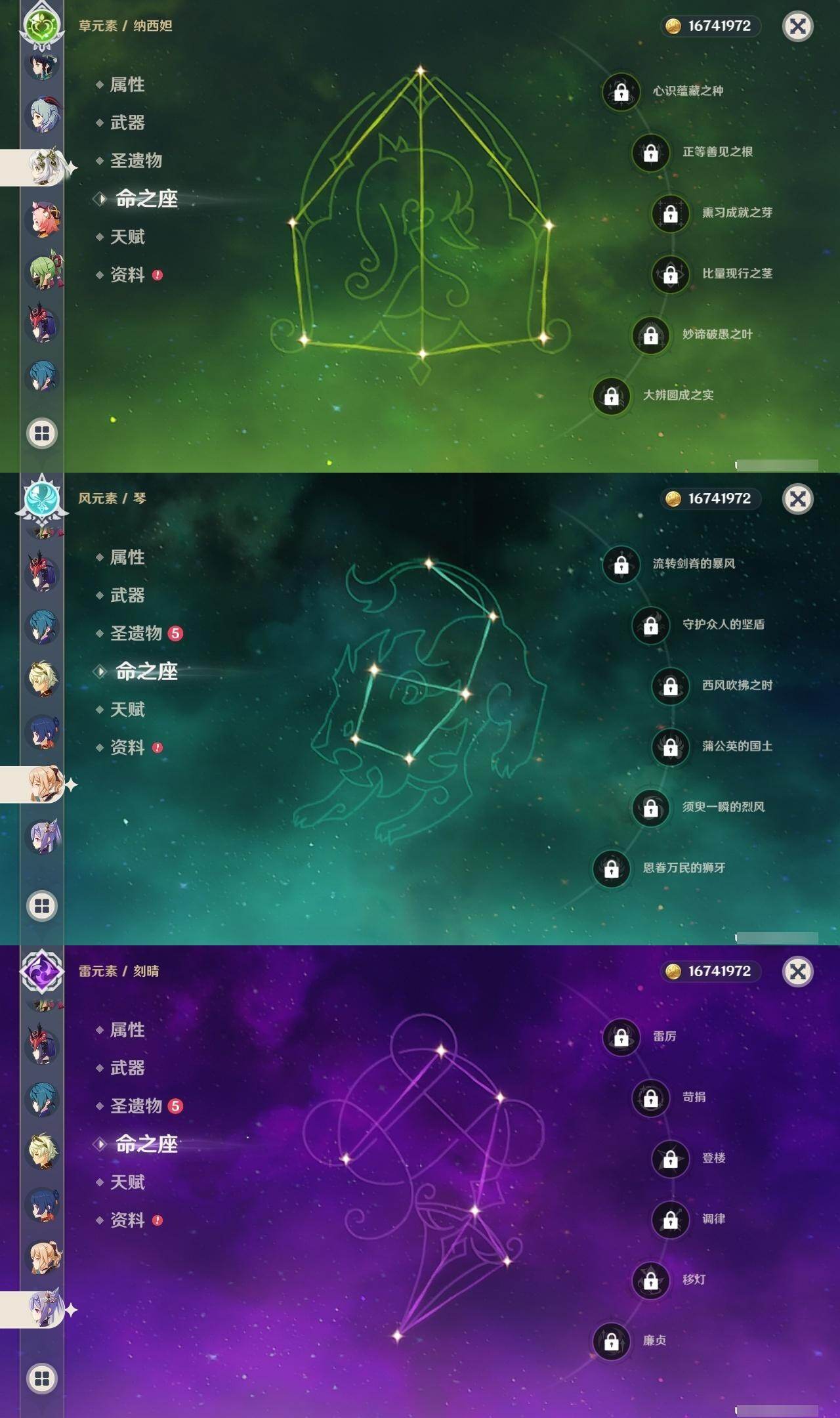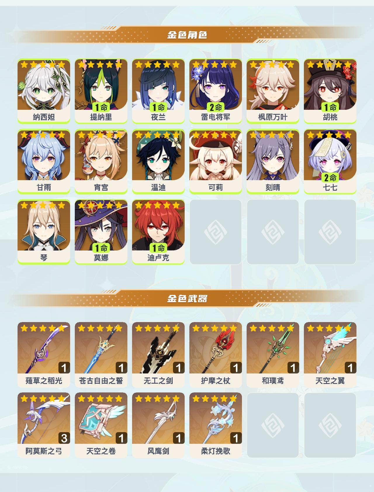 0命纳西妲,1命提纳里,1命夜兰,2命雷电将军,0命枫原万叶,1命胡桃,0命甘雨,0命宵宫,0命温迪,0命可莉,0命刻晴,2命七七,0命琴,1命莫娜,1命迪卢克,精1薙草之稻光,精1苍古自由之誓,精1无工之剑,精1护摩之杖,精1和璞鸢,精1天空之翼,精3阿莫斯之弓,精1天空之卷,精1风鹰剑,精1柔灯挽歌