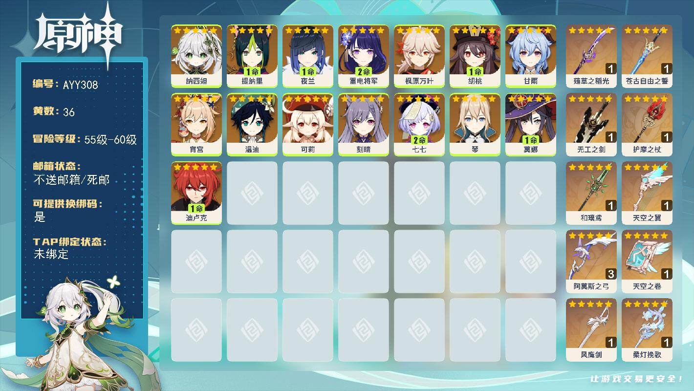 [15659906]59级/36黄/男主/15个五星角色/10个五星武器 0命纳西妲,1命提纳里,1命夜兰,2命雷电将军,0命枫原万叶,1命胡桃,0命甘雨,0命宵宫,0命温迪,0命可莉,0命刻晴,2命七七,0命琴,1命莫娜,1命迪卢克,精1薙草之稻光,精1苍古自由之誓,精1无工之剑,精1护摩之杖,精1和璞鸢,精1天空之翼,精3阿莫斯之弓,精1天空之卷,精1风鹰剑,精1柔灯挽歌