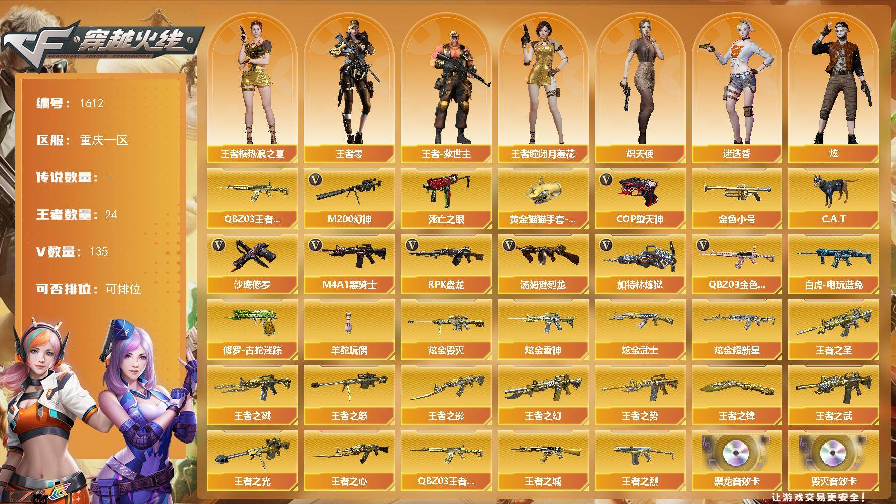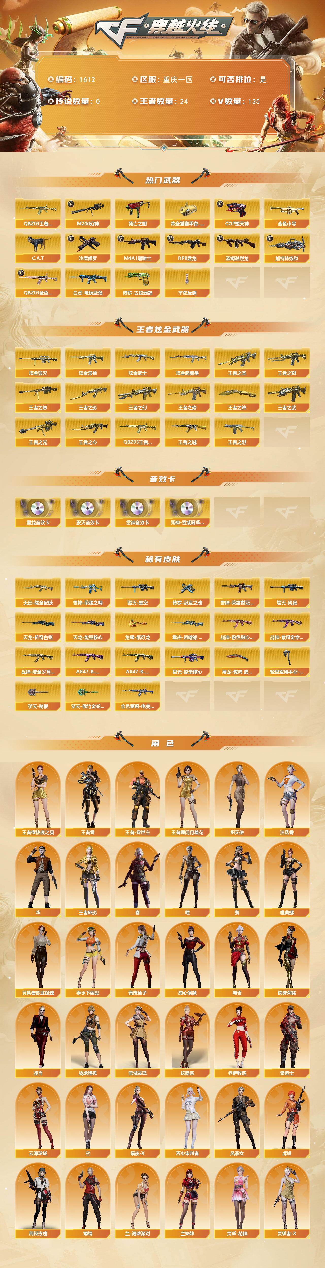 [15660172]重庆一区-135V-24王者-6炫金 【热门武器】:QBZ03-金色蔷薇*2,M200-幻神,QBZ-03-王者蔷薇,修罗-古蛇迷踪,死亡之眼*2,白虎-电玩蓝兔,金色小号,C.A.T,M4A1-黑骑士*2,汤姆逊-烈龙*10,RPK-盘龙,加特林-炼狱*7,羊驼玩偶,COP-堕天神,沙鹰-修罗*4,黄金猫猫手套-白鲨 【王者炫金武器】:王者之圣,王者之城,王者之戮,王者之幻,王者之势,王者之武,王者之影,王者之心,王者之烈,QBZ-03-王者蔷薇,王者之光,王者之怒*2,王者之锋,炫金雷神,炫金武士,炫金超新星,炫金毁灭*3 【音效卡】:M4A1-雷神音效卡,M4A1-黑龙音效卡,Barrett-毁灭音效卡,死神-雪域霜狐-怀旧音效卡 【皮肤】:金色蔷薇-电竞之星 皮肤,裁决-运输船 皮肤,雷神-荣耀之魄,雷神-荣耀世冠AG,毁灭-星空,毁灭-风暴,无影耀金皮肤,战神-粉色甜心皮肤*4,战神-紫绶金章皮肤*7,战神-流金岁月皮肤*3,AK47-B-常胜将军-曹操,AK47-B-常胜将军-孙权,天龙-能量核心,AWM-天龙-传奇白鲨,极光-能量核心,修罗-冠军之魂,屠龙-惊鸿 皮肤,龙啸-纸灯龙皮肤,轻型军用手斧-再燃火线,擎天-秘银,擎天-傲竹金蛇 皮肤 【角色】:葵,瞳,炫,春,迷迭香,凌霄,妮妮,战地猎狐,王者-瞳-闭月羞花,王者樱-热浪之夏,王者-零,王者-魅影,王者-救世主,雪域霜狐,蛇隐宗,乔伊教练,修道士,云海玲珑,炽天使,空,暗夜-X,芳心审判者,风暴女*2,虎妞,荆棘玫瑰,娟娟,兰-海滩派对,兰妹妹,零-水下丽影,灵狐-花神,灵狐者-X,灵狐者-黄金海岸,灵狐者-职业经理,龙儿,龙儿-小淘气,麻雀,玫瑰花神,潘多拉-X,潘多拉-甜心教官,青霞仙子,蛇姬,甜心偶像,蜀雪,铁骑-乘风破浪,铁骑荣耀,铁扇公主-暗灵,雪莉杨,雪莉杨-摸金校尉,樱-缤纷夏日,智影,雅典娜 【人偶武器】:天龙-曼陀罗,火麒麟-灵狐,M37-葵,C.A.T,迷你深渊冰龙,迷你裂空之翼,生化手雷-机甲核心,深渊终结者手雷,闪光弹-小乔,迷你艾比 【暴走生化】:黑龙吞噬者,死亡之眼*2 【挑战大师】:冰龙粉碎者-白马银枪,VEPR-12-金魔,激光毁灭者III 【英雄级武器】:AK47-火麒麟,M4A1-黑龙*3,M4A1-雷神*2,M4A1-黑骑士*2,AK47-无影*4,M4