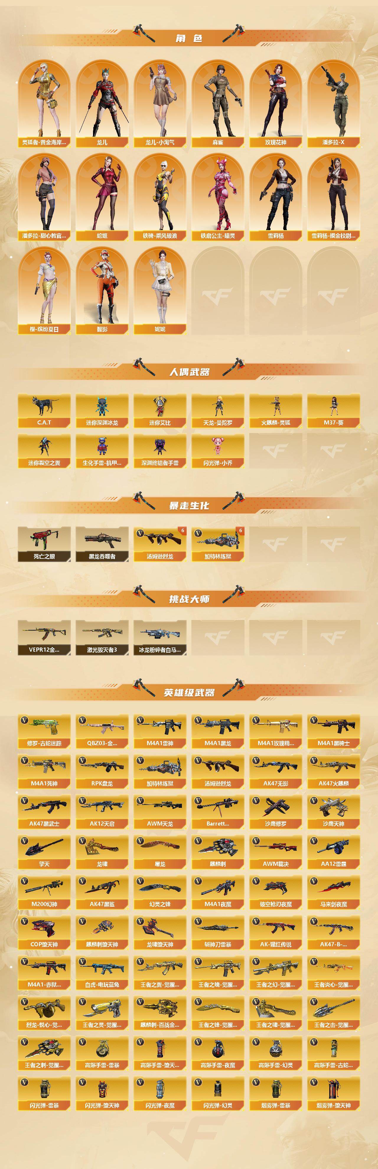 【英雄级武器】:AK47-火麒麟,M4A1-黑龙*3,M4A1-雷神*2,M4A1-黑骑士*2,AK47-无影*4,M4