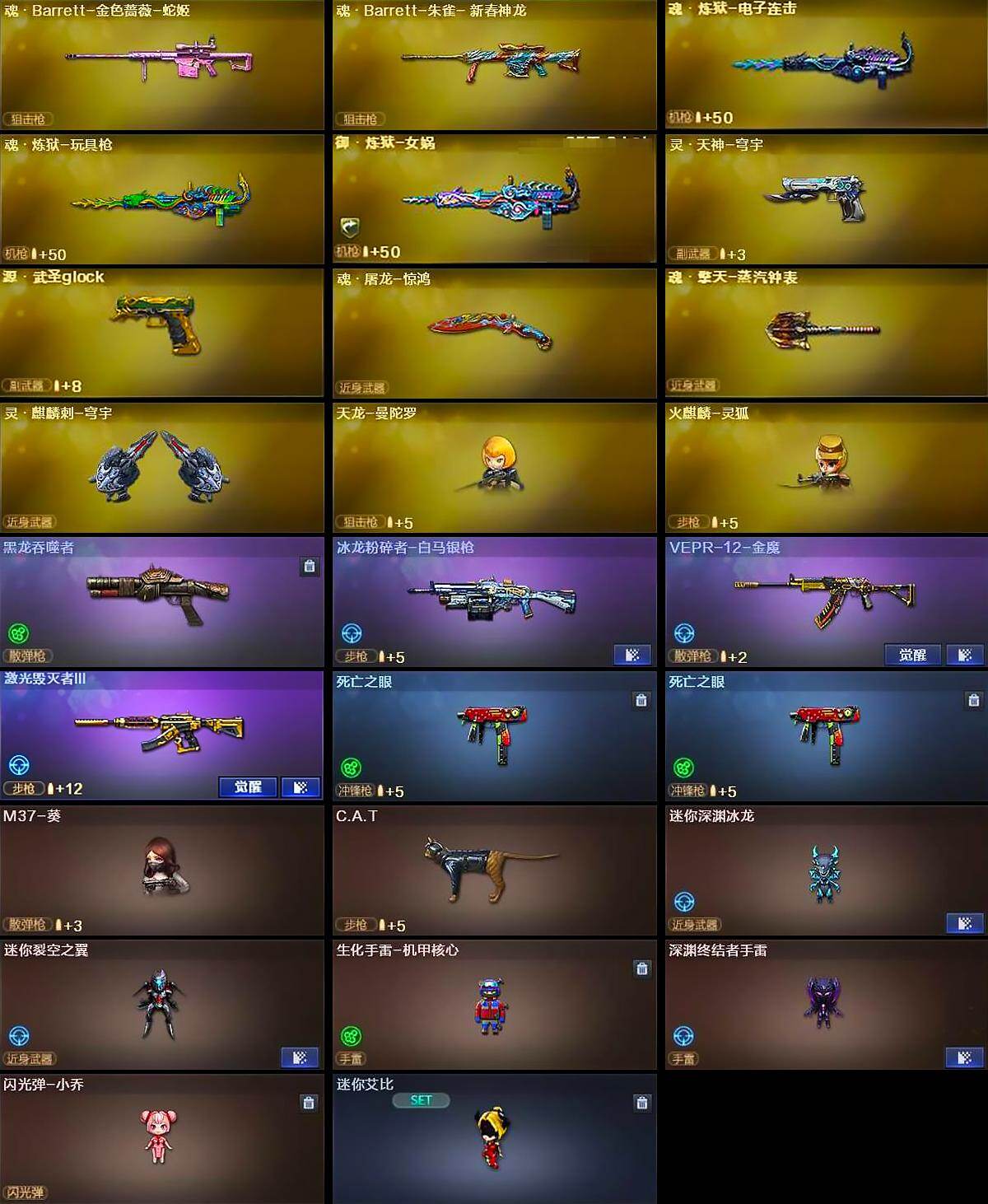 【热门武器】:QBZ03-金色蔷薇*2,M200-幻神,QBZ-03-王者蔷薇,修罗-古蛇迷踪,死亡之眼*2,白虎-电玩蓝兔,金色小号,C.A.T,M4A1-黑骑士*2,汤姆逊-烈龙*10,RPK-盘龙,加特林-炼狱*7,羊驼玩偶,COP-堕天神,沙鹰-修罗*4,黄金猫猫手套-白鲨