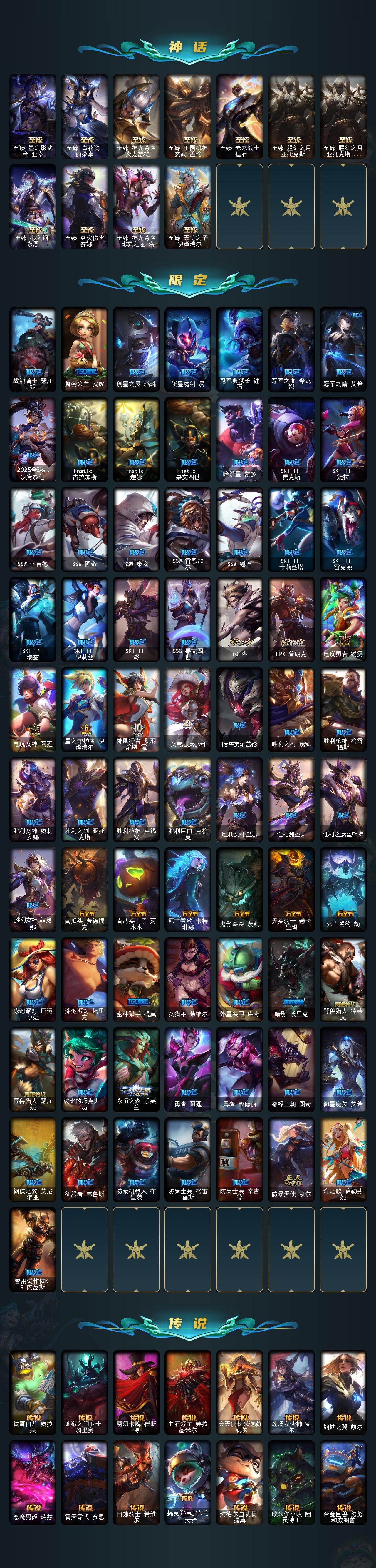 【神话皮肤】:十周年纪念安妮,源代码乐芙兰,十五周年纪念希维尔,水晶圣骑艾希,神凰行者瑞羽圣凰艾尼维亚,水晶掠夺者卡兹克,灰烬杀手塞拉斯,海克斯科技嘉文四世,海克斯科技雷克顿,至臻真实伤害赛娜,至臻神龙尊者比翼之龙洛,至臻天龙之子伊泽瑞尔,至臻暗星墨菲特,至臻北极星使者沃里克,至臻海珀利安小队X09星环灵风迦娜,至臻黑夜使者凯隐,至臻灵能特工伊泽瑞尔,至臻墨之影武者亚索,至