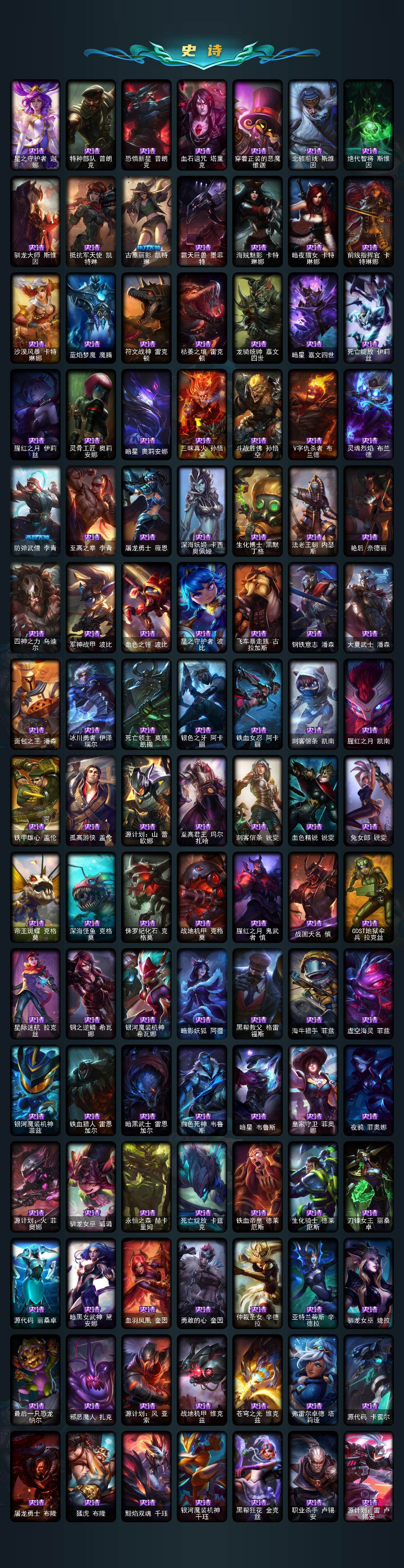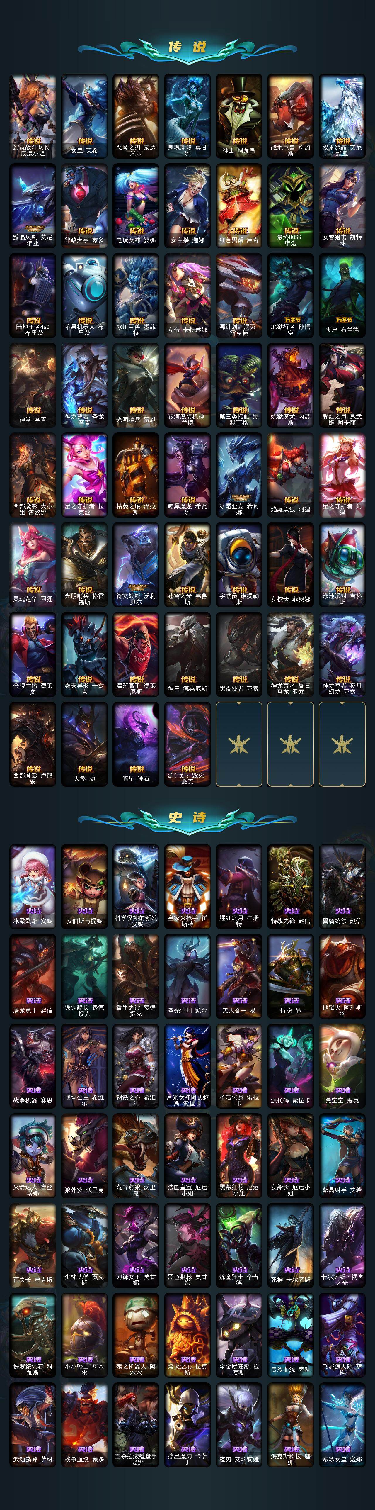 【臻彩皮肤】:天龙之子卡莎飞龙乘云,无畏骑士瑟庄妮赤子初心,吕布奉先炫金战神,赵云子龙炫金将军,墨之影武者亚索金墨耀影,冠军之血希瓦娜凯旋圣装,闭月之颜貂蝉炫金莲华,玉剑传说舞剑仙承影,霸天异形卡兹克刹那银光,持七彩冰棍的雪人易,魔女阿卡丽虚荣,魔女阿狸饕餮,净雪之月莫甘娜冬虹,幻灵战斗兔阿萝拉梦幻强袭,北极星钢影卡蜜尔智慧纽带,心之钢伊泽瑞尔天纵才华