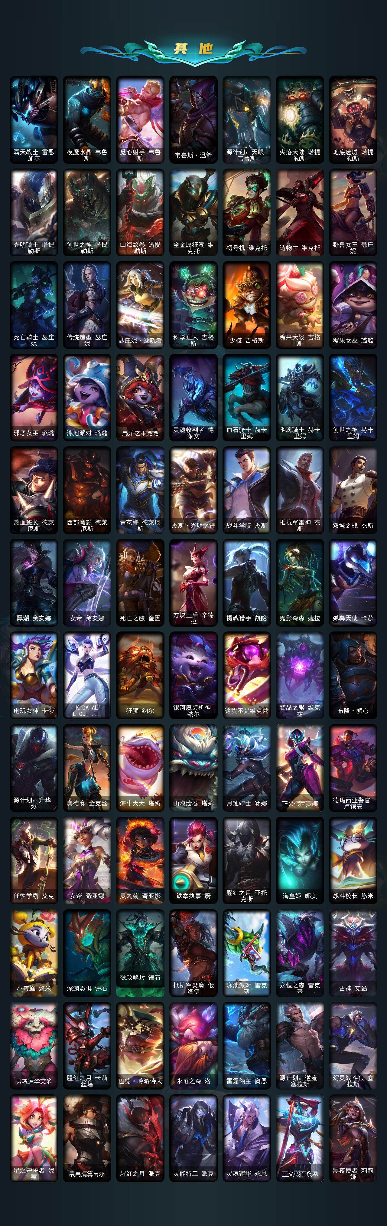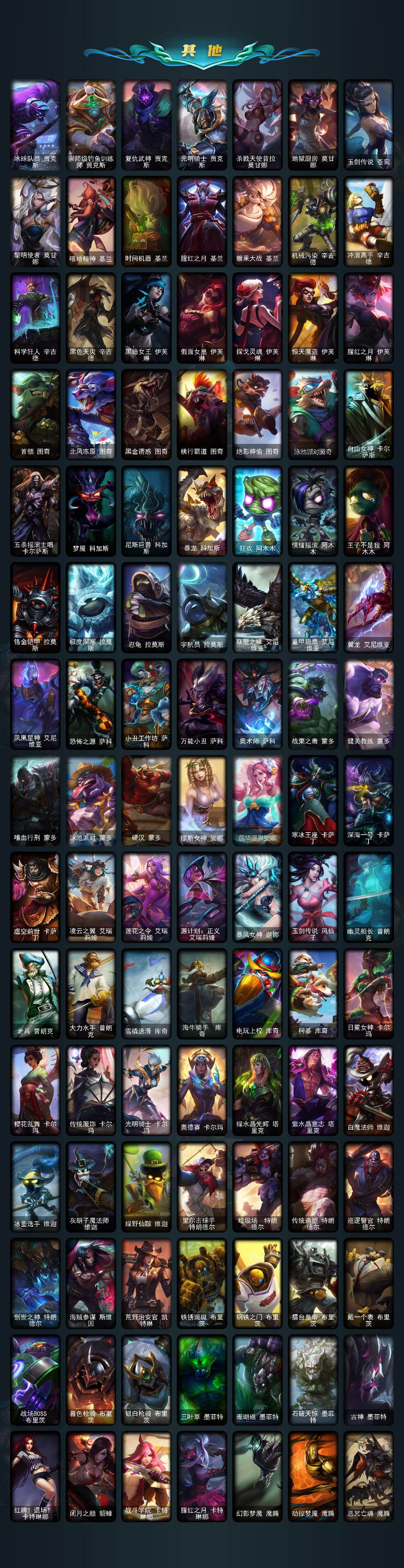 【冰雪限定】:幸福女神乐芙兰,冰雪风暴希维尔,圣诞开心鬼提莫,圣诞精灵崔丝塔娜,圣诞糖果棒厄运小姐,圣诞狂欢基兰,阿木木“主人不要我了”,胡桃夹子萨科,平安夜女神娑娜,邪恶圣诞老人维迦,喜庆之树茂凯,雪默丁格,雪装奈德丽,圣诞玩偶波比,冰雪驯鹿波比,圣诞老人古拉加斯,魄罗骑士瑟庄妮,寒冬精灵璐璐,圣诞老人德莱文,冰雪节辛吉德,冰雪兽纳尔
