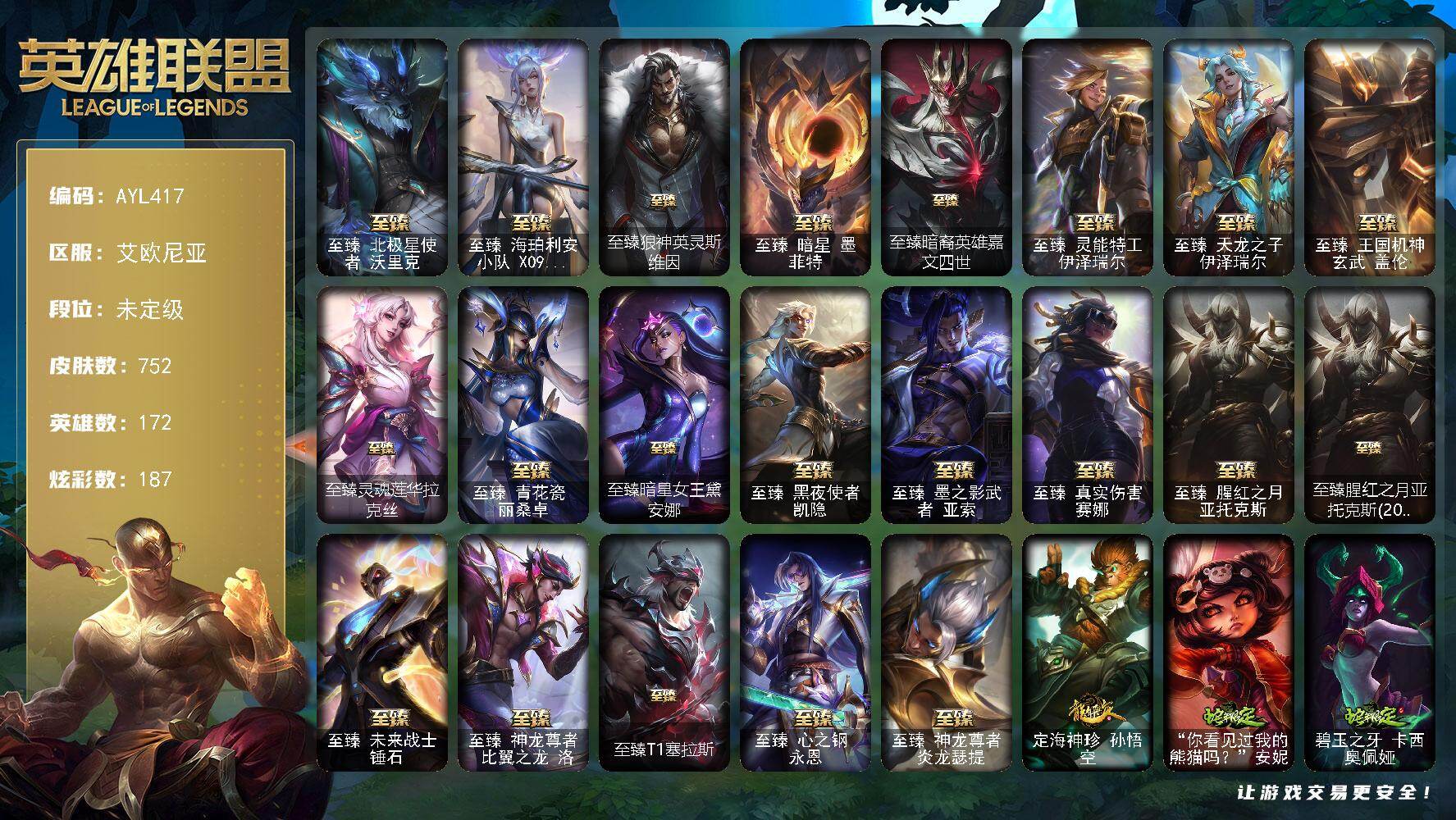 [15660307]【特价出售/店主推荐】未定级段位-172英雄-752皮肤-187炫彩-3终极-30神话-104限定-67传说-172史诗 【至臻皮肤】:至臻北极星使者沃里克,至臻海珀利安小队X09星环灵风迦娜,至臻狼神英灵斯维因,至臻暗星墨菲特,至臻暗裔英雄嘉文四世,至臻灵能特工伊泽瑞尔,至臻天龙之子伊泽瑞尔,至臻王国机神玄武盖伦,至臻灵魂莲华拉克丝,至臻青花瓷丽桑卓,至臻暗星女王黛安娜,至臻黑夜使者凯隐,至臻墨之影武者亚索,至臻真实伤害赛娜,至臻腥红之月亚托克斯,至臻腥红之月亚托克斯(2022),至臻未来战士锤石,至臻神龙尊者比翼之龙洛,至臻T1塞拉斯,至臻心之钢永恩,至臻神龙尊者炎龙瑟提 【臻彩皮肤】:天龙之子卡莎飞龙乘云,无畏骑士瑟庄妮赤子初心,吕布奉先炫金战神,赵云子龙炫金将军,墨之影武者亚索金墨耀影,冠军之血希瓦娜凯旋圣装,闭月之颜貂蝉炫金莲华,玉剑传说舞剑仙承影,霸天异形卡兹克刹那银光,持七彩冰棍的雪人易,魔女阿卡丽虚荣,魔女阿狸饕餮,净雪之月莫甘娜冬虹,幻灵战斗兔阿萝拉梦幻强袭,北极星钢影卡蜜尔智慧纽带,心之钢伊泽瑞尔天纵才华 【年限皮肤】:定海神珍孙悟空,你看见过我的熊猫吗安妮,碧玉之牙卡西奥佩娅,广寒仙子嫦娥,神龙烈焰金克丝,玉净夜叉凯特琳,北辰之威内瑟斯,点心宝贝阿木木 【海克斯皮肤】:海克斯科技雷克顿,海克斯科技嘉文四世 【情人节限定】:甜心宝贝安妮,甜心宝贝娑娜,穿心之剑菲奥娜,觅心魔灵奥莉安娜 【冰雪限定】:幸福女神乐芙兰,冰雪风暴希维尔,圣诞开心鬼提莫,圣诞精灵崔丝塔娜,圣诞糖果棒厄运小姐,圣诞狂欢基兰,阿木木“主人不要我了”,胡桃夹子萨科,平安夜女神娑娜,邪恶圣诞老人维迦,喜庆之树茂凯,雪默丁格,雪装奈德丽,圣诞玩偶波比,冰雪驯鹿波比,圣诞老人古拉加斯,魄罗骑士瑟庄妮,寒冬精灵璐璐,圣诞老人德莱文,冰雪节辛吉德,冰雪兽纳尔 【终极皮肤】:DJ娑娜,灵魂守卫乌迪尔,未来战士伊泽瑞尔 【神话皮肤】:十周年纪念安妮,源代码乐芙兰,十五周年纪念希维尔,水晶圣骑艾希,神凰行者瑞羽圣凰艾尼维亚,水晶掠夺者卡兹克,灰烬杀手塞拉斯,海克斯科技嘉文四世,海克斯科技雷克顿,至臻真实伤害赛娜,至臻神龙尊者比翼之龙洛,至臻天龙之子伊泽瑞尔,至臻暗星墨菲特,至臻北极星使者沃里克,至臻海珀利安小队X09星环灵风迦娜,至臻黑夜使者凯隐,至臻灵能特工伊泽瑞尔,至臻墨之影武者亚索,至