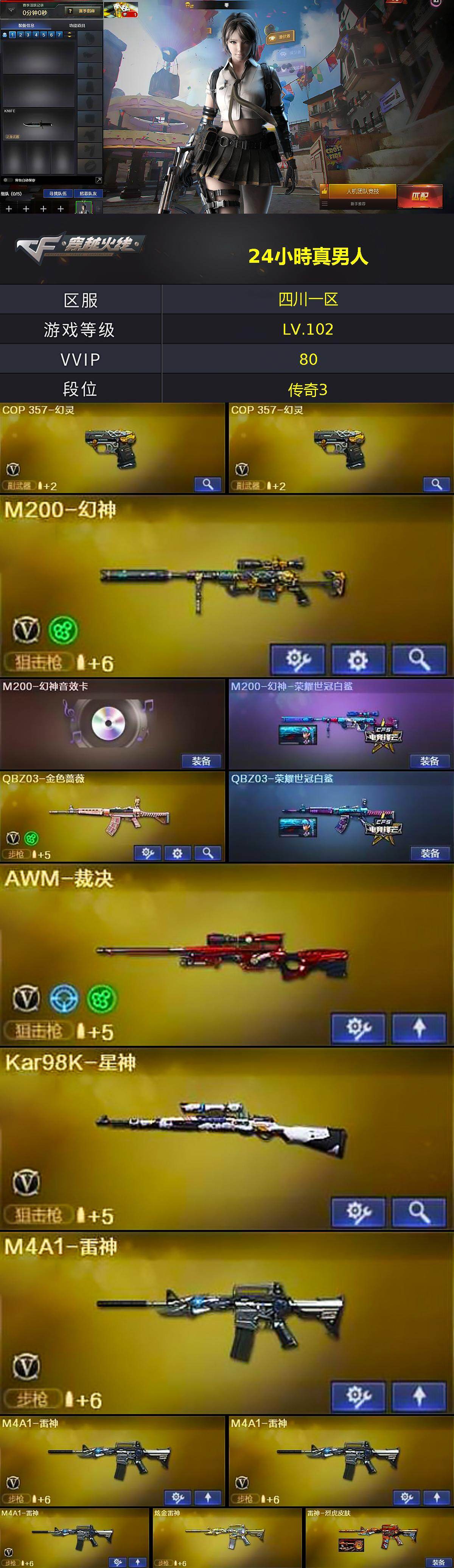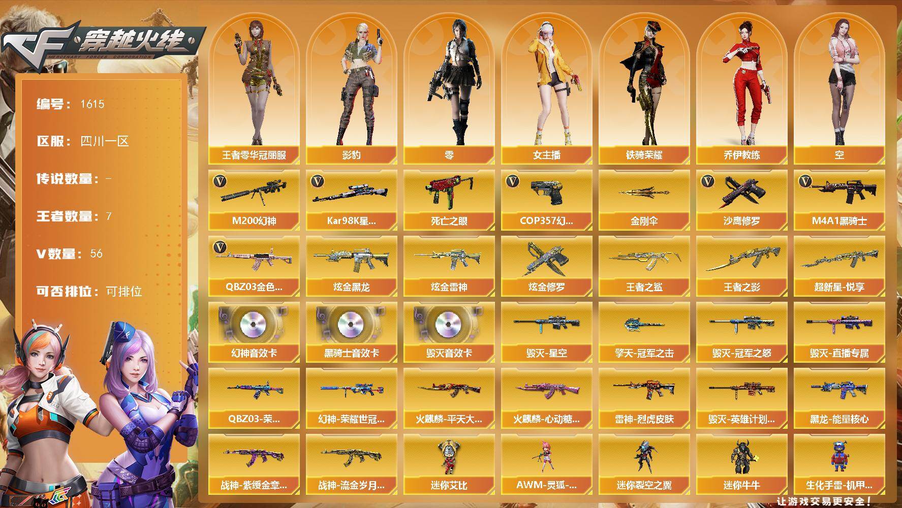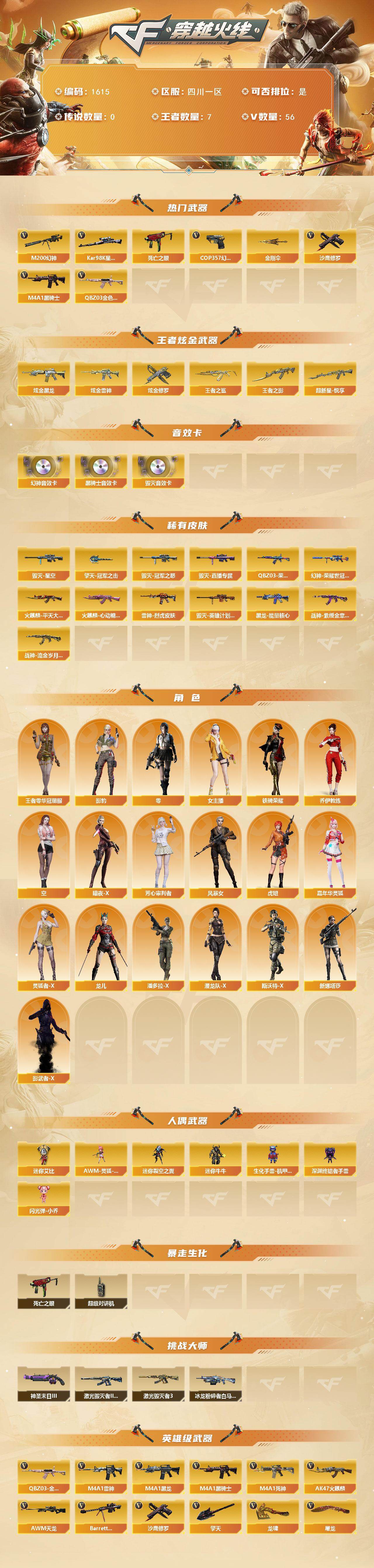 [15661673]四川一区-56V-7王者-3炫金 【热门武器】:QBZ03-金色蔷薇,M200-幻神,死亡之眼,Kar98K-星神,M4A1-黑骑士,COP 357-幻灵*2,沙鹰-修罗*3,金刚伞 【王者炫金武器】:王者之鲨,超新星-悦享,王者之影,炫金黑龙,炫金雷神,炫金修罗 【音效卡】:M200-幻神音效卡,M4A1-黑骑士音效卡,Barrett-毁灭音效卡 【皮肤】:M200-幻神-荣耀世冠白鲨,QBZ03-荣耀世冠白鲨,雷神-烈虎皮肤,火麒麟-平天大圣,火麒麟-心动糖果,毁灭-星空,毁灭-冠军之怒,毁灭-直播专属,毁灭-英雄计划 皮肤,黑龙-能量核心,战神-紫绶金章皮肤,战神-流金岁月皮肤,擎天-冠军之击 【角色】:零,影豹,王者零-华冠丽服,乔伊教练,空,暗夜-X,芳心审判者,风暴女,虎妞,嘉年华灵狐,灵狐者-X,龙儿,女主播,潘多拉-X,潜龙队-X,斯沃特-X,铁骑荣耀,新娜塔莎,影武者-X 【人偶武器】:AWM-灵狐-15周年嘉年华,迷你裂空之翼,迷你牛牛,生化手雷-机甲核心*2,深渊终结者手雷,闪光弹-小乔*2,迷你艾比 【暴走生化】:死亡之眼,超级对讲机 【挑战大师】:冰龙粉碎者-白马银枪,激光毁灭者III-白马银枪,激光毁灭者III,神圣爆裂者-末日III 【英雄级武器】:AK47-火麒麟,M4A1-黑龙,M4A1-雷神*4,M4A1-黑骑士,M4A1-死神,M4A1-幻灵,QBZ03-天罚,QBZ03-金色蔷薇,烈火-动感闪耀,王者之心-觉醒版,超新星-悦享-觉醒版,AK-47-猩红传说*3,AK47-B-战神,AWM-天龙,Barrett-毁灭,AWM-裁决,M200-幻神,Kar98K-星神,王者之怒-觉醒版,沙鹰-修罗*3,COP 357-幻灵*2,天神-动感闪耀,屠龙*2,龙啸,擎天,幻灵之锋,屠龙-动感闪耀,斩神刀-雷暴,王者之锋-觉醒版,高爆手雷-雷暴,高爆手雷-幻灵*4,手雷-动感闪耀,闪光弹-雷暴,闪光弹-幻灵*5,烟雾弹-雷暴,烟雾弹-幻灵*5 【道具】:炫彩背包,超级背包,绿色巨人,灵魂忍者,变异宝贝,迷雾幽灵,生化弹匣,夺命之镰*2,防化服*3,金色流光-枪王排位*2,星辰流光-枪王排位,巅峰赛先锋-金色流光,枪王排位28赛季金色流光,枪王排位29赛季金色流光,动感闪耀表情,防弹头盔*6,防弹衣*6,C4工具钳*5,手雷包*4 【特殊