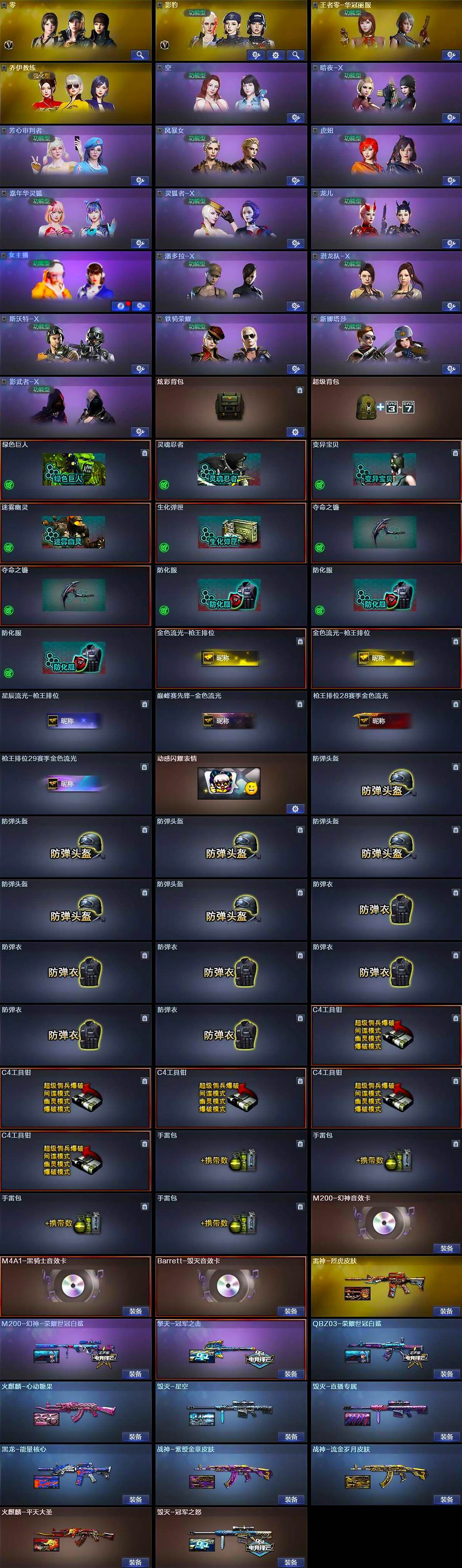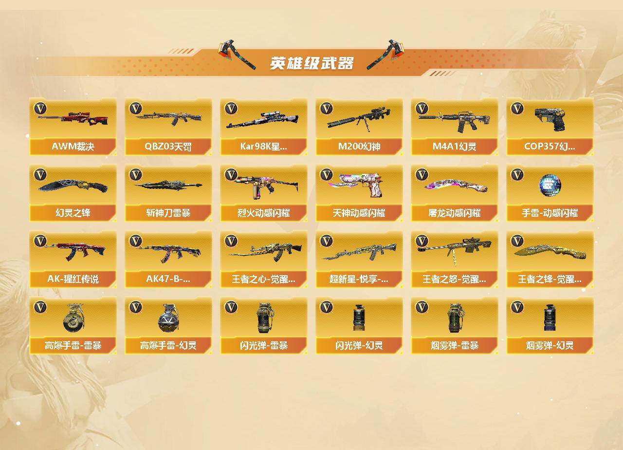 【英雄级武器】:AK47-火麒麟,M4A1-黑龙,M4A1-雷神*4,M4A1-黑骑士,M4A1-死神,M4A1-幻灵,QBZ03-天罚,QBZ03-金色蔷薇,烈火-动感闪耀,王者之心-觉醒版,超新星-悦享-觉醒版,AK-47-猩红传说*3,AK47-B-战神,AWM-天龙,Barrett-毁灭,AWM-裁决,M200-幻神,Kar98K-星神,王者之怒-觉醒版,沙鹰-修罗*3,COP 357-幻灵*2,天神-动感闪耀,屠龙*2,龙啸,擎天,幻灵之锋,屠龙-动感闪耀,斩神刀-雷暴,王者之锋-觉醒版,高爆手雷-雷暴,高爆手雷-幻灵*4,手雷-动感闪耀,闪光弹-雷暴,闪光弹-幻灵*5,烟雾弹-雷暴,烟雾弹-幻灵*5