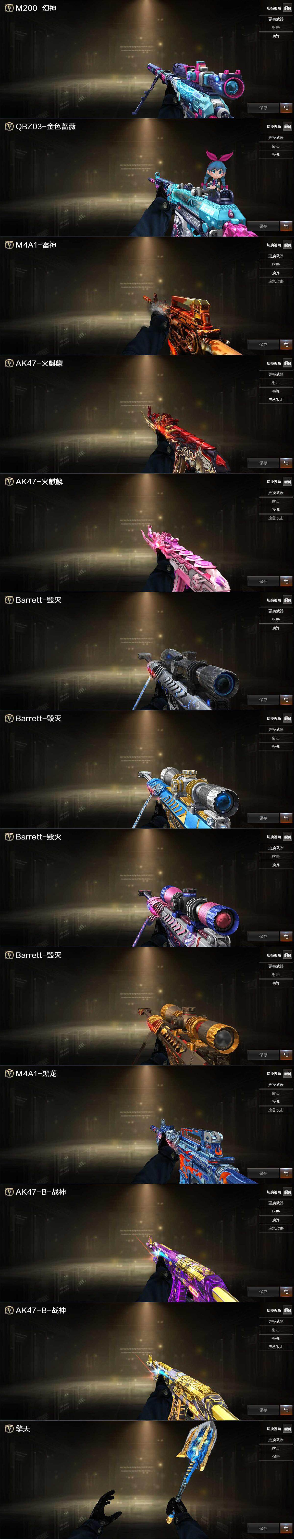 【皮肤】:M200-幻神-荣耀世冠白鲨,QBZ03-荣耀世冠白鲨,雷神-烈虎皮肤,火麒麟-平天大圣,火麒麟-心动糖果,毁灭-星空,毁灭-冠军之怒,毁灭-直播专属,毁灭-英雄计划 皮肤,黑龙-能量核心,战神-紫绶金章皮肤,战神-流金岁月皮肤,擎天-冠军之击