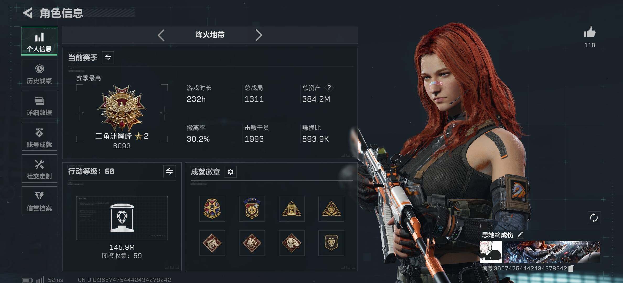 [15662681]【特价出售/店主推荐】384m总资产-543k哈伏币-60烽火等级-三角洲巅峰-21战场等级-上等兵