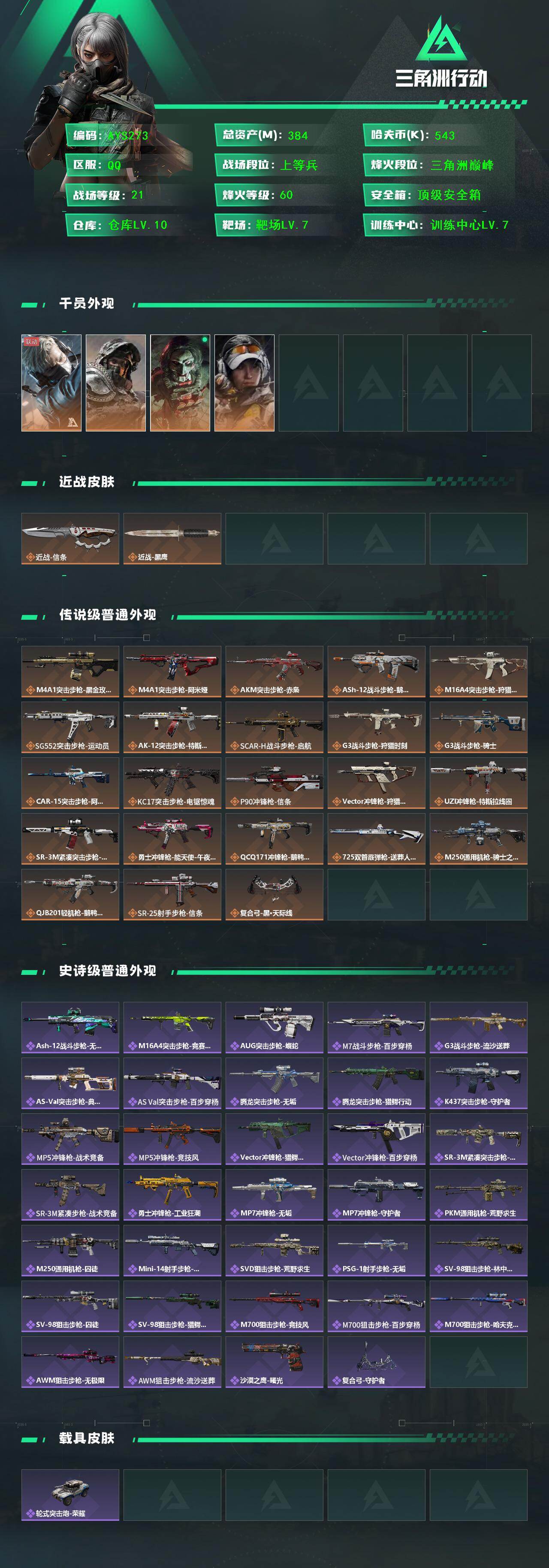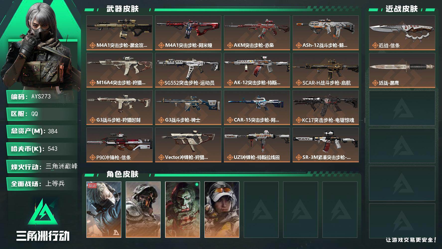 [15662681]【特价出售/店主推荐】384m总资产-543k哈伏币-60烽火等级-三角洲巅峰-21战场等级-上等兵 【干员外观】:蜂医-送葬人·无题密令,深蓝-不破誓约,红狼-电锯惊魂,露娜-金牌射手 【近战皮肤】:近战-信条,近战-黑鹰 【传说外观】:M4A1突击步枪-蚀金玫瑰,M4A1突击步枪-阿米娅,AKM突击步枪-赤枭,ASh-12战斗步枪-鹅鸭杀,M16A4突击步枪-狩猎时刻,SG552突击步枪-运动员,AK-12突击步枪-特斯拉线圈,SCAR-H战斗步枪-启航,G3战斗步枪-狩猎时刻,G3战斗步枪-骑士,CAR-15突击步枪-阿米娅,KC17突击步枪-电锯惊魂,P90冲锋枪-信条,Vector冲锋枪-狩猎时刻,UZI冲锋枪-特斯拉线圈,SR-3M紧凑突击步枪-特斯拉线圈,勇士冲锋枪-能天使-午夜邮差,QCQ171冲锋枪-鹅鸭杀,725双管霰弹枪-送葬人-无题密令,M250通用机枪-骑士之心,QJB201轻机枪-鹅鸭杀,SR-25射手步枪-信条,复合弓-黑·天际线 【史诗外观】:ASh-12战斗步枪-无极限,M16A4突击步枪-竞赛选手,AUG突击步枪-蝮蛇,M7战斗步枪-百步穿杨,G3战斗步枪-流沙送葬,AS Val突击步枪-典狱官,AS Val突击步枪-百步穿杨,腾龙突击步枪-无垢,腾龙突击步枪-猎鳄行动,K437突击步枪-守护者,MP5冲锋枪-战术竞备,MP5冲锋枪-竞技风,Vector冲锋枪-猎鳄行动,Vector冲锋枪-百步穿杨,SR-3M紧凑突击步枪-荒野求生,SR-3M紧凑突击步枪-战术竞备,勇士冲锋枪-工业狂潮,MP7冲锋枪-无垢,MP7冲锋枪-守护者,PKM通用机枪-荒野求生,M250通用机枪-囚徒,Mini-14射手步枪-守护者,SVD狙击步枪-荒野求生,PSG-1射手步枪-无垢,SV-98狙击步枪-林中猎手,SV-98狙击步枪-囚徒,SV-98狙击步枪-猎鳄行动,M700狙击步枪-竞技风,M700狙击步枪-百步穿杨,M700狙击步枪-哈夫克警备,AWM狙击步枪-无极限,AWM狙击步枪-流沙送葬,沙漠之鹰-曙光,复合弓-守护者 【稀有外观】:M4A1突击步枪-前沿科技,M4A1突击步枪-繁盛,AKM突击步枪-前沿科技,AKM突击步枪-战术演练,AKM突击步枪-肃杀,QBZ95-1突击步枪-公平竞技,ASh-12战斗步枪-繁盛,K416突击步枪-虎啸