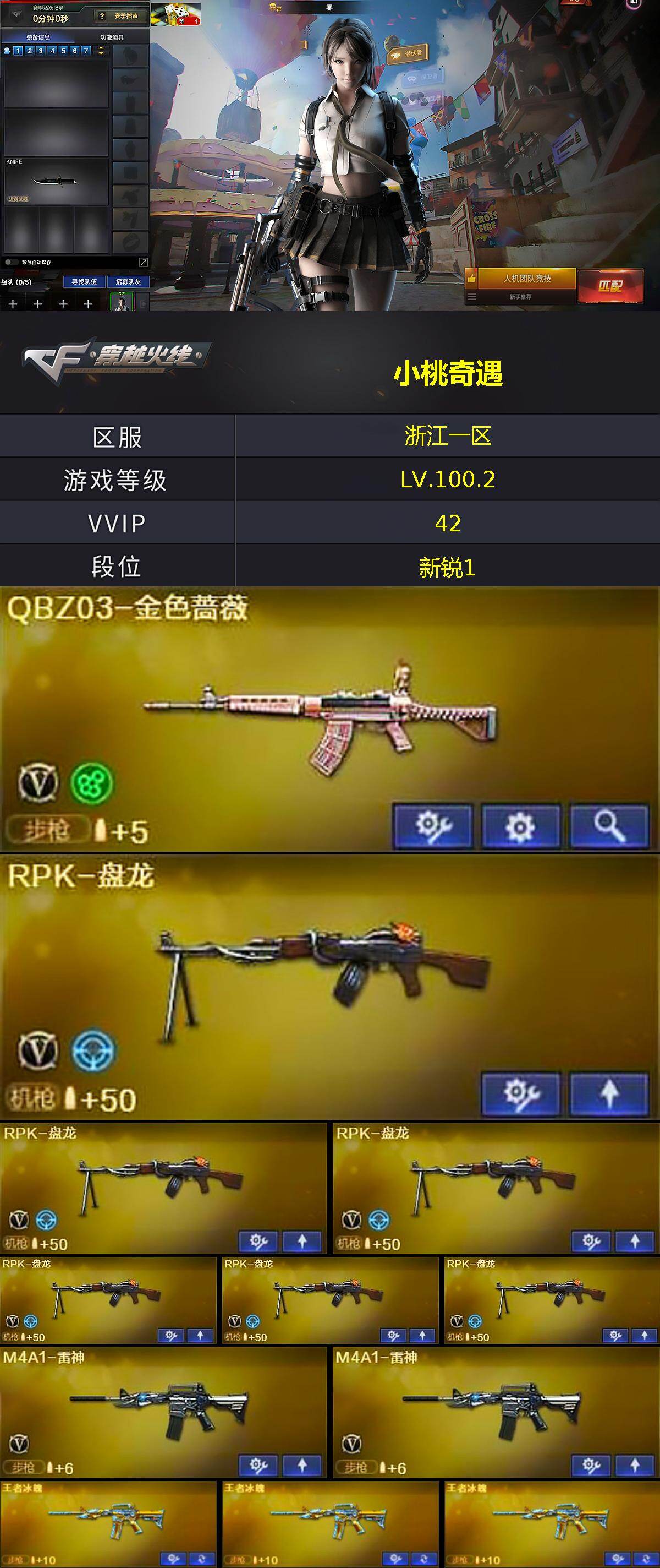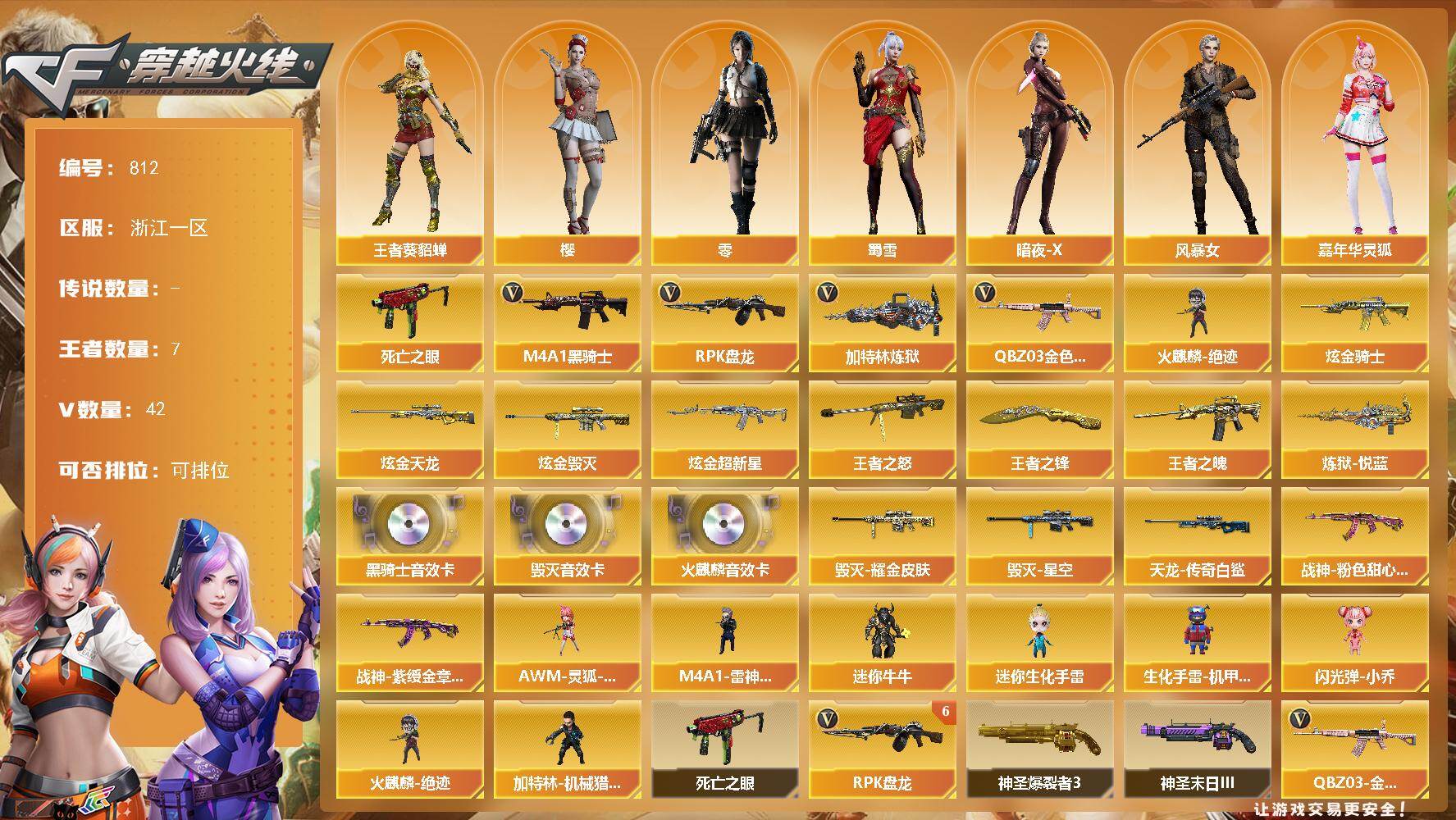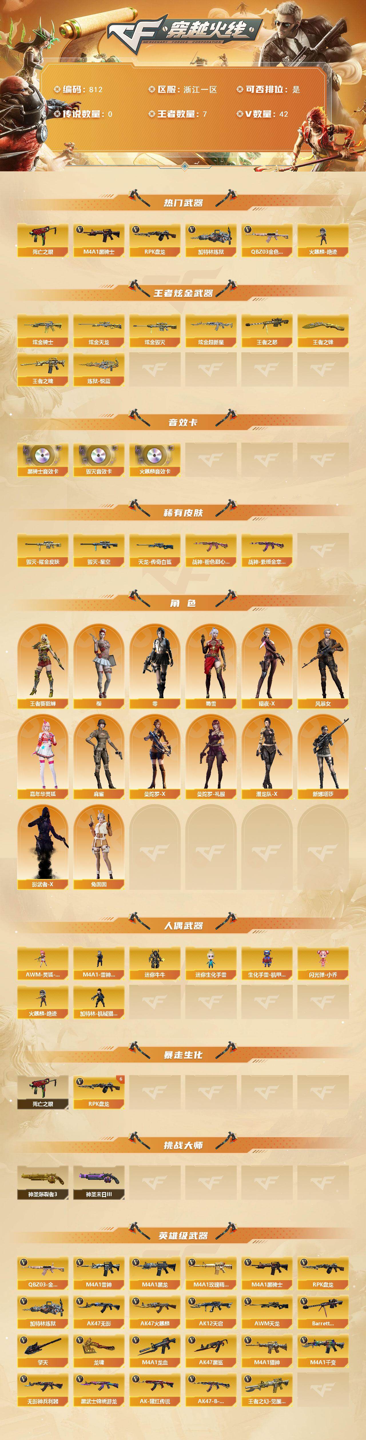 [15663854]浙江一区-42V-7王者-4炫金 【热门武器】:QBZ03-金色蔷薇,死亡之眼,M4A1-黑骑士,RPK-盘龙*6,加特林-炼狱,火麒麟-绝迹 【王者炫金武器】:王者之魄*3,王者之怒,炼狱-悦蓝,王者之锋,炫金骑士,炫金超新星,炫金毁灭,炫金天龙 【音效卡】:AK47-火麒麟音效卡*2,M4A1-黑骑士音效卡,Barrett-毁灭音效卡 【皮肤】:毁灭耀金皮肤,毁灭-星空,战神-粉色甜心皮肤*2,战神-紫绶金章皮肤*2,AWM-天龙-传奇白鲨 【角色】:零,樱,王者-葵-貂蝉,暗夜-X,风暴女,嘉年华灵狐,麻雀,曼陀罗-X,曼陀罗-礼服,潜龙队-X,蜀雪,兔囡囡,新娜塔莎,影武者-X 【人偶武器】:火麒麟-绝迹,M4A1-雷神-精英刀锋,加特林-机械猎手,AWM-灵狐-15周年嘉年华,迷你牛牛,迷你生化手雷,生化手雷-机甲核心,闪光弹-小乔 【暴走生化】:死亡之眼 【挑战大师】:神圣爆裂者III,神圣爆裂者-末日III 【英雄级武器】:M4A1-千变,AK47-火麒麟*3,M4A1-黑龙*3,M4A1-雷神*2,M4A1-黑骑士,AK47-无影,AK12-天启,AK47-黑鲨*4,M4A1-龙血,无影-神兵利器,黑武士-锦绣游龙,M4A1-玫瑰精灵,QBZ03-金色蔷薇,M4A1-猎神,王者之幻-觉醒版,AK-47-猩红传说*2,AK47-B-战神,AWM-天龙,Barrett-毁灭,RPK-盘龙*6,加特林-炼狱,龙啸,擎天*2 【道具】:亚洲杯纪念炫彩背包,冰冰企鹅背包,超级背包,救世主-黑桃战神,绿色巨人,灵魂忍者,变异宝贝,迷雾幽灵,生化弹匣,夺命之镰,防化服*2,金色流光-枪王排位*2,星辰流光-枪王排位,枪王排位28赛季金色流光,防弹头盔*7,防弹衣*6,C4工具钳*3,手雷包*4 【特殊枪械】:1黑骑士,6盘龙,1炼狱
