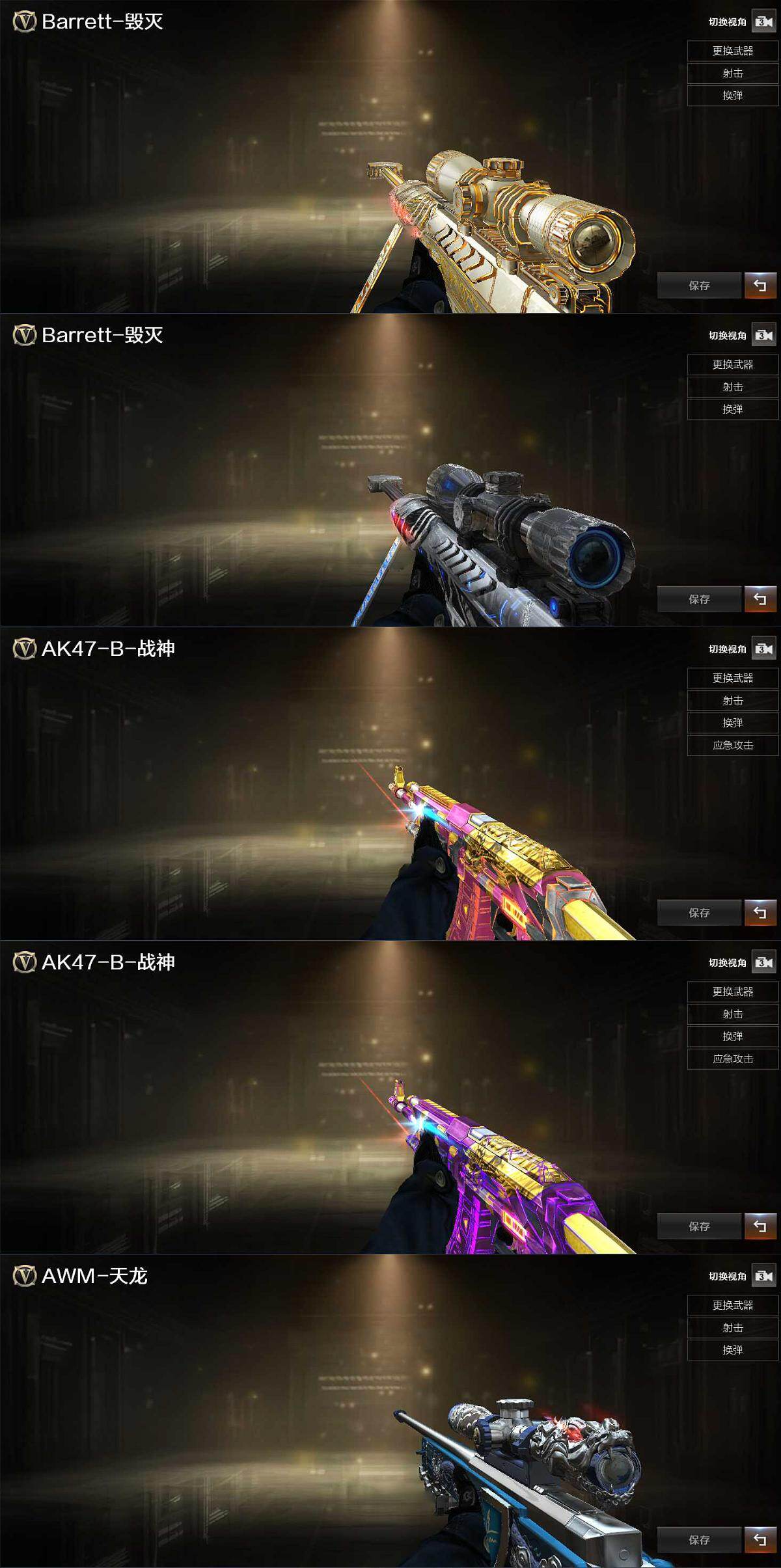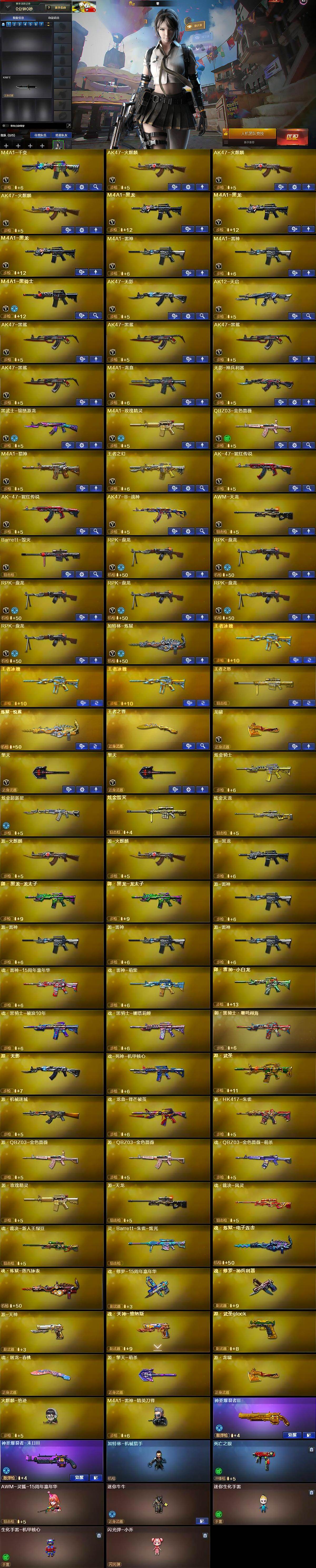 【英雄级武器】:M4A1-千变,AK47-火麒麟*3,M4A1-黑龙*3,M4A1-雷神*2,M4A1-黑骑士,AK47-无影,AK12-天启,AK47-黑鲨*4,M4A1-龙血,无影-神兵利器,黑武士-锦绣游龙,M4A1-玫瑰精灵,QBZ03-金色蔷薇,M4A1-猎神,王者之幻-觉醒版,AK-47-猩红传说*2,AK47-B-战神,AWM-天龙,Barrett-毁灭,RPK-盘龙*6,加特林-炼狱,龙啸,擎天*2