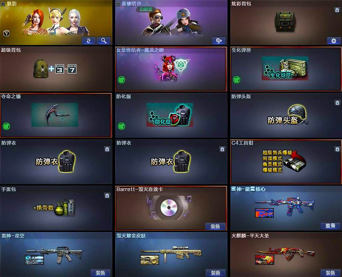 【道具】:炫彩背包,超级背包,女皇终结者-魔龙之吻,生化弹匣,夺命之镰,防化服,防弹头盔,防弹衣*2,C4工具钳,手雷包
