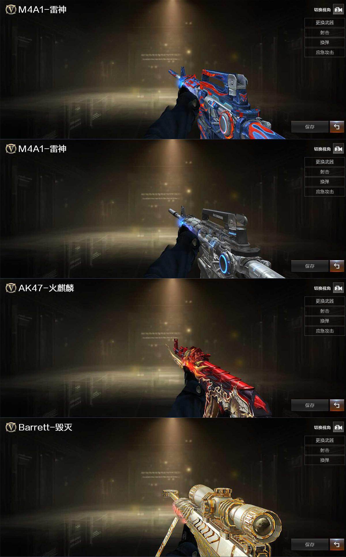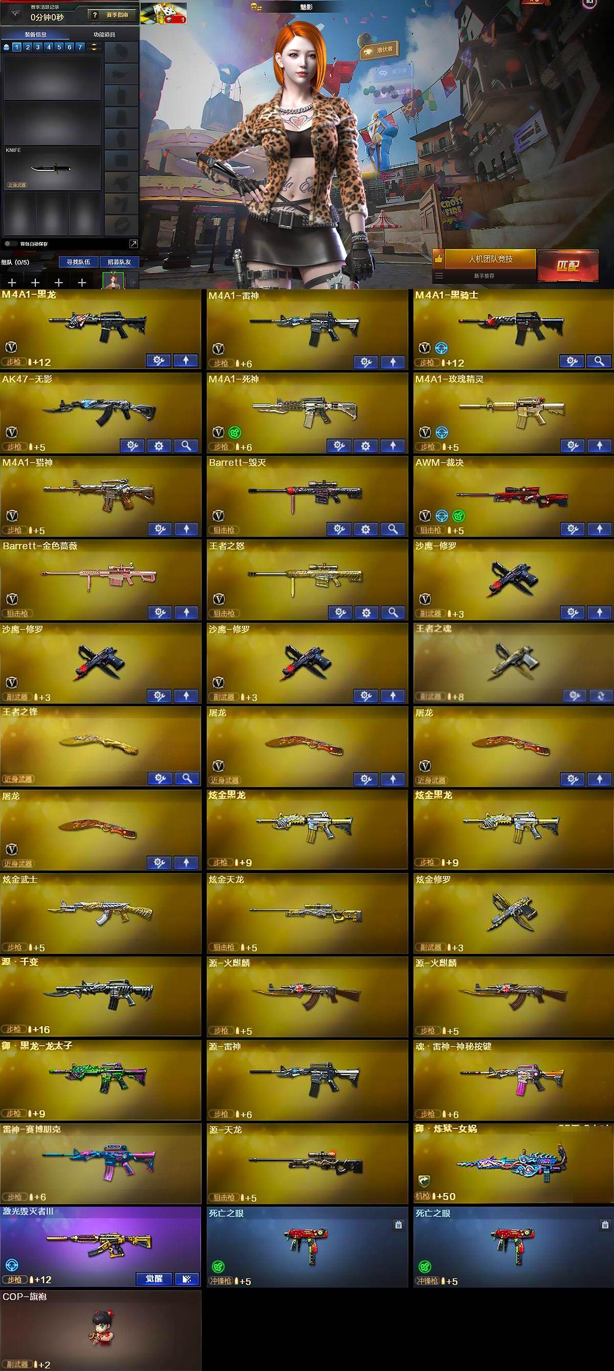 【英雄级武器】:M4A1-黑龙,M4A1-雷神,M4A1-黑骑士,AK47-无影,M4A1-死神,M4A1-玫瑰精灵,M4A1-猎神,Barrett-毁灭,AWM-裁决,Barrett-金色蔷薇,王者之怒-觉醒版,沙鹰-修罗*3,屠龙*3