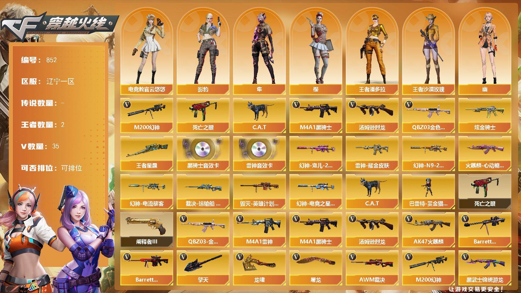 [15664944]辽宁一区-35V-2王者-1炫金 【热门武器】:QBZ03-金色蔷薇,M200-幻神,死亡之眼*2,C.A.T,M4A1-黑骑士,汤姆逊-烈龙 【王者炫金武器】:王者星霆,炫金骑士 【音效卡】:M4A1-雷神音效卡,M4A1-黑骑士音效卡 【皮肤】:幻神-宠儿-2021MVP,M200-幻神-N9-2022MVP,幻神-电流骇客 皮肤,幻神-电竞之星 皮肤,裁决-运输船 皮肤,雷神-耀金皮肤,火麒麟-心动糖果,毁灭-英雄计划 皮肤 【角色】:樱,影豹,电竞教官-云悠悠,隼,王者潘多拉,王者沙漠玫瑰,奇洋探员,暗夜-X,飞虎队-X,兰妹妹,灵狐者-黄金海岸,潘多拉-X,潘多拉-甜心教官,斯沃特-X,兔囡囡,维纳斯,幽,游珑儿 【人偶武器】:C.A.T,巴雷特-赏金猎人 【暴走生化】:死亡之眼*2 【挑战大师】:阐释者III 【英雄级武器】:AK47-火麒麟,M4A1-雷神,M4A1-黑骑士,QBZ03-云龙,黑武士-锦绣游龙,超新星-热带奇洋,QBZ03-金色蔷薇,Barrett-毁灭,Barrett-极光,AWM-裁决,M200-幻神,汤姆逊-烈龙,屠龙,龙啸,擎天,龙啸-热带奇洋,高爆手雷-幻灵*3,手雷-热带奇洋,闪光弹-雷霆,闪光弹-雷暴,闪光弹-幻灵*2,闪光弹-竞技荣光,闪光弹-云龙,烟雾弹-幻灵*2,烟雾弹-竞技荣光,烟雾弹-云龙 【道具】:BS战队炫彩背包,奇洋探员-海龟背包,热带奇洋炫彩背包,超级背包,女皇终结者-魔龙之吻,绿色巨人,灵魂忍者,迷雾幽灵,夺命之镰,防化服*3,金色流光-枪王排位,星辰流光-枪王排位,枪王排位28赛季金色流光,枪王排位29赛季金色流光,热带奇洋表情,防弹头盔*4,防弹衣*4,C4工具钳*4,手雷包*4 【特殊枪械】:1黑骑士,1烈龙