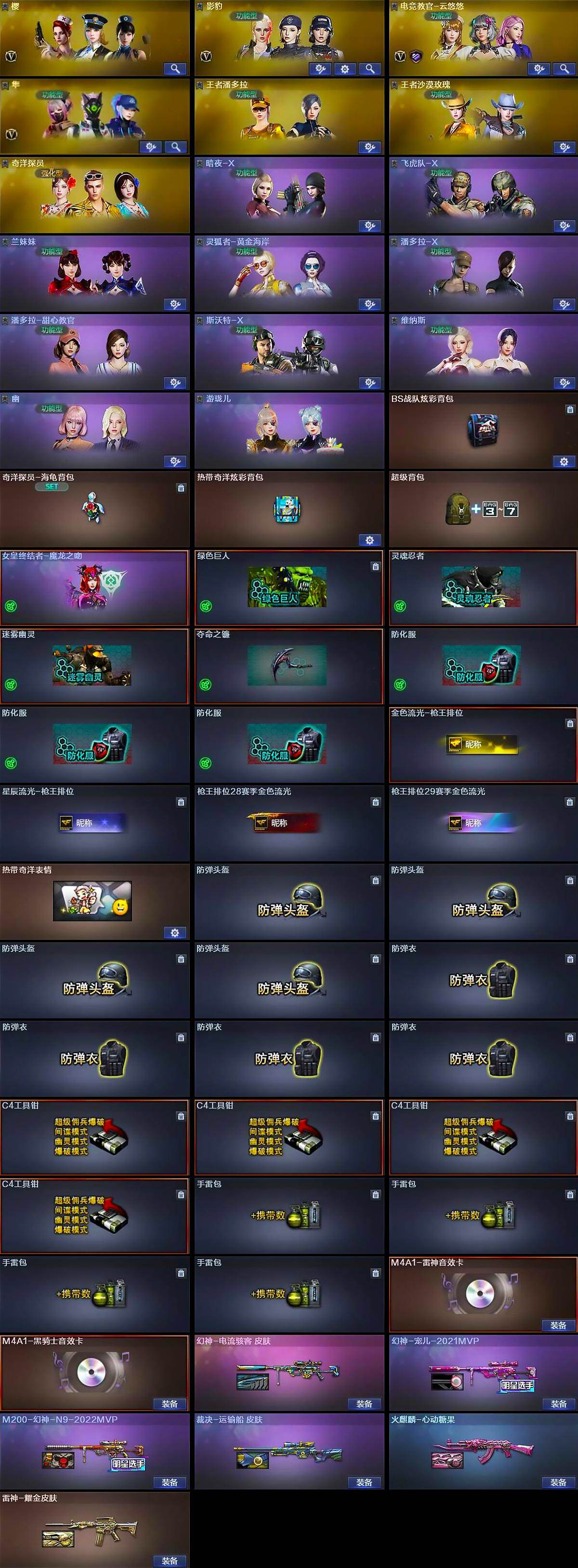 【道具】:BS战队炫彩背包,奇洋探员-海龟背包,热带奇洋炫彩背包,超级背包,女皇终结者-魔龙之吻,绿色巨人,灵魂忍者,迷雾幽灵,夺命之镰,防化服*3,金色流光-枪王排位,星辰流光-枪王排位,枪王排位28赛季金色流光,枪王排位29赛季金色流光,热带奇洋表情,防弹头盔*4,防弹衣*4,C4工具钳*4,手雷包*4