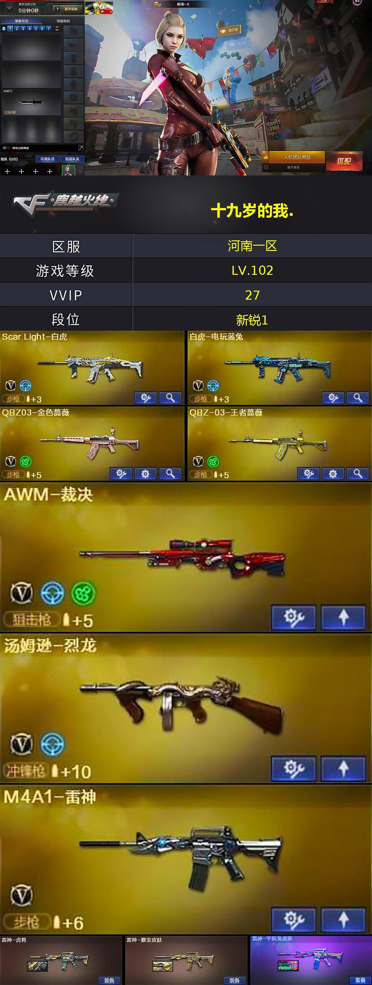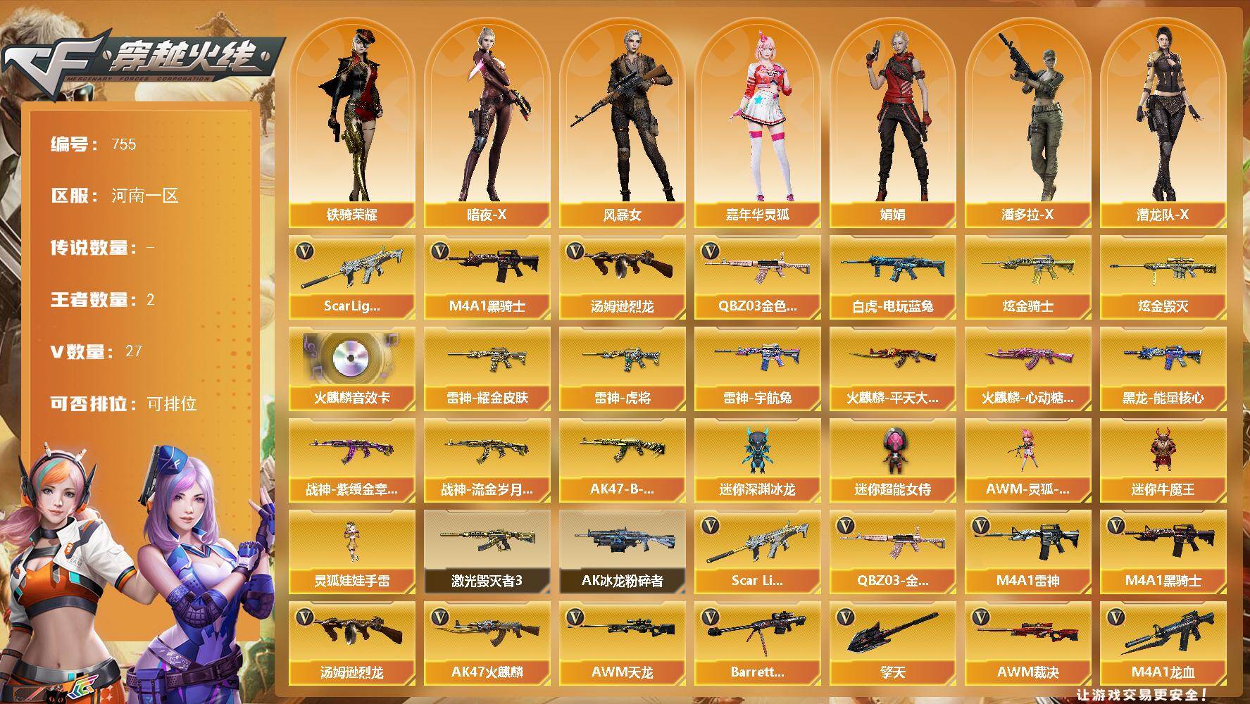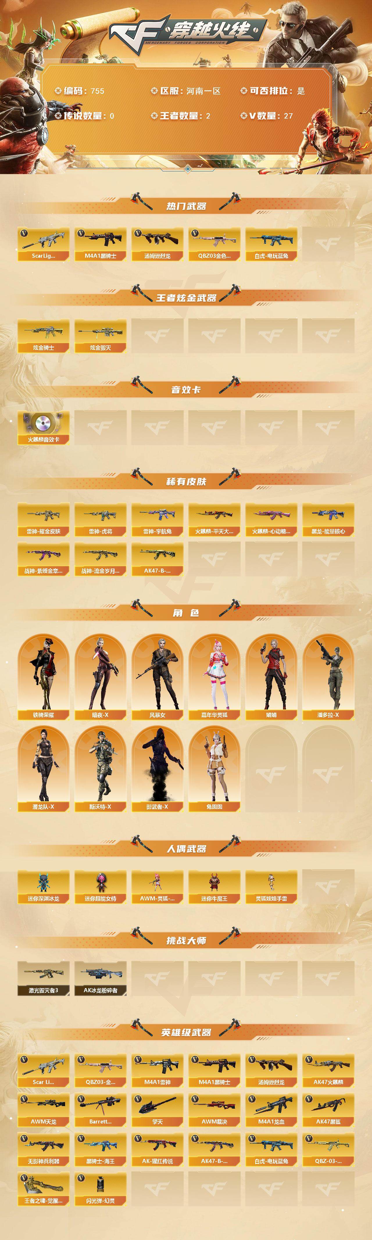 [15665084]河南一区-27V-2王者-2炫金 【热门武器】:QBZ03-金色蔷薇,Scar Light-白虎,白虎-电玩蓝兔,M4A1-黑骑士,汤姆逊-烈龙 【王者炫金武器】:炫金骑士,炫金毁灭 【音效卡】:AK47-火麒麟音效卡 【皮肤】:雷神-虎将,雷神-耀金皮肤,雷神-宇航兔皮肤,火麒麟-平天大圣,火麒麟-心动糖果,黑龙-能量核心,战神-紫绶金章皮肤,战神-流金岁月皮肤*2,AK47-B-常胜将军-孙权 【角色】:暗夜-X,风暴女,嘉年华灵狐,娟娟,潘多拉-X,潜龙队-X,斯沃特-X,铁骑荣耀,兔囡囡,影武者-X 【人偶武器】:AWM-灵狐-15周年嘉年华,迷你深渊冰龙*5,迷你牛魔王,迷你超能女侍,灵狐娃娃手雷 【挑战大师】:AK47-冰龙粉碎者,激光毁灭者III 【英雄级武器】:AK47-火麒麟*2,M4A1-雷神,M4A1-黑骑士,AK47-黑鲨*2,M4A1-龙血,Scar Light-白虎,无影-神兵利器,QBZ03-金色蔷薇,AK-47-猩红传说*3,AK47-B-战神*2,黑骑士-海王,QBZ-03-王者蔷薇-觉醒版,白虎-电玩蓝兔,AWM-天龙,Barrett-毁灭,AWM-裁决,汤姆逊-烈龙,擎天*2,王者之啸-觉醒版,闪光弹-幻灵 【道具】:XROCK炫彩背包,超级背包,绿色巨人,灵魂忍者,迷雾幽灵,夺命之镰,防化服*2,电玩兔兔表情,防弹头盔*3,防弹衣*5,C4工具钳*2,手雷包*2 【特殊枪械】:1白虎,1黑骑士,1烈龙
