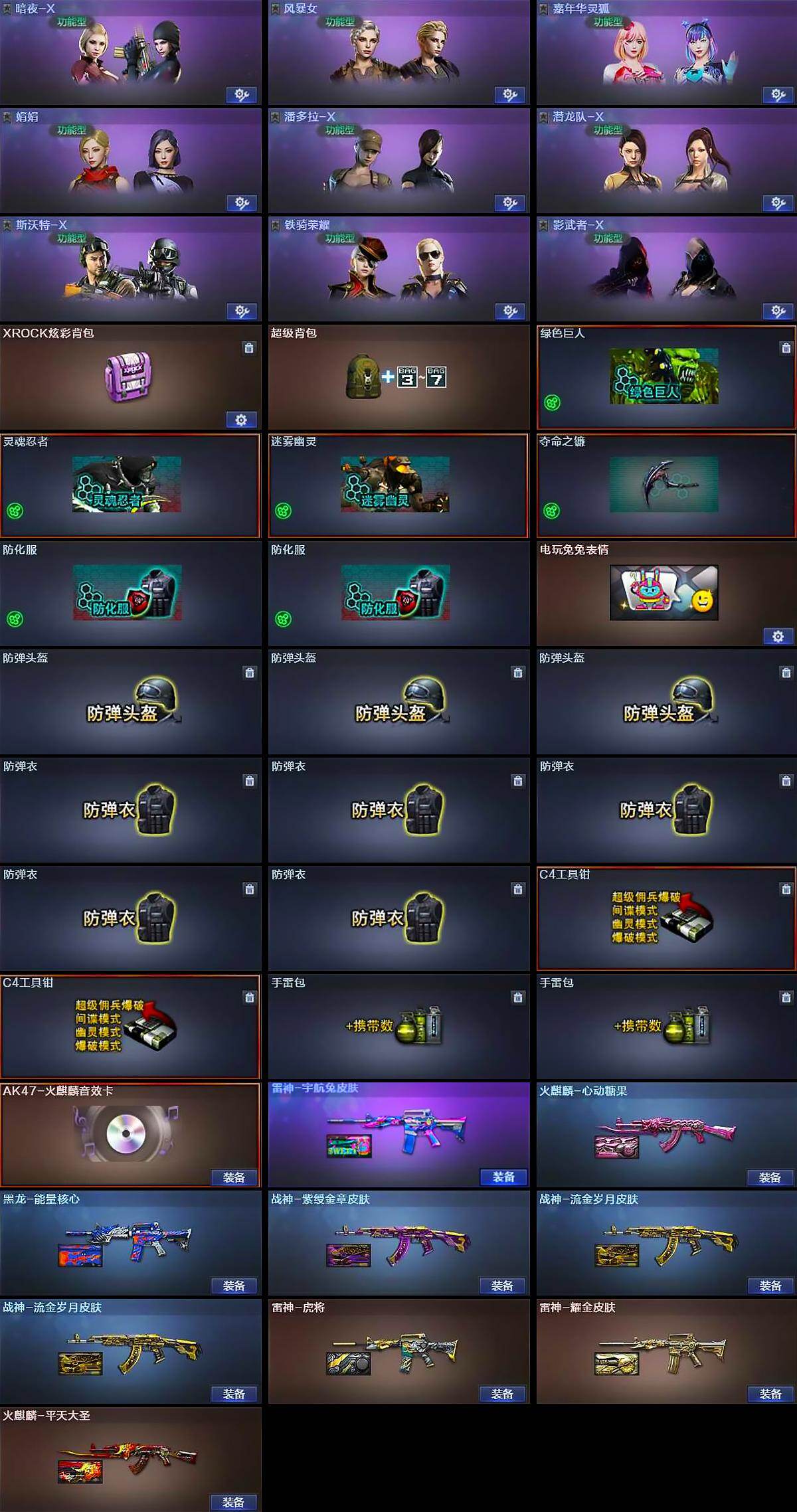【道具】:XROCK炫彩背包,超级背包,绿色巨人,灵魂忍者,迷雾幽灵,夺命之镰,防化服*2,电玩兔兔表情,防弹头盔*3,防弹衣*5,C4工具钳*2,手雷包*2