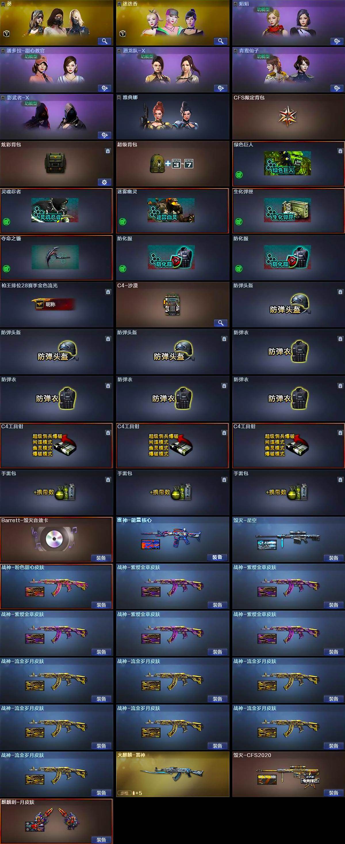 【道具】:CFS限定背包,炫彩背包,超级背包,绿色巨人,灵魂忍者,迷雾幽灵,生化弹匣,夺命之镰,防化服*2,枪王排位28赛季金色流光,C4-沙漠,防弹头盔*3,防弹衣*4,C4工具钳*3,手雷包*3