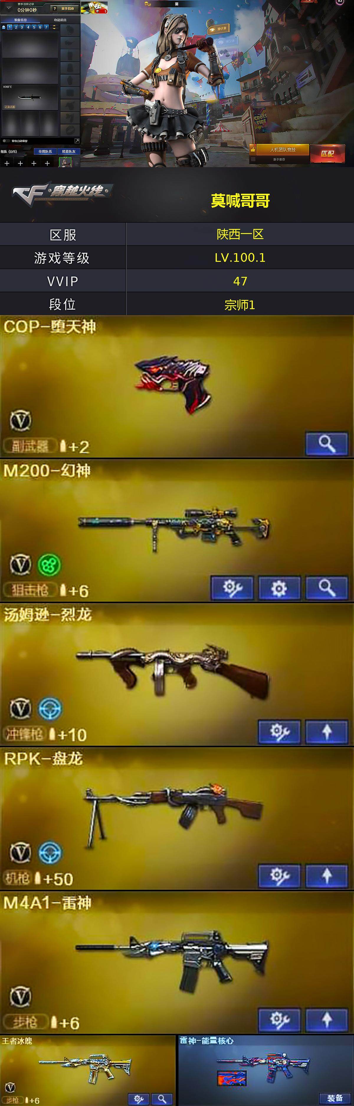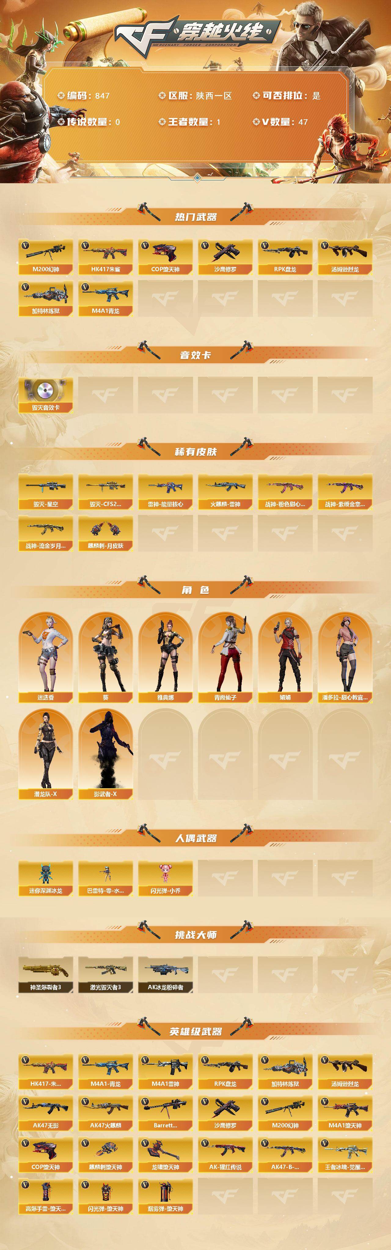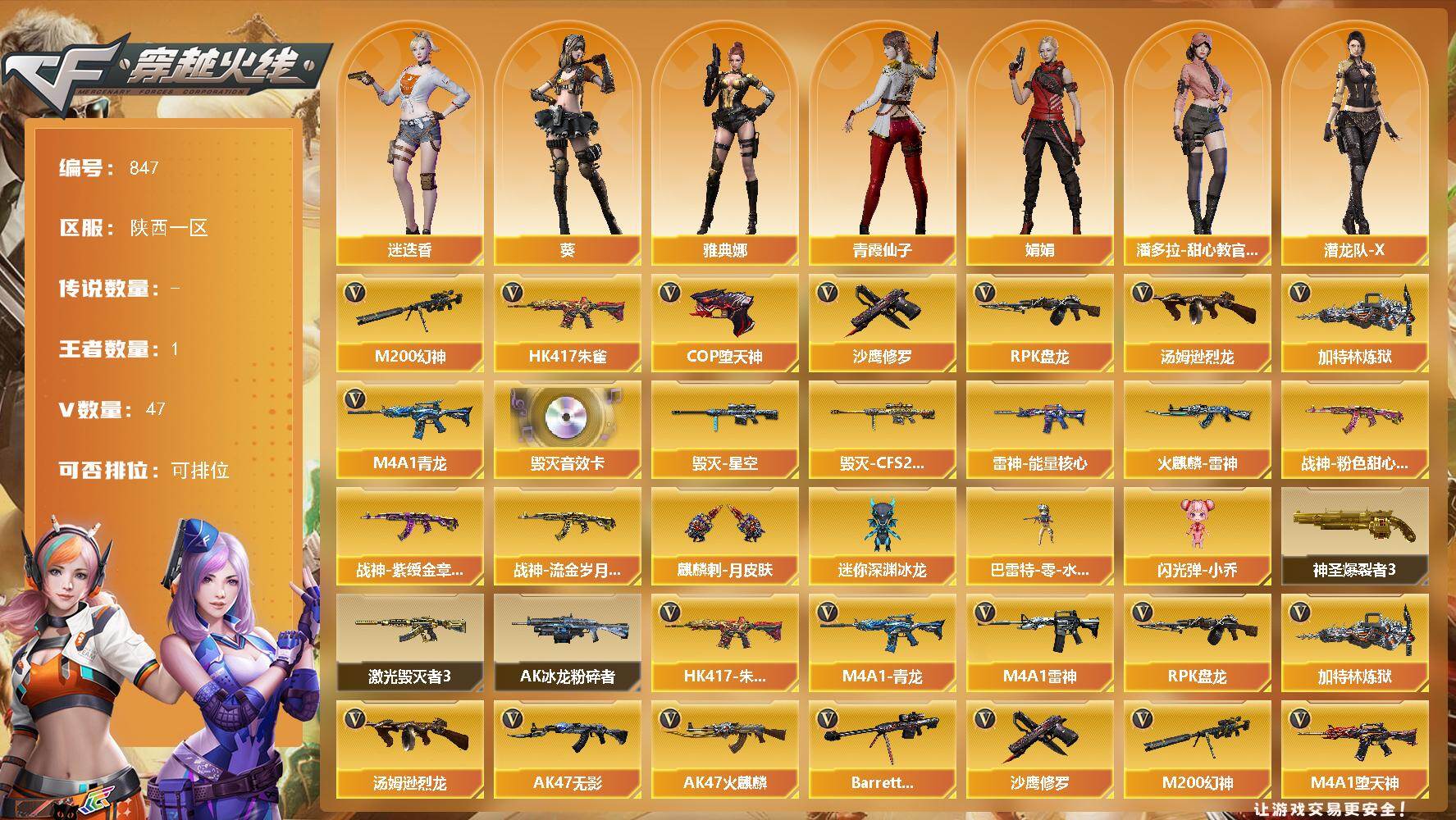 [15665425]陕西一区-47V-1王者-0炫金 【热门武器】:HK417-朱雀,M4A1-青龙,M200-幻神,汤姆逊-烈龙,RPK-盘龙,加特林-炼狱,COP-堕天神,沙鹰-修罗 【音效卡】:Barrett-毁灭音效卡 【皮肤】:雷神-能量核心,火麒麟-雷神,毁灭-星空,毁灭-CFS2020,战神-粉色甜心皮肤,战神-紫绶金章皮肤*5,战神-流金岁月皮肤*7,麒麟刺-月皮肤 【角色】:葵,迷迭香,娟娟,潘多拉-甜心教官,潜龙队-X,青霞仙子,影武者-X,雅典娜 【人偶武器】:巴雷特-零-水下丽影,迷你深渊冰龙*3,闪光弹-小乔 【挑战大师】:神圣爆裂者III,AK47-冰龙粉碎者,激光毁灭者III 【英雄级武器】:AK47-火麒麟,M4A1-雷神,AK47-无影,M4A1-青龙,M4A1-堕天神,HK417-朱雀,AK-47-猩红传说*7,AK47-B-战神,王者冰魄-觉醒版,Barrett-毁灭,M200-幻神,RPK-盘龙,加特林-炼狱,汤姆逊-烈龙,沙鹰-修罗,COP-堕天神,麒麟刺-堕天神,龙啸-堕天神,高爆手雷-堕天神*6,闪光弹-堕天神*6,烟雾弹-堕天神*6 【道具】:CFS限定背包,炫彩背包,超级背包,绿色巨人,灵魂忍者,迷雾幽灵,生化弹匣,夺命之镰,防化服*2,枪王排位28赛季金色流光,C4-沙漠,防弹头盔*3,防弹衣*4,C4工具钳*3,手雷包*3 【特殊枪械】:1烈龙,1盘龙,1炼狱