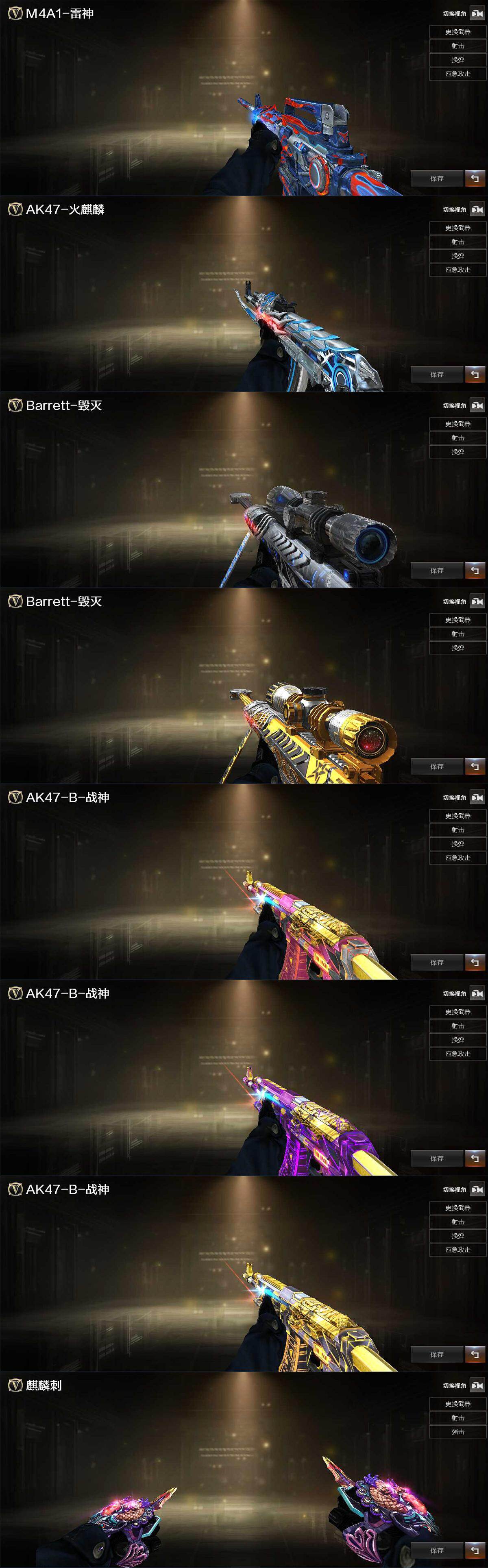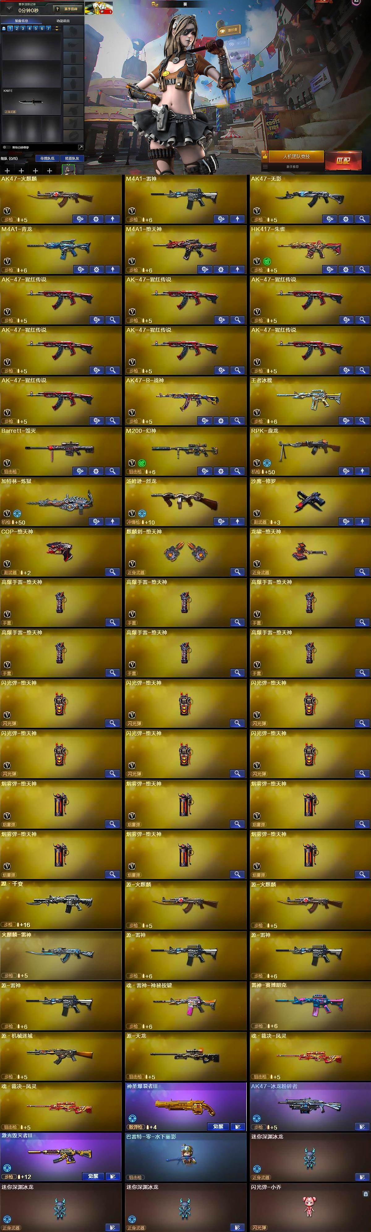【英雄级武器】:AK47-火麒麟,M4A1-雷神,AK47-无影,M4A1-青龙,M4A1-堕天神,HK417-朱雀,AK-47-猩红传说*7,AK47-B-战神,王者冰魄-觉醒版,Barrett-毁灭,M200-幻神,RPK-盘龙,加特林-炼狱,汤姆逊-烈龙,沙鹰-修罗,COP-堕天神,麒麟刺-堕天神,龙啸-堕天神,高爆手雷-堕天神*6,闪光弹-堕天神*6,烟雾弹-堕天神*6