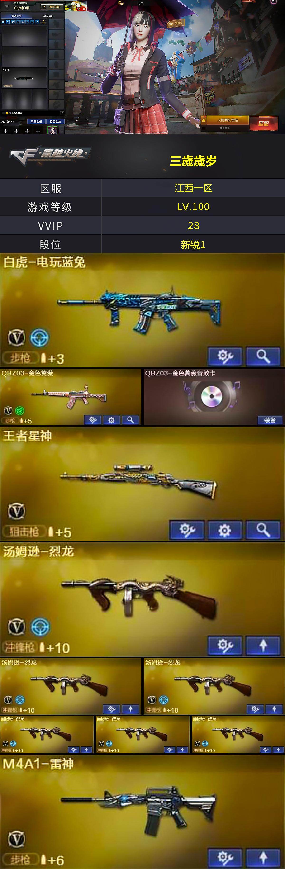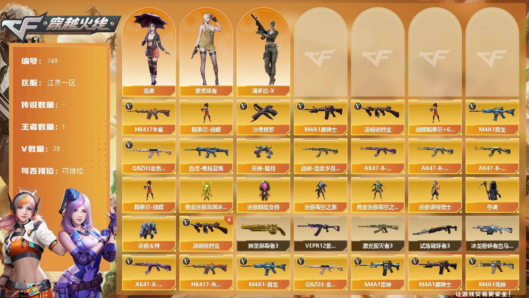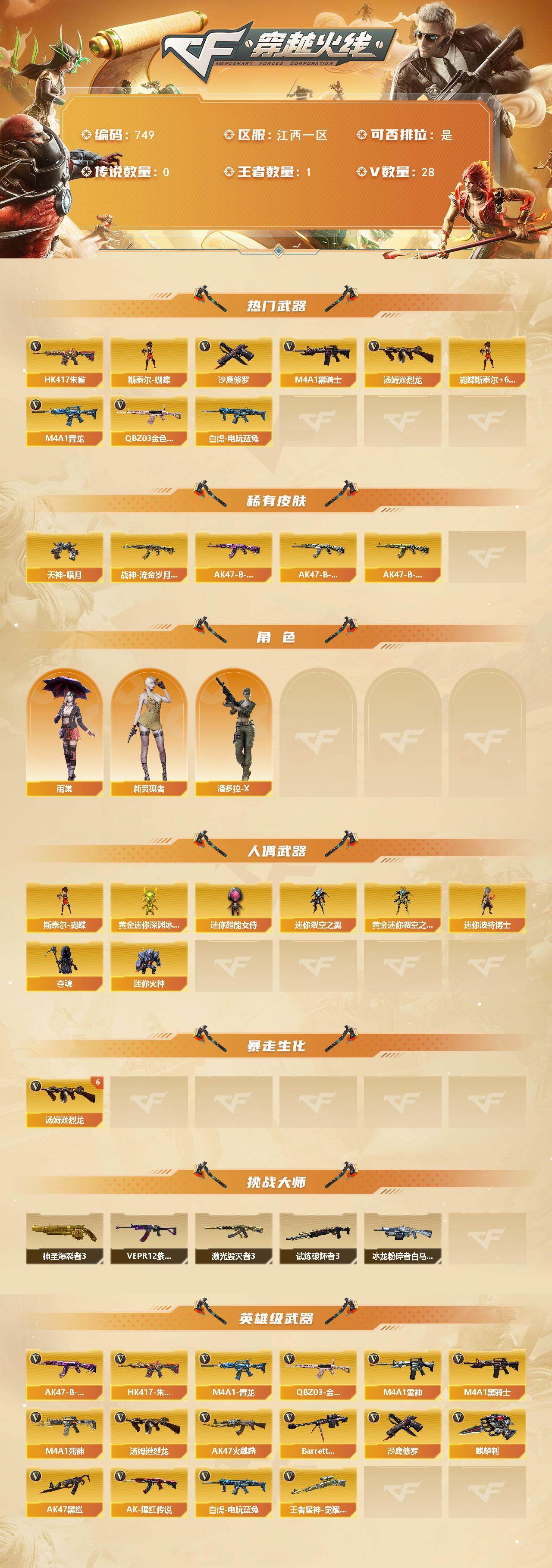 [15665478]江西一区-28V-1王者-0炫金 【热门武器】:QBZ03-金色蔷薇,HK417-朱雀,M4A1-青龙,白虎-电玩蓝兔,M4A1-黑骑士*4,汤姆逊-烈龙*6,斯泰尔-蝴蝶,沙鹰-修罗*4 【皮肤】:战神-流金岁月皮肤,AK47-B-常胜将军-曹操,AK47-B-常胜将军-刘备,AK47-B-常胜将军-孙权*2,天神-暗月 【角色】:雨棠,潘多拉-X,新灵狐者 【人偶武器】:斯泰尔-蝴蝶,黄金迷你深渊冰龙,迷你裂空之翼,黄金迷你裂空之翼,迷你波特博士,夺魂,迷你火种,迷你超能女侍 【挑战大师】:神圣爆裂者III,冰龙粉碎者-白马银枪,激光毁灭者III,试炼破坏者III,VEPR-12-紫魔 【英雄级武器】:AK47-火麒麟,M4A1-雷神,M4A1-黑骑士*4,M4A1-死神,AK47-黑鲨,M4A1-青龙,HK417-朱雀,QBZ03-金色蔷薇,AK-47-猩红传说,AK47-B-常胜将军,白虎-电玩蓝兔,Barrett-毁灭,王者星神-觉醒版,汤姆逊-烈龙*6,沙鹰-修罗*4,麒麟刺 【道具】:夺命之镰,防化服,星辰流光-枪王排位,电玩兔兔表情,防弹头盔*2,防弹衣*2,C4工具钳*2,手雷包*2 【特殊枪械】:蝴蝶斯泰尔+6烈龙,4黑骑士,6烈龙,1蝴蝶斯泰尔