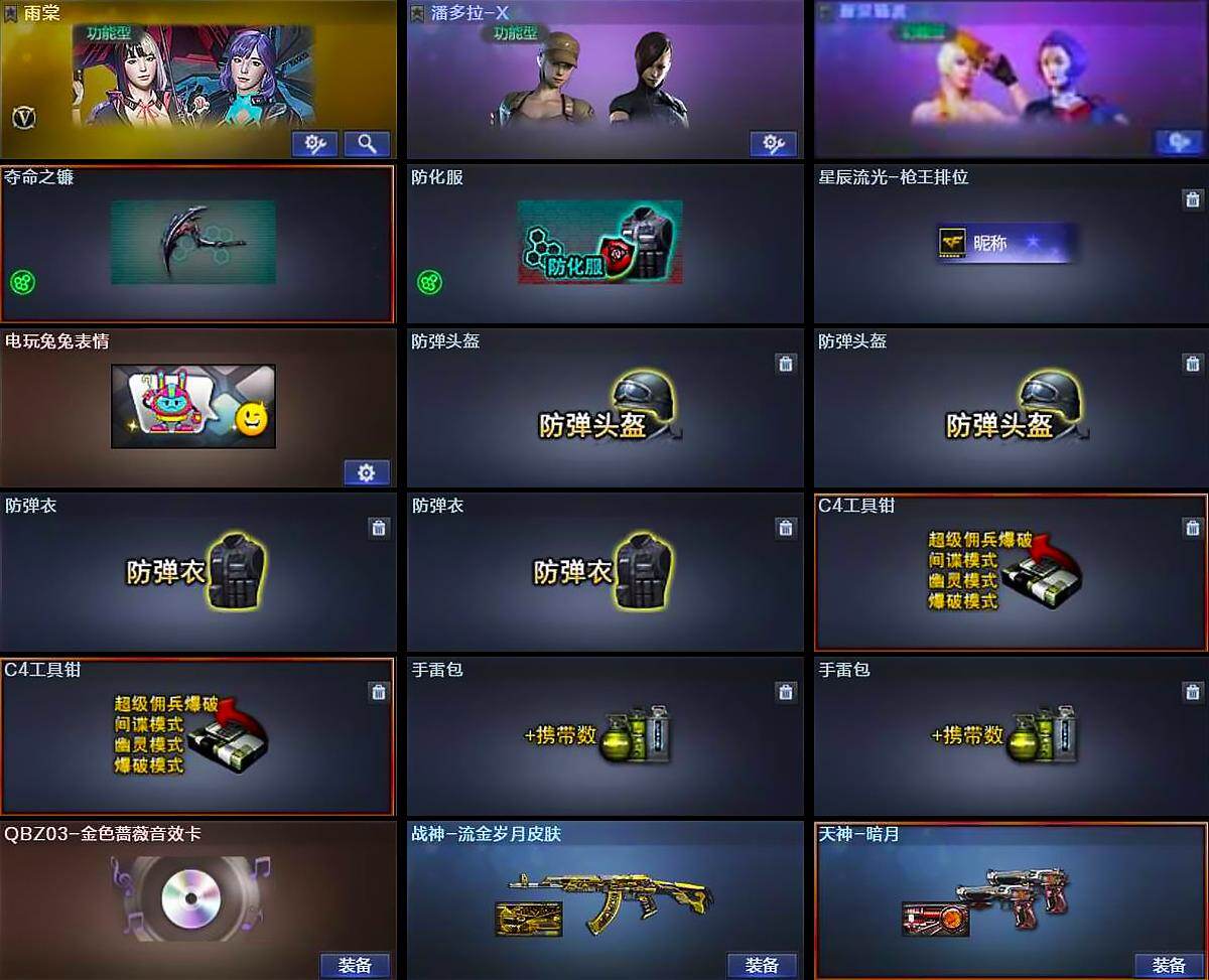 【道具】:夺命之镰,防化服,星辰流光-枪王排位,电玩兔兔表情,防弹头盔*2,防弹衣*2,C4工具钳*2,手雷包*2
