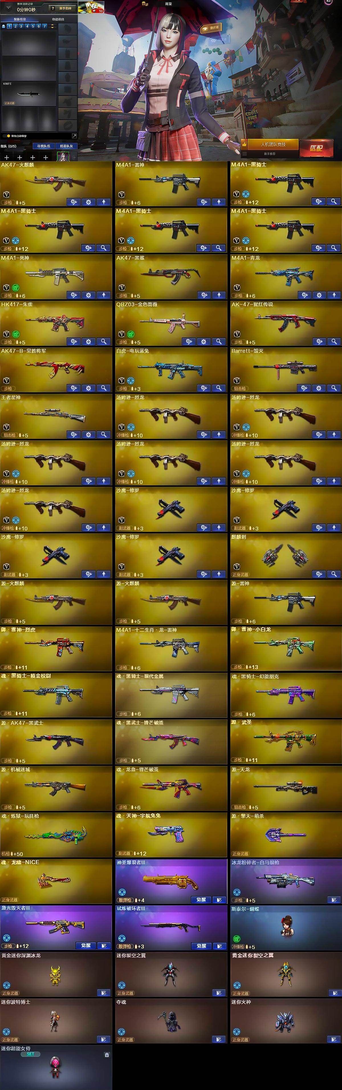 【英雄级武器】:AK47-火麒麟,M4A1-雷神,M4A1-黑骑士*4,M4A1-死神,AK47-黑鲨,M4A1-青龙,HK417-朱雀,QBZ03-金色蔷薇,AK-47-猩红传说,AK47-B-常胜将军,白虎-电玩蓝兔,Barrett-毁灭,王者星神-觉醒版,汤姆逊-烈龙*6,沙鹰-修罗*4,麒麟刺