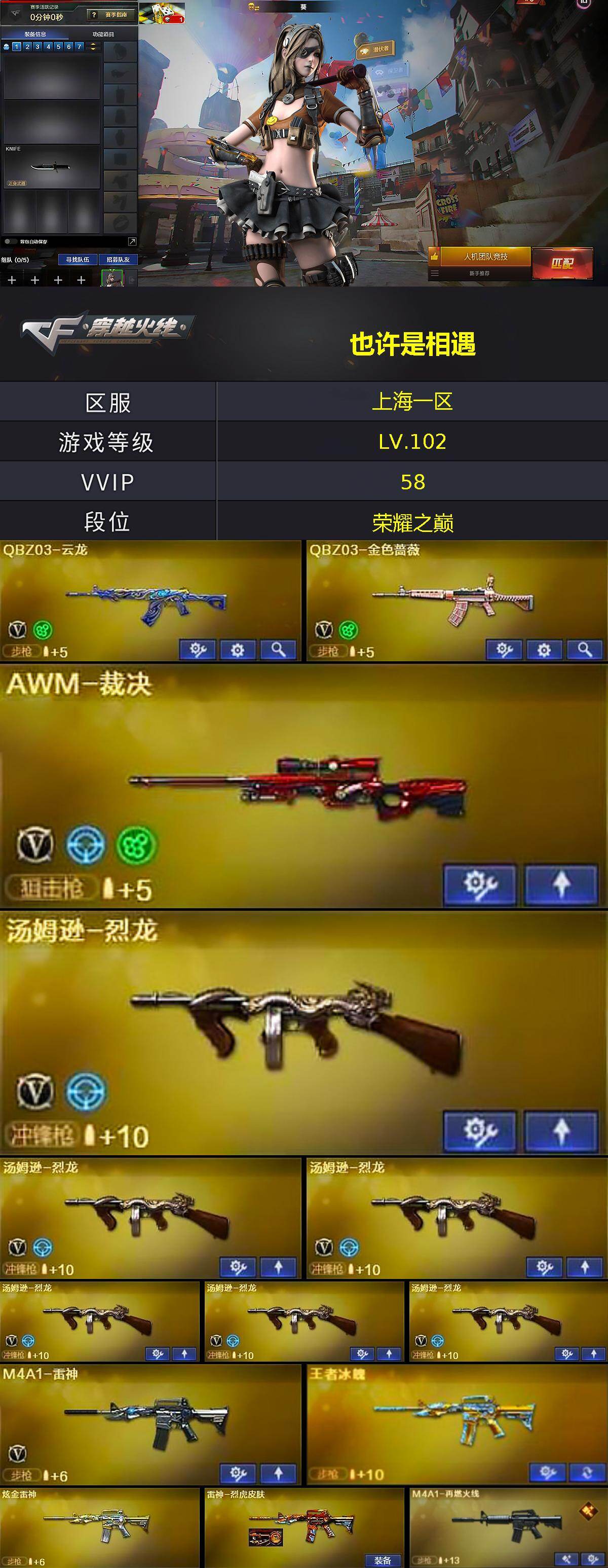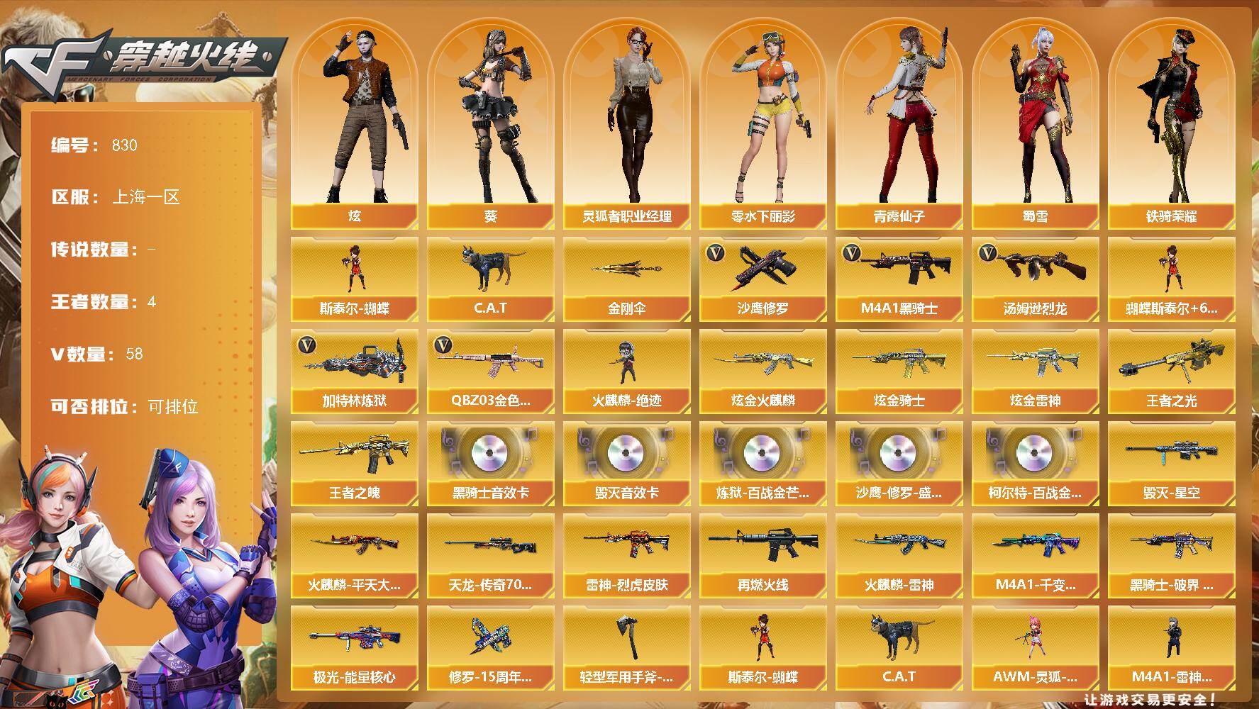 [15665765]上海一区-58V-4王者-3炫金 【热门武器】:QBZ03-金色蔷薇,C.A.T,M4A1-黑骑士,汤姆逊-烈龙*6,加特林-炼狱*2,斯泰尔-蝴蝶,火麒麟-绝迹,沙鹰-修罗*2,金刚伞 【王者炫金武器】:王者之魄,王者之光,炫金火麒麟,炫金骑士,炫金雷神 【音效卡】:M4A1-黑骑士音效卡,Barrett-毁灭音效卡,炼狱-百战金芒-庆典舞曲音效卡,沙鹰-修罗-盛典舞曲音效卡,柯尔特-百战金芒-庆典舞曲音效卡 【皮肤】:雷神-烈虎皮肤,M4A1-再燃火线,火麒麟-雷神,火麒麟-平天大圣,毁灭-星空,M4A1-千变-孔明皮肤,黑骑士-破界 皮肤,AWM-天龙-传奇70KG,极光-能量核心,修罗-15周年嘉年华 皮肤,轻型军用手斧-再燃火线 【角色】:葵,炫,暗夜-X,北极狐-X,飞虎队-X,风暴女,虎妞,嘉年华灵狐,娟娟,0号玩家,零-水下丽影,灵狐者-职业经理,龙儿,潘多拉-X,潘多拉-甜心教官,青霞仙子,斯沃特-X,蜀雪,铁骑荣耀,新娜塔莎,影武者-X,游珑儿 【人偶武器】:火麒麟-绝迹,M4A1-雷神-精英刀锋,斯泰尔-蝴蝶,AWM-灵狐-15周年嘉年华,M37-葵,C.A.T,生化手雷-机甲核心 【暴走生化】:超级对讲机 【挑战大师】:冰龙粉碎者-白马银枪,激光毁灭者III-白马银枪,KAC-圣炎切割者III,神圣爆裂者-末日III 【英雄级武器】:AK47-火麒麟,M4A1-黑龙,M4A1-雷神,M4A1-黑骑士,AK12-天启,AN94-超新星,AK47-黑鲨,M4A1-龙血,无影-神兵利器,QBZ03-云龙,黑武士-锦绣游龙,M4A1-玫瑰精灵,QBZ03-金色蔷薇,黑骑士-海王,AWM-天龙,Barrett-毁灭,Barrett-极光,AWM-裁决,王者之光-觉醒版,加特林-炼狱*2,炼狱-百战金芒,汤姆逊-烈龙*6,AA-12-雷霆,沙鹰-修罗*2,屠龙,龙啸,擎天,麒麟刺,麒麟刺-百战金芒,高爆手雷-雷霆*4,闪光弹-雷霆*4,闪光弹-云龙,闪光弹-雷霆王者-觉醒版,烟雾弹-雷霆*4 【道具】:BS战队炫彩背包,CFS限定背包,冰冰企鹅背包-猛男专用,炫彩背包-诺拉,炫彩背包,百战金芒炫彩背包,超级背包,女皇终结者-魔龙之吻,黄金生化钩,绿色巨人,灵魂忍者*3,变异宝贝,妖姬*2,迷雾幽灵*4,生化弹匣,夺命之镰,防化服*3,金色流光-枪王排位