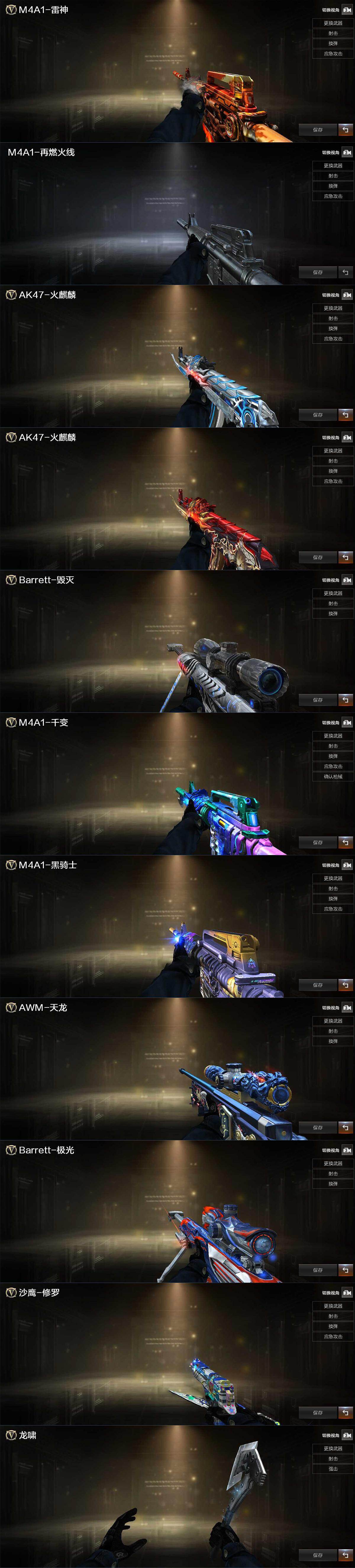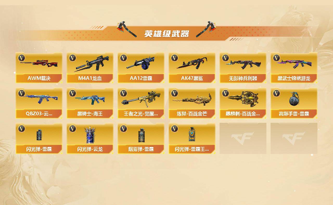 【英雄级武器】:AK47-火麒麟,M4A1-黑龙,M4A1-雷神,M4A1-黑骑士,AK12-天启,AN94-超新星,AK47-黑鲨,M4A1-龙血,无影-神兵利器,QBZ03-云龙,黑武士-锦绣游龙,M4A1-玫瑰精灵,QBZ03-金色蔷薇,黑骑士-海王,AWM-天龙,Barrett-毁灭,Barrett-极光,AWM-裁决,王者之光-觉醒版,加特林-炼狱*2,炼狱-百战金芒,汤姆逊-烈龙*6,AA-12-雷霆,沙鹰-修罗*2,屠龙,龙啸,擎天,麒麟刺,麒麟刺-百战金芒,高爆手雷-雷霆*4,闪光弹-雷霆*4,闪光弹-云龙,闪光弹-雷霆王者-觉醒版,烟雾弹-雷霆*4