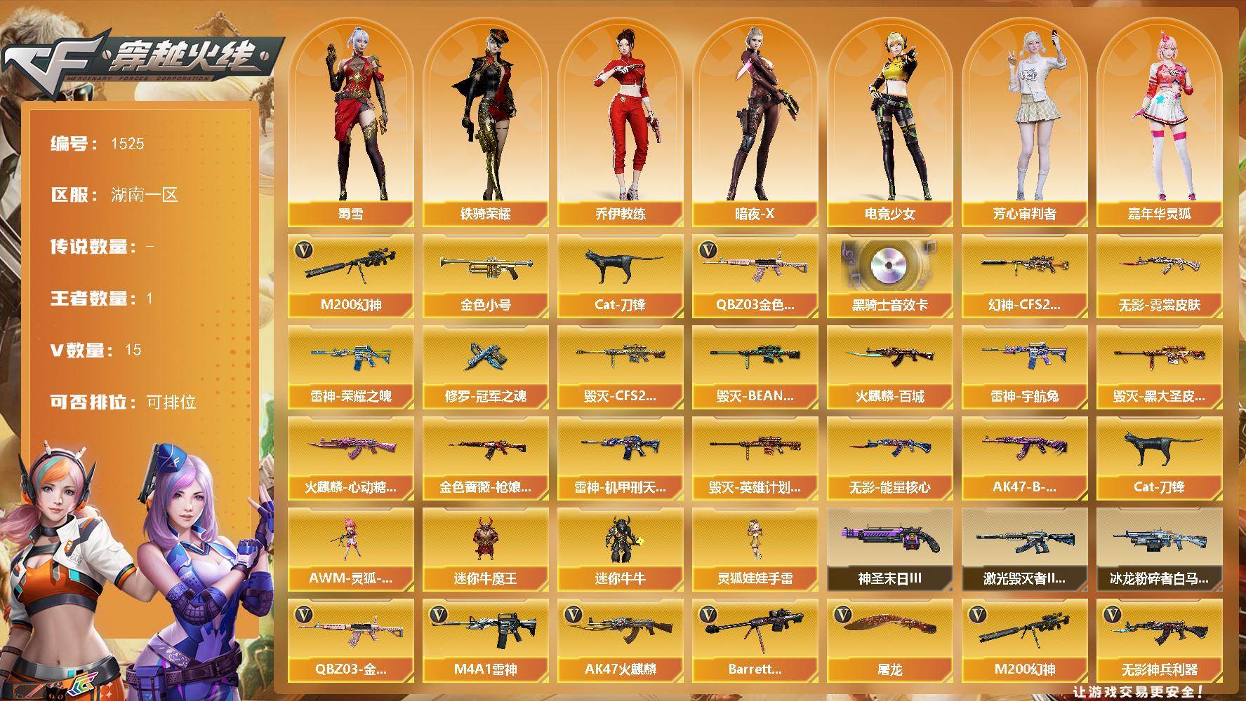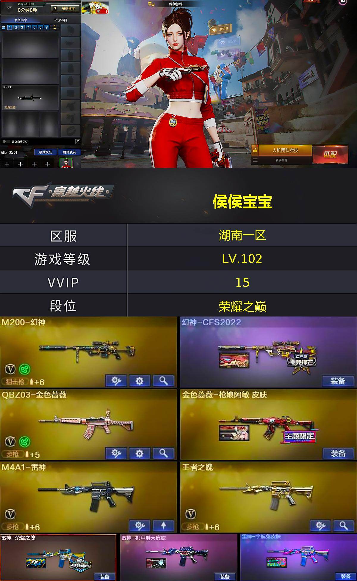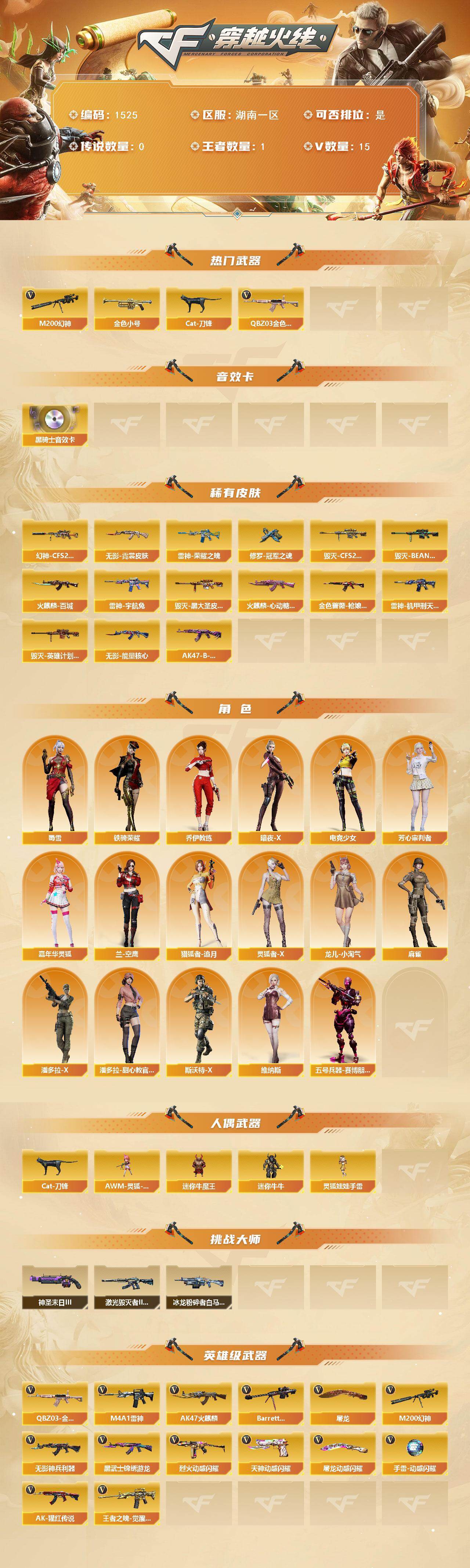 [15666480]湖南一区-15V-1王者-0炫金 【热门武器】:QBZ03-金色蔷薇,M200-幻神,金色小号,Cat-刀锋 【音效卡】:M4A1-黑骑士音效卡 【皮肤】:幻神-CFS2022,金色蔷薇-枪娘阿敏 皮肤,雷神-荣耀之魄,雷神-机甲刑天皮肤,雷神-宇航兔皮肤,火麒麟-百城,火麒麟-心动糖果,毁灭-CFS2020,毁灭-BEAN-2020MVP,毁灭-黑大圣皮肤,毁灭-英雄计划 皮肤,无影-能量核心,无影-霓裳皮肤,AK47-B-常胜将军-曹操,修罗-冠军之魂 【角色】:乔伊教练,暗夜-X,电竞少女,芳心审判者,嘉年华灵狐,兰-空鹰,猎狐者-追月,灵狐者-X,龙儿-小淘气,麻雀,潘多拉-X,潘多拉-甜心教官,斯沃特-X,蜀雪,铁骑荣耀,维纳斯,五号兵器-赛博朋克 【人偶武器】:AWM-灵狐-15周年嘉年华,Cat-刀锋,迷你牛魔王,迷你牛牛,灵狐娃娃手雷 【挑战大师】:冰龙粉碎者-白马银枪*2,激光毁灭者III-白马银枪,神圣爆裂者-末日III*2 【英雄级武器】:AK47-火麒麟,M4A1-雷神,无影-神兵利器,黑武士-锦绣游龙,QBZ03-金色蔷薇,烈火-动感闪耀,王者之魄-觉醒版,AK-47-猩红传说*3,Barrett-毁灭,M200-幻神,天神-动感闪耀,屠龙,屠龙-动感闪耀,手雷-动感闪耀 【道具】:全能枪王背包,虎牙炫彩背包,哔哩哔哩名片,绿色巨人,灵魂忍者,迷雾幽灵,夺命之镰,防化服*2,金色流光-枪王排位*2,星辰流光-枪王排位,枪王排位28赛季金色流光,动感闪耀表情,防弹头盔*2,防弹衣*2,C4工具钳*2,手雷包*2 【特殊枪械】: