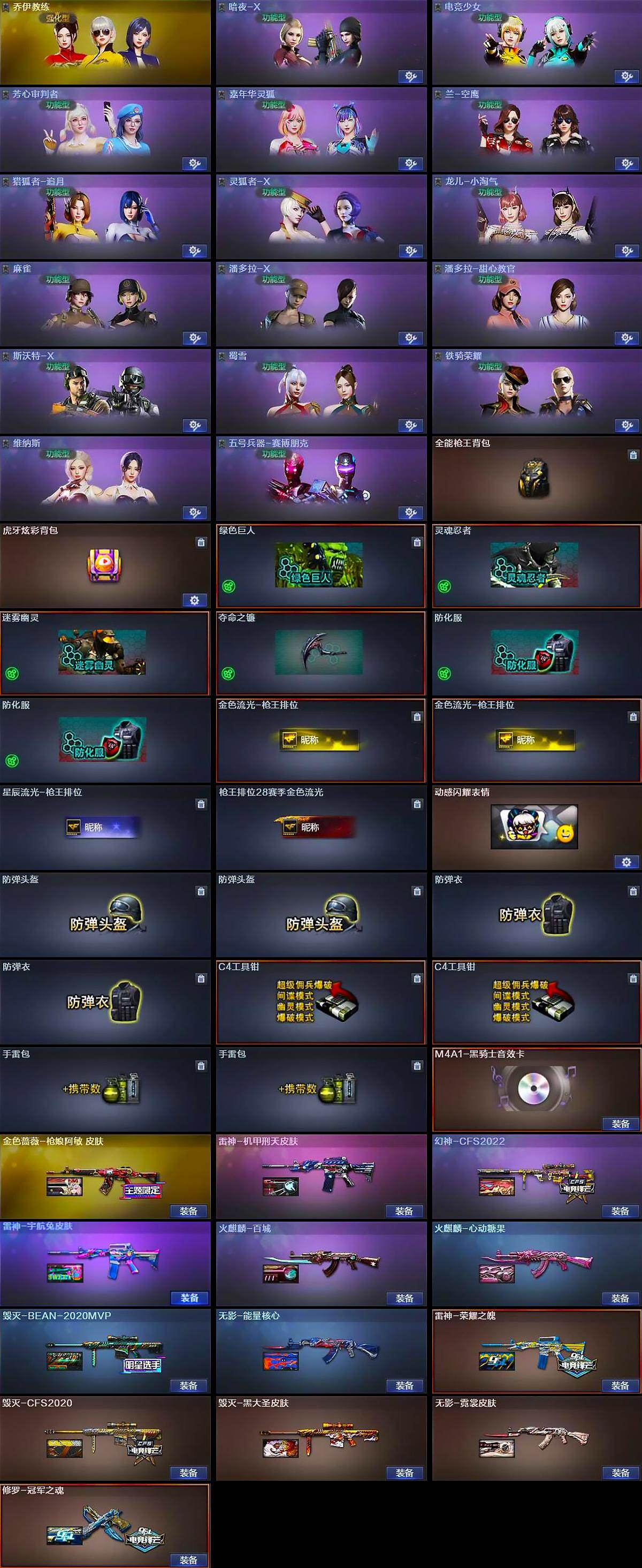 【皮肤】:幻神-CFS2022,金色蔷薇-枪娘阿敏 皮肤,雷神-荣耀之魄,雷神-机甲刑天皮肤,雷神-宇航兔皮肤,火麒麟-百城,火麒麟-心动糖果,毁灭-CFS2020,毁灭-BEAN-2020MVP,毁灭-黑大圣皮肤,毁灭-英雄计划 皮肤,无影-能量核心,无影-霓裳皮肤,AK47-B-常胜将军-曹操,修罗-冠军之魂