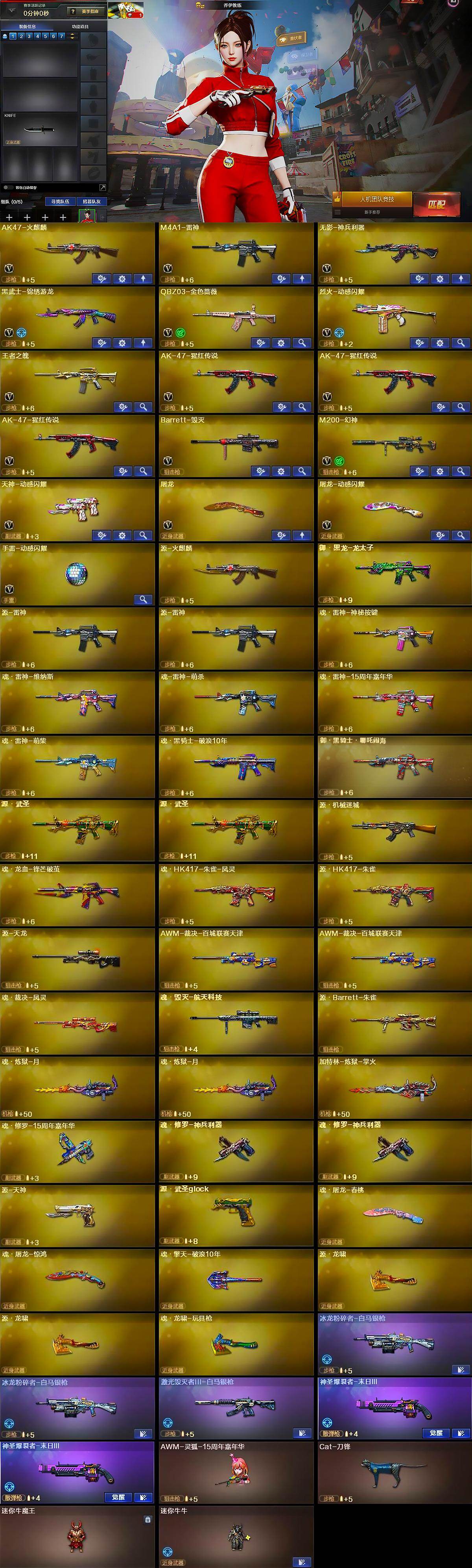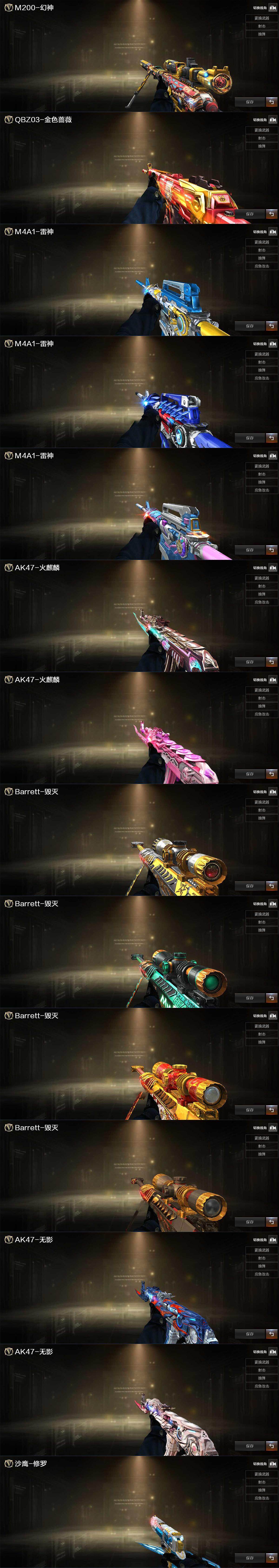 【英雄级武器】:AK47-火麒麟,M4A1-雷神,无影-神兵利器,黑武士-锦绣游龙,QBZ03-金色蔷薇,烈火-动感闪耀,王者之魄-觉醒版,AK-47-猩红传说*3,Barrett-毁灭,M200-幻神,天神-动感闪耀,屠龙,屠龙-动感闪耀,手雷-动感闪耀