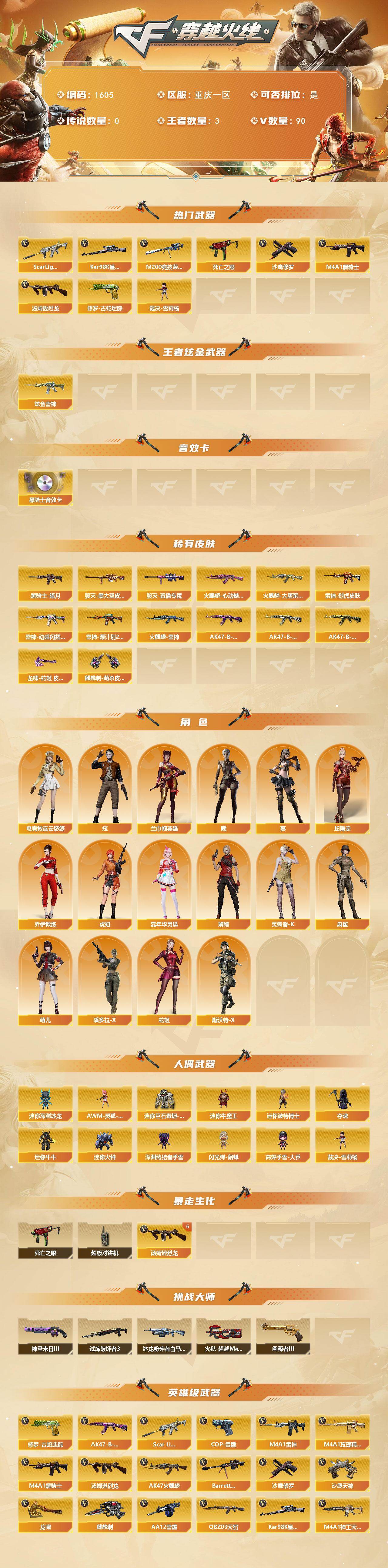 [15668272]重庆一区-90V-3王者-1炫金 【热门武器】:Scar Light-白虎,修罗-古蛇迷踪,M200-竞技荣光,死亡之眼,Kar98K-星神,M4A1-黑骑士*5,汤姆逊-烈龙*6,裁决-雪莉杨,沙鹰-修罗*3 【王者炫金武器】:炫金雷神 【音效卡】:M4A1-黑骑士音效卡 【皮肤】:雷神-烈虎皮肤,雷神-动感闪耀 皮肤,雷神-源计划2.0专属 皮肤,火麒麟-雷神,火麒麟-大唐荣光,火麒麟-心动糖果,毁灭-黑大圣皮肤,毁灭-直播专属,黑骑士-暗月,AK47-B-常胜将军-曹操,AK47-B-常胜将军-刘备,AK47-B-常胜将军-孙权*2,龙啸-蛇姬 皮肤,麒麟刺-萌杀皮肤 【角色】:葵,瞳,炫,电竞教官-云悠悠,兰-巾帼英雄,蛇隐宗,乔伊教练,虎妞,嘉年华灵狐,娟娟,灵狐者-X,麻雀,萌儿,潘多拉-X,蛇姬,斯沃特-X 【人偶武器】:裁决-雪莉杨,AWM-灵狐-15周年嘉年华,迷你深渊冰龙,迷你牛魔王,迷你波特博士*4,夺魂,迷你牛牛,迷你火种*2,深渊终结者手雷,闪光弹-貂蝉,高爆手雷-大乔,迷你巨石泰坦-魔花研究所 【暴走生化】:死亡之眼,超级对讲机 【挑战大师】:火狱乱世-超越Max,冰龙粉碎者-白马银枪*2,试炼破坏者III,神圣爆裂者-末日III,阐释者III 【英雄级武器】:AK47-火麒麟,M4A1-雷神,M4A1-黑骑士*5,M4A1-雷霆,Scar Light-白虎,QBZ03-天罚,M4A1-神工天巧,无影-神兵利器,M4A1-玫瑰精灵,烈火-动感闪耀,AK-47-猩红传说,AK47-B-常胜将军,Barrett-毁灭,Kar98K-星神,M200-竞技荣光,王者森决-觉醒版,汤姆逊-烈龙*6,AA-12-雷霆,沙鹰-修罗*3,沙鹰-天神*2,COP-雷霆,柯尔特-竞技荣光,USP-神工天巧,天神-动感闪耀,修罗-古蛇迷踪,龙啸,麒麟刺,擎天-竞技荣光,唐刀-神工天巧,屠龙-动感闪耀,王者之锋-觉醒版,王者之啸-觉醒版,高爆手雷-雷霆*7,高爆手雷-竞技荣光*5,高爆手雷-神工天巧,手雷-动感闪耀,高爆手雷-古蛇迷踪,闪光弹-雷霆*7,闪光弹-竞技荣光*5,闪光弹-神工天巧,烟雾弹-雷霆*7,烟雾弹-竞技荣光*5,烟雾弹-神工天巧,烟雾弹-古蛇迷踪 【道具】:全能枪王背包,古蛇迷踪炫彩背包,战舰背包,超级背包,女皇终结者-魔龙之吻,救世主-黑