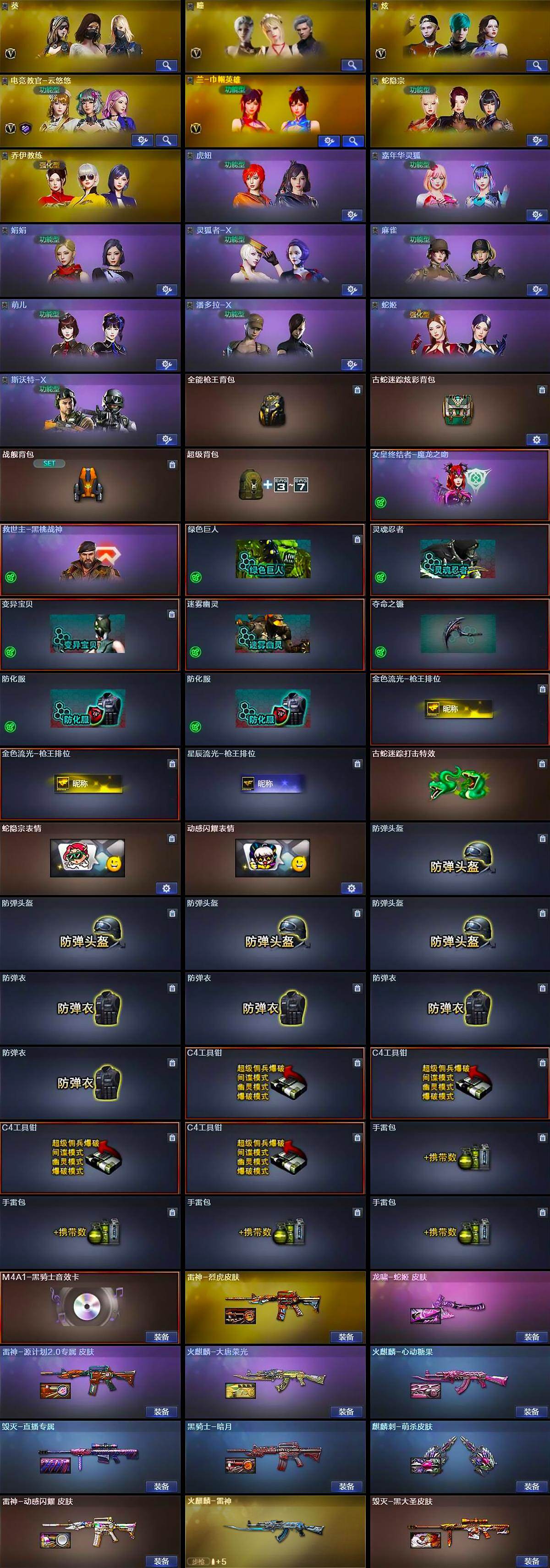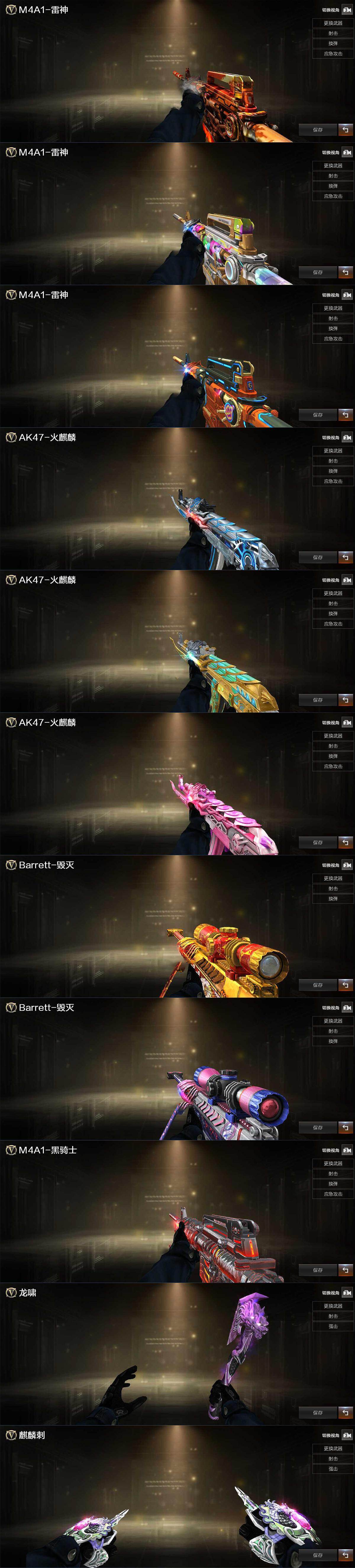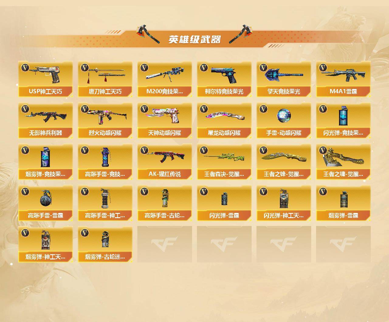 【英雄级武器】:AK47-火麒麟,M4A1-雷神,M4A1-黑骑士*5,M4A1-雷霆,Scar Light-白虎,QBZ03-天罚,M4A1-神工天巧,无影-神兵利器,M4A1-玫瑰精灵,烈火-动感闪耀,AK-47-猩红传说,AK47-B-常胜将军,Barrett-毁灭,Kar98K-星神,M200-竞技荣光,王者森决-觉醒版,汤姆逊-烈龙*6,AA-12-雷霆,沙鹰-修罗*3,沙鹰-天神*2,COP-雷霆,柯尔特-竞技荣光,USP-神工天巧,天神-动感闪耀,修罗-古蛇迷踪,龙啸,麒麟刺,擎天-竞技荣光,唐刀-神工天巧,屠龙-动感闪耀,王者之锋-觉醒版,王者之啸-觉醒版,高爆手雷-雷霆*7,高爆手雷-竞技荣光*5,高爆手雷-神工天巧,手雷-动感闪耀,高爆手雷-古蛇迷踪,闪光弹-雷霆*7,闪光弹-竞技荣光*5,闪光弹-神工天巧,烟雾弹-雷霆*7,烟雾弹-竞技荣光*5,烟雾弹-神工天巧,烟雾弹-古蛇迷踪