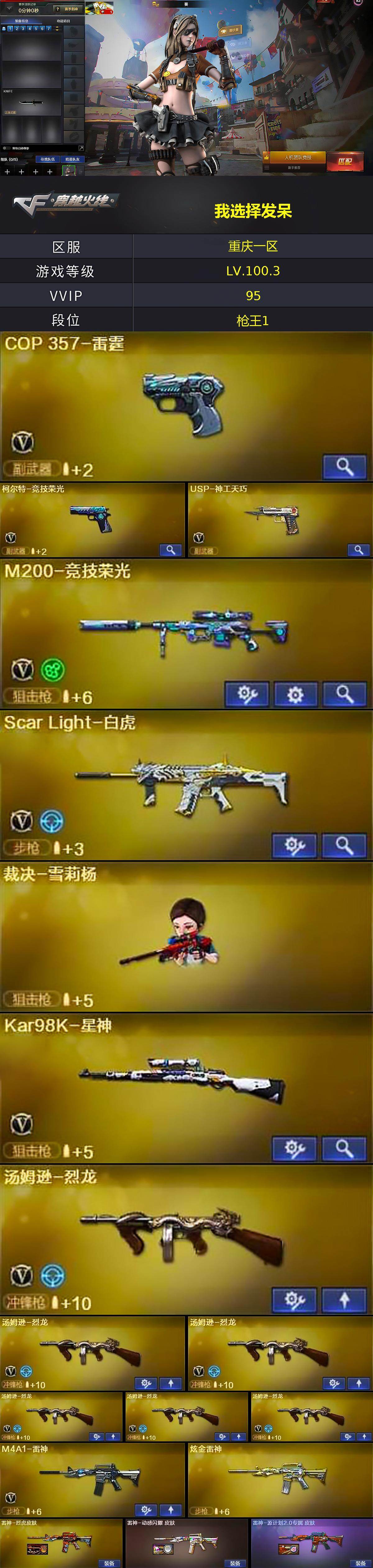 - [15249272]重庆一区-36V-1王者-0炫金 【热门武器】:QBZ03-金色蔷薇,M200-竞技荣光,M4A1-黑骑士,RPK-盘龙*3,加特林-炼狱,USP-雷暴,沙鹰-修罗*2 【音效卡】:M4A1-黑骑士音效卡 【皮肤】:金色蔷薇-电竞之星 皮肤,雷神-机甲刑天皮肤,雷神-维纳斯皮肤,雷神-神秘按键 皮肤,火麒麟-平天大圣,毁灭-黑大圣皮肤,毁灭-英雄计划 皮肤,M4A1-千变-孔明皮肤,修罗-能量核心 【角色】:电竞教官-云悠悠,暗夜-X,初恋灵狐,虎妞,娟娟,葵-赛博朋克,兰-海滩派对,龙儿-小淘气,麻雀,潘多拉-X,潘多拉-甜心教官,青霞仙子,蜀雪,樱-战斗天使 【人偶武器】:夺魂 【挑战大师】:激光毁灭者III 【英雄级武器】:AK47-火麒麟,M4A1-雷神,M4A1-黑骑士,无影-神兵利器,QBZ03-金色蔷薇,王者火魄-觉醒版,Barrett-毁灭,Barrett-极光,Barrett-朱雀,M200-竞技荣光,RPK-盘龙*3,加特林-炼狱,沙鹰-修罗*2,沙鹰-天神,USP-雷暴,屠龙,擎天,麒麟刺*2,擎天-竞技荣光,高爆手雷-竞技荣光*4,闪光弹-竞技荣光*3,烟雾弹-竞技荣光*3 【道具】:炫彩背包,牛魔王背包-至尊黄金,背包-葫芦兄弟,超级背包,绿色巨人,灵魂忍者,变异宝贝,迷雾幽灵,夺命之镰,防化服*2,金色流光-枪王排位,枪王排位29赛季金色流光,C4-沙漠,防弹头盔*3,防弹衣*3,C4工具钳*3,手雷包*3 【特殊枪械】:1黑骑士,3盘龙,1炼狱