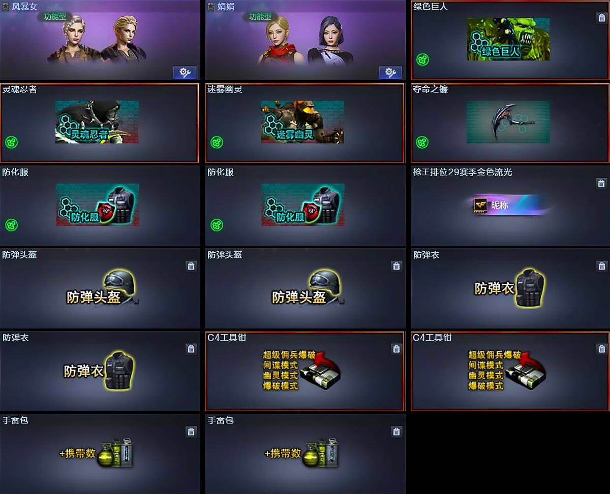 【道具】:绿色巨人,灵魂忍者,迷雾幽灵,夺命之镰,防化服*2,枪王排位29赛季金色流光,防弹头盔*2,防弹衣*2,C4工具钳*2,手雷包*2