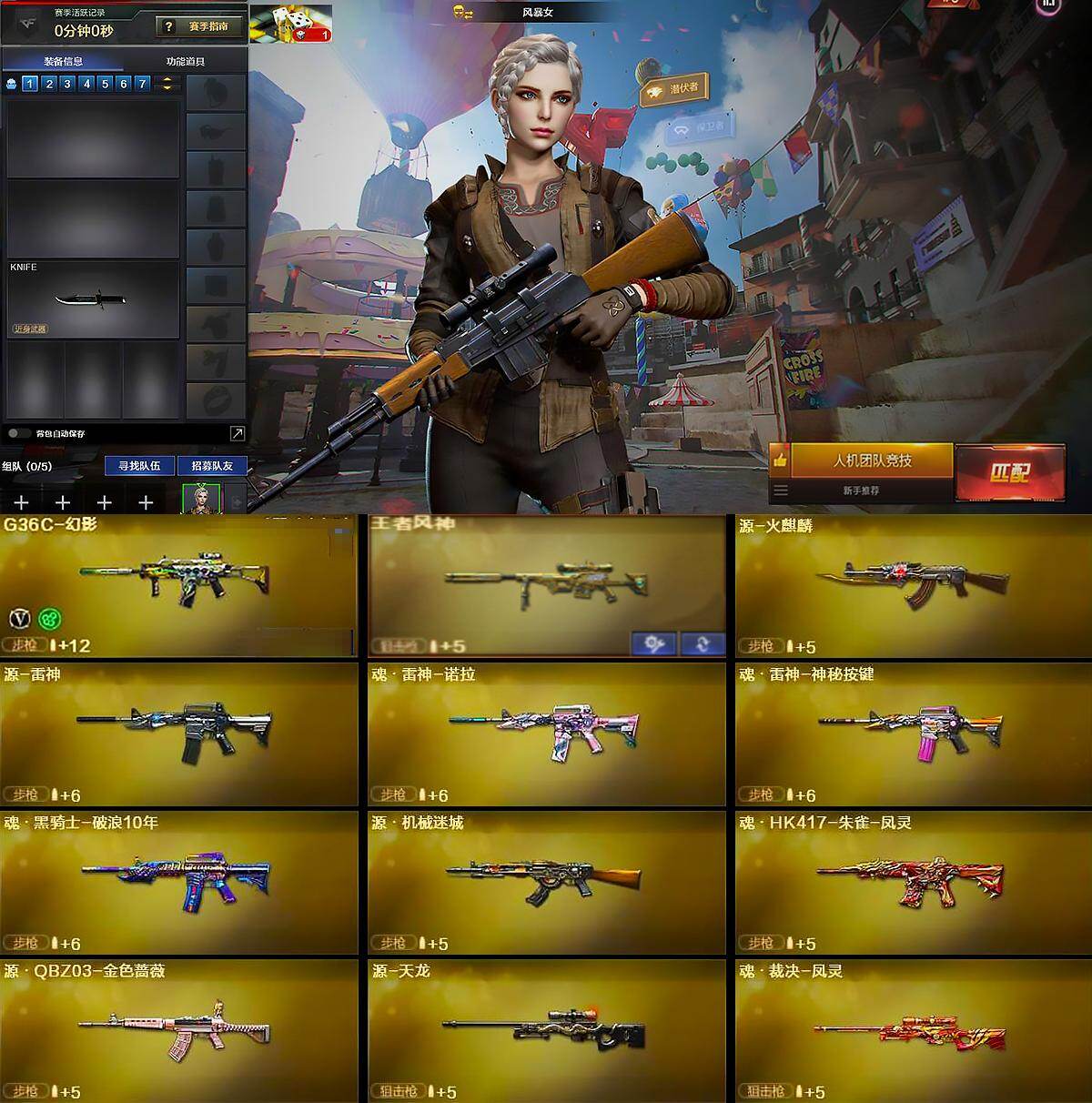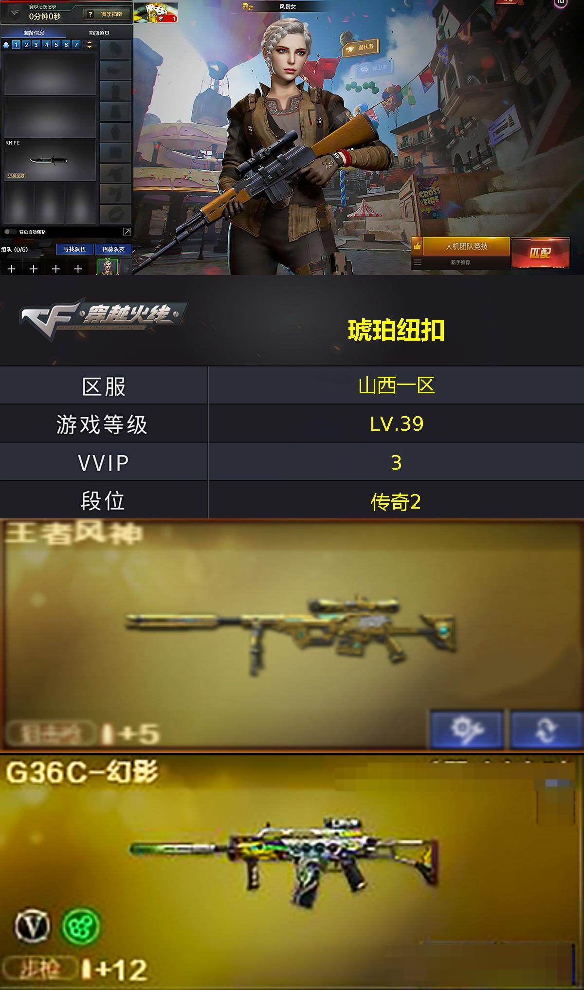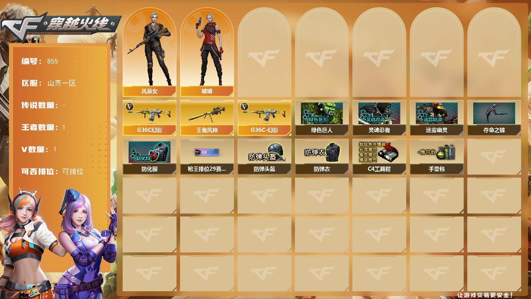 [15668459]山西一区-1V-1王者-0炫金 【热门武器】:G36C-幻影 【王者炫金武器】:王者风神 【角色】:风暴女,娟娟 【英雄级武器】:G36C-幻影 【道具】:绿色巨人,灵魂忍者,迷雾幽灵,夺命之镰,防化服*2,枪王排位29赛季金色流光,防弹头盔*2,防弹衣*2,C4工具钳*2,手雷包*2 【特殊枪械】:
