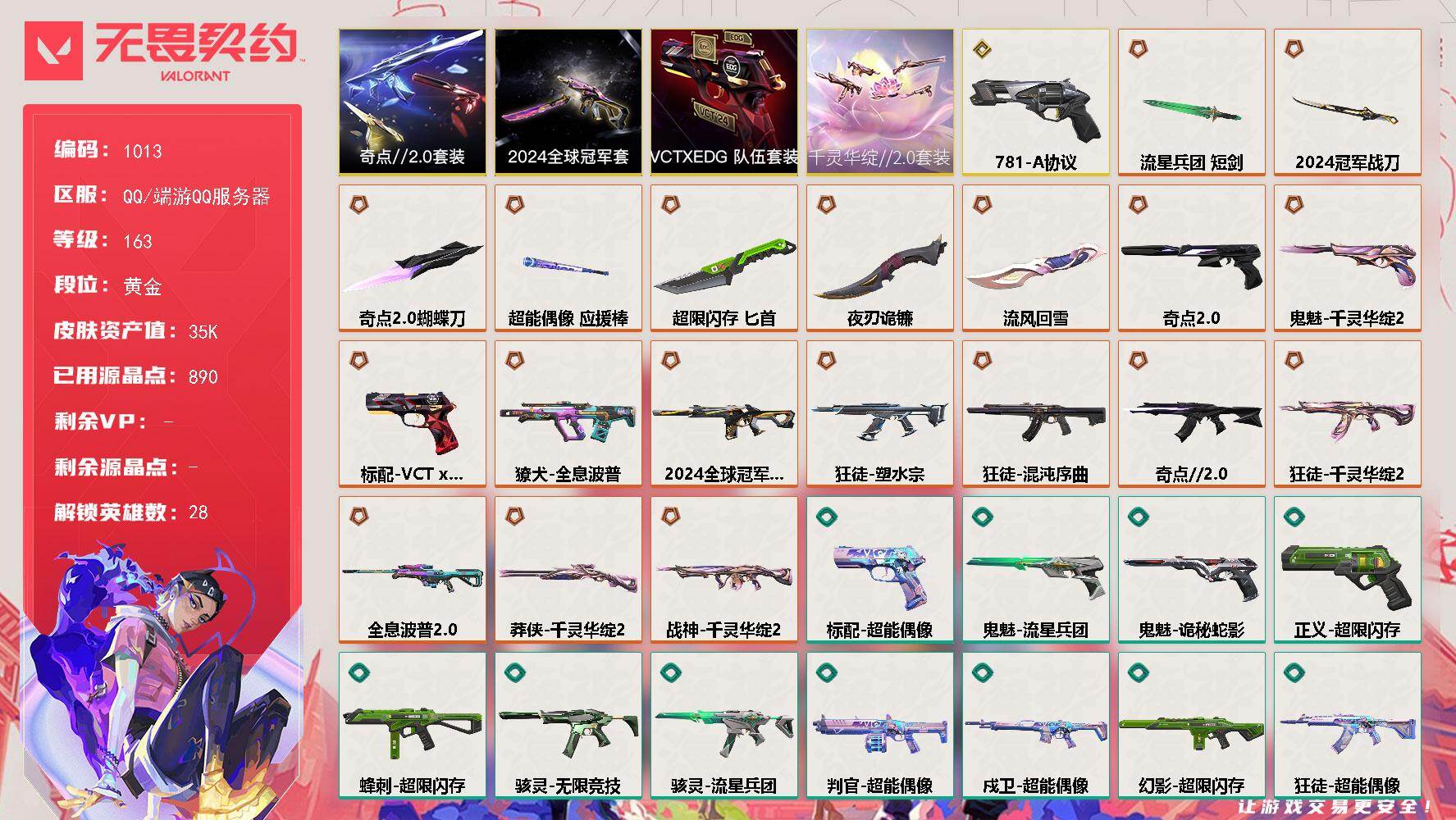 [15669091]【套装】:2024全球冠军赛套装,千灵华绽//2.0套装,奇点//2.0套装,VCTxEDG 队伍套装 【英雄】:幻棱,炼狱,维斯,暮蝶,钛狐,壹决,铁臂,捷风,雷兹,幽影,不死鸟,贤者,猎枭,蝰蛇,零,芮娜,奇乐,尚勃勒,霓虹,斯凯,夜露,星礈,K/O,海神,盖可,黑梦,钢锁 【近战武器】:近战武器-2024全球冠军赛 战刀,近战武器-流风回雪,近战武器-奇点//2.0 蝴蝶刀,近战武器-流星兵团 短剑,近战武器-超能偶像 应援棒,近战武器-超限闪存 匕首,近战武器-夜刃诡镰 【狂徒】:狂徒-混沌序曲,狂徒-奇点//2.0,狂徒-塑水宗,狂徒-千灵华绽//2.0,狂徒-超能偶像,狂徒-流星兵团 【幻影】:幻影-2024全球冠军赛,幻影-超限闪存,幻影-聚合之力 【戍卫】:戍卫-超能偶像,戍卫-浮光跃金,戍卫-战术熊与伙伴们 【獠犬】:獠犬-全息波普,獠犬-采蜜小蜂队,獠犬-模拟赫兹 【冥驹】:冥驹-全息波普//2.0,冥驹-模拟赫兹 【飞将】:飞将-聚合之力,飞将-战术熊与伙伴们 【莽侠】:莽侠-千灵华绽//2.0,莽侠-超限闪存,莽侠-纤云弄巧 【战神】:战神-千灵华绽//2.0,战神-采蜜小蜂队,战神-浮光跃金 【奥丁】:奥丁-流星兵团 【判官】:判官-超能偶像,判官-采蜜小蜂队 【雄鹿】:雄鹿-模拟赫兹 【骇灵】:骇灵-流星兵团,骇灵-无限竞技,骇灵-浮光跃金 【蜂刺】:蜂刺-超限闪存,蜂刺-聚合之力,蜂刺-纤云弄巧 【标配】:标配-超能偶像,标配-浮光跃金,标配-战术熊与伙伴们 【VCT手枪】:标配-VCT x EDG 【正义】:正义-781-A协议,正义-超限闪存,正义-纤云弄巧 【鬼魅】:鬼魅-奇点//2.0,鬼魅-千灵华绽//2.0,鬼魅-流星兵团,鬼魅-诡秘蛇影,鬼魅-采蜜小蜂队,鬼魅-模拟赫兹 【狂怒】:狂怒-聚合之力,狂怒-战术熊与伙伴们 【短炮】:短炮-纤云弄巧 【卡面】:《双城之战》拥抱 卡面,精灵大战 卡面,欢迎来到底城 卡面,南瓜盛典 卡面,VCT CN首冠 卡面,唱片的故事 卡面,钢弓与箭弦 卡面,排除故障 卡面,奇点//2.0 卡面,战术桌游 卡面,悠享食光 卡面,修车达人 卡面,热舞环节 卡面,模拟赫兹 卡面,浮光跃金 卡面,超限闪存 卡面,维斯工牌 卡面,正义的化身 卡面,终章:生意人麦宝 卡面,铁之华 卡面,2024全球冠军