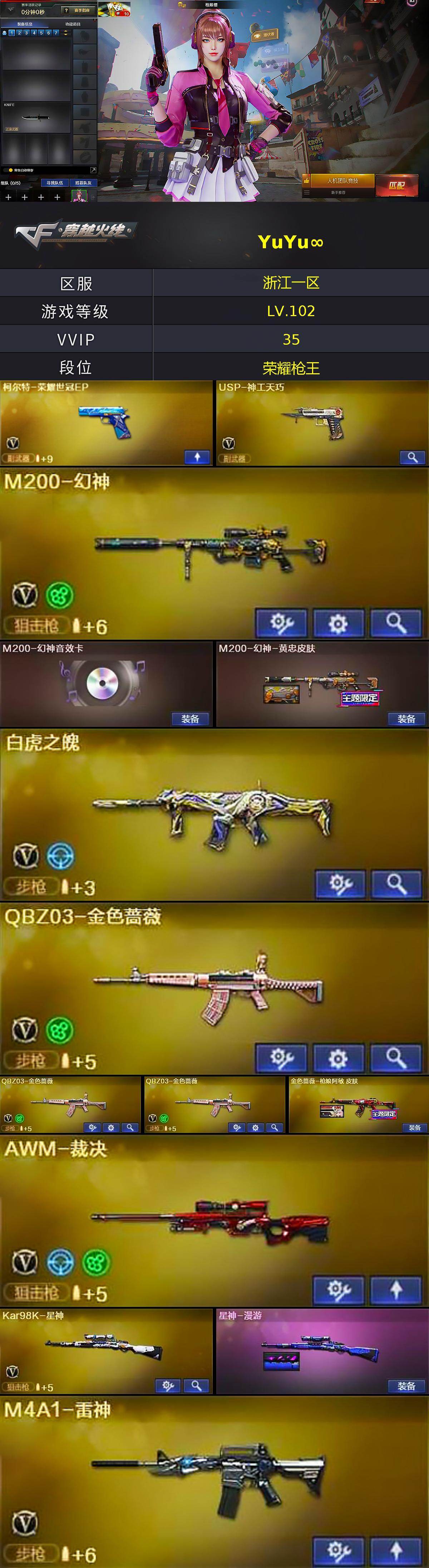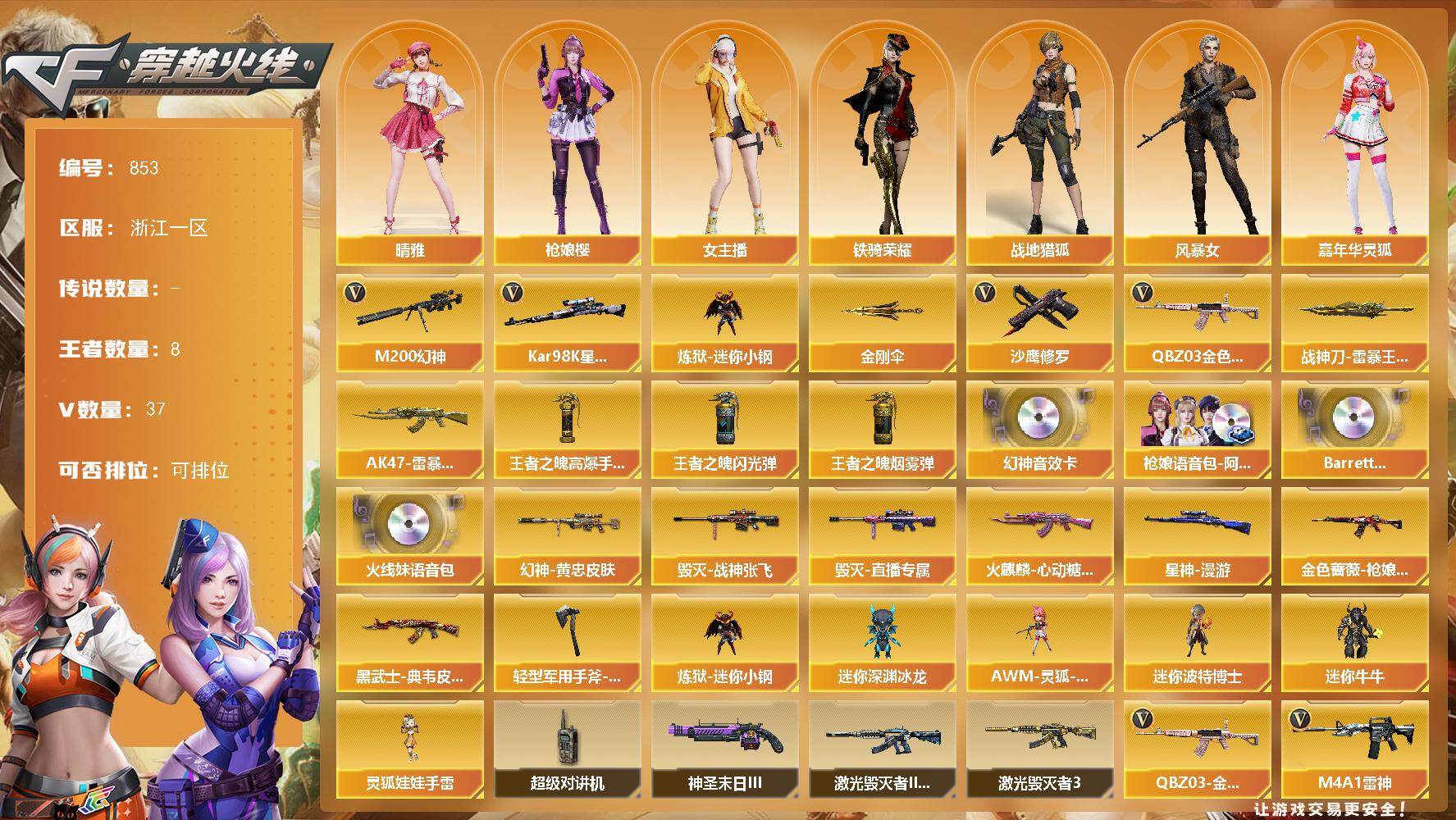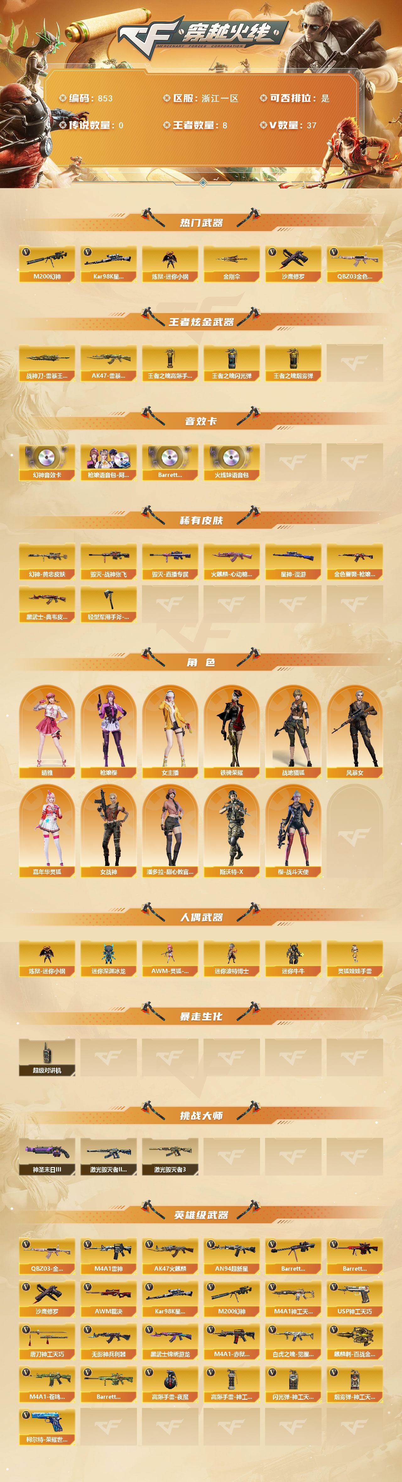 [15669872]浙江一区-37V-8王者-0炫金 【热门武器】:QBZ03-金色蔷薇*3,M200-幻神,Kar98K-星神,炼狱-迷你小钢,沙鹰-修罗,金刚伞 【王者炫金武器】:AK47-雷暴王者,斩神刀-雷暴王者,王者之魄高爆手雷,王者之魄闪光弹*2,王者之魄烟雾弹 【音效卡】:M200-幻神音效卡,枪娘语音包-阿敏,Barrett-碧霄极光音效卡,火线妹语音包 【皮肤】:M200-幻神-黄忠皮肤,金色蔷薇-枪娘阿敏 皮肤,星神-漫游,火麒麟-心动糖果,毁灭-战神张飞,毁灭-直播专属,黑武士-典韦皮肤,轻型军用手斧-再燃火线 【角色】:枪娘樱,晴雅,战地猎狐,风暴女,嘉年华灵狐,女战神,女主播,潘多拉-甜心教官,斯沃特-X,铁骑荣耀,樱-战斗天使 【人偶武器】:炼狱-迷你小钢,AWM-灵狐-15周年嘉年华,迷你深渊冰龙,迷你波特博士,迷你牛牛,灵狐娃娃手雷 【暴走生化】:超级对讲机 【挑战大师】:激光毁灭者III-白马银枪*2,激光毁灭者III,神圣爆裂者-末日III*2 【英雄级武器】:AK47-火麒麟,M4A1-雷神,AN94-超新星,M4A1-神工天巧,无影-神兵利器,黑武士-锦绣游龙,QBZ03-金色蔷薇*3,白虎之魄-觉醒版,Barrett-毁灭,Barrett-极光,AWM-裁决,M200-幻神,Kar98K-星神,沙鹰-修罗,柯尔特-荣耀世冠EP,USP-神工天巧,唐刀-神工天巧,麒麟刺-百战金芒,高爆手雷-夜魔,高爆手雷-神工天巧,闪光弹-神工天巧*2,烟雾弹-神工天巧,M4A1-赤狱骑士,M4A1-苍鸣雷神,Barrett-碧霄极光 【道具】:CFS限定背包,全能枪王背包,冰冰企鹅背包,女皇终结者-背包,战舰背包,炫彩背包,女皇终结者-魔龙之吻,救世主-黑桃战神,绿色巨人,灵魂忍者,迷雾幽灵,生化弹匣,夺命之镰,防化服*3,金色流光-枪王排位*2,星辰流光-枪王排位,枪王排位28赛季金色流光,枪王排位29赛季金色流光,C4-再燃火线,防弹头盔*3,防弹衣*3,C4工具钳*3,手雷包*3 【特殊枪械】: