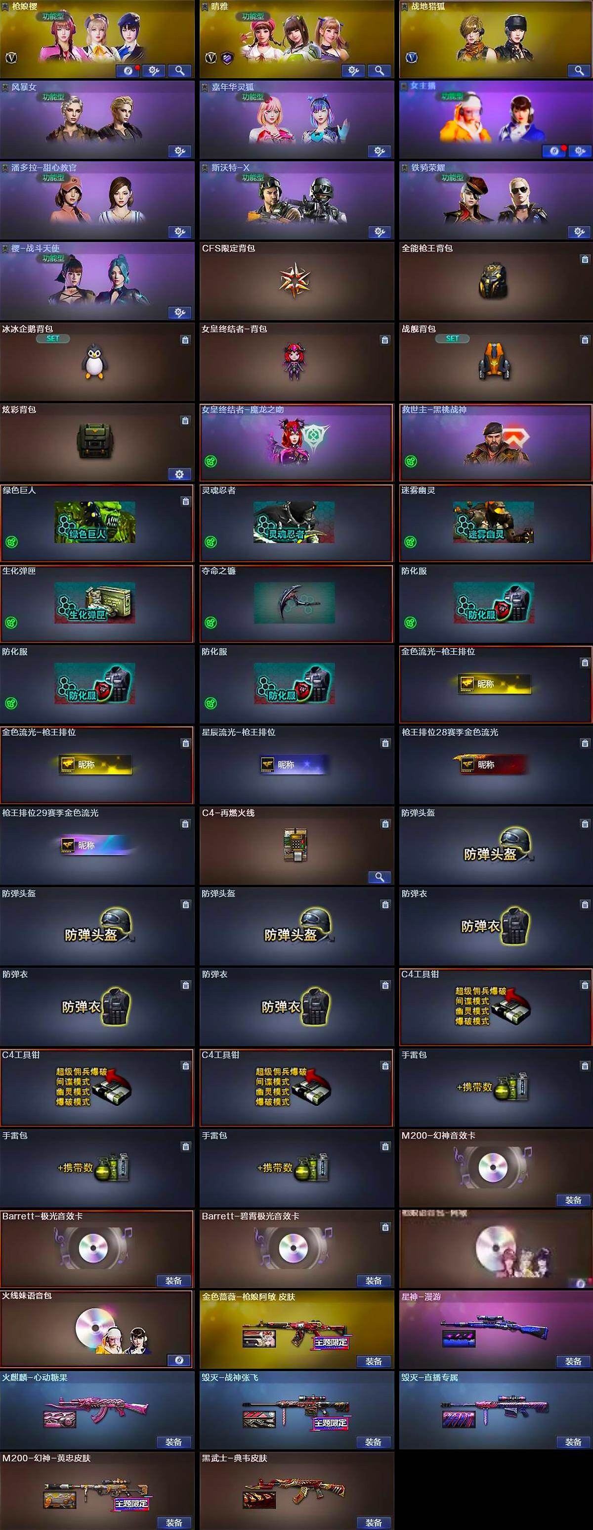 【道具】:CFS限定背包,全能枪王背包,冰冰企鹅背包,女皇终结者-背包,战舰背包,炫彩背包,女皇终结者-魔龙之吻,救世主-黑桃战神,绿色巨人,灵魂忍者,迷雾幽灵,生化弹匣,夺命之镰,防化服*3,金色流光-枪王排位*2,星辰流光-枪王排位,枪王排位28赛季金色流光,枪王排位29赛季金色流光,C4-再燃火线,防弹头盔*3,防弹衣*3,C4工具钳*3,手雷包*3