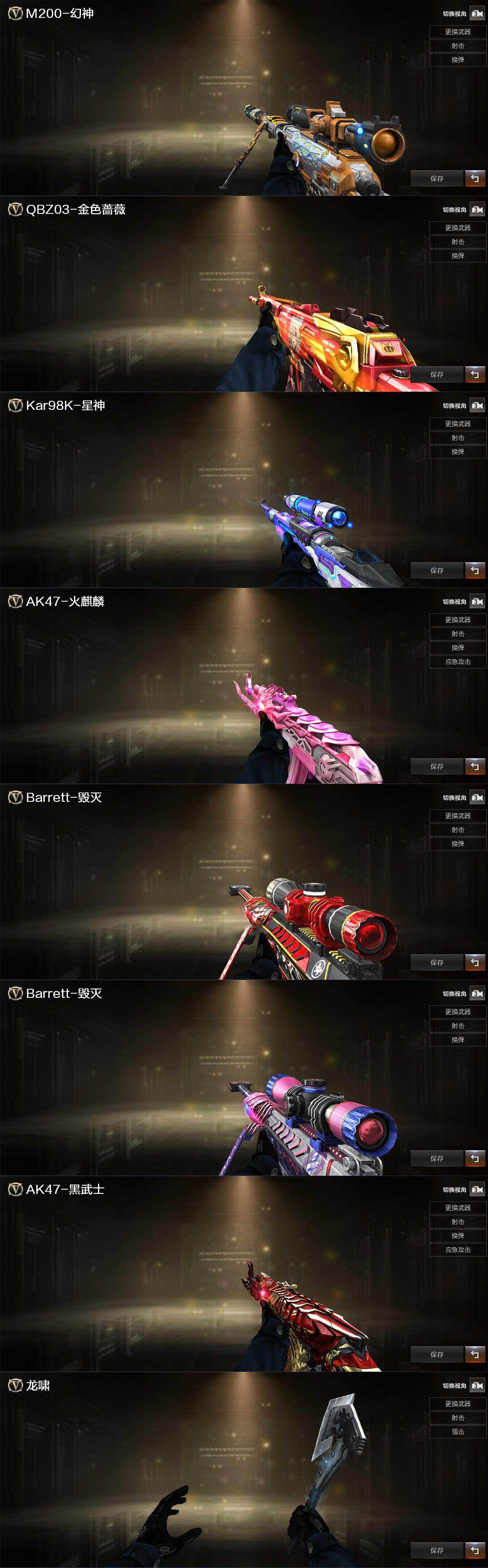 【热门武器】:QBZ03-金色蔷薇*3,M200-幻神,Kar98K-星神,炼狱-迷你小钢,沙鹰-修罗,金刚伞