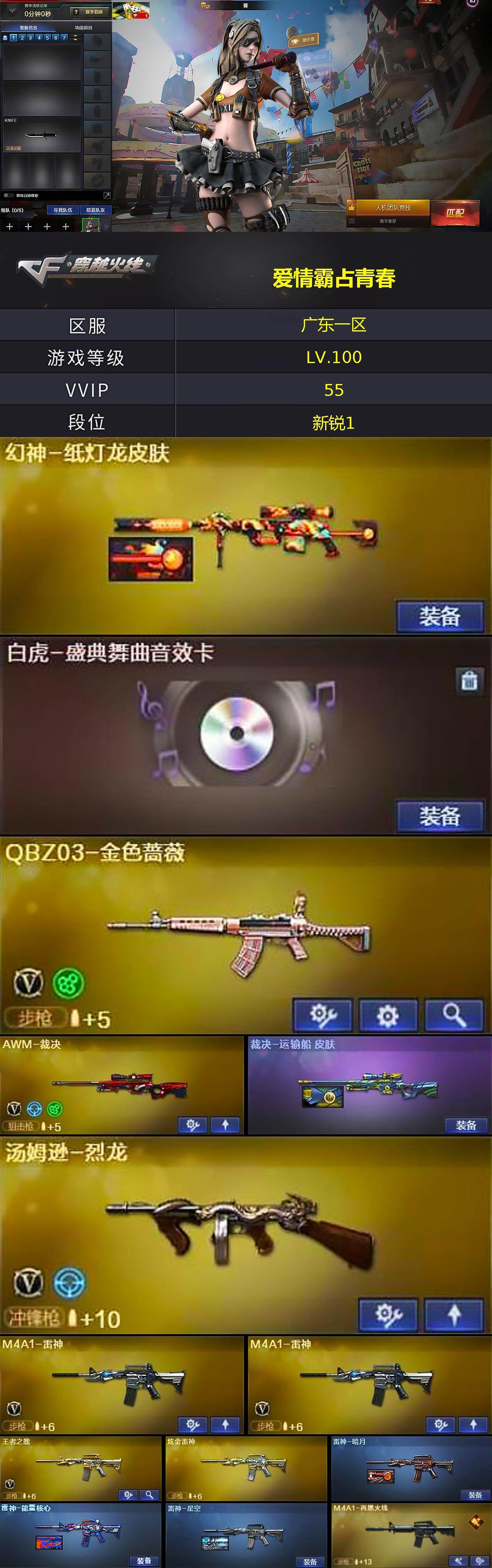 [15669927]广东一区-55V-3王者-4炫金 【热门武器】:QBZ03-金色蔷薇,M4A1-黑骑士,汤姆逊-烈龙,加特林-炼狱*2,沙鹰-修罗*2 【王者炫金武器】:王者之幻,王者之光,炫金雷神,炫金毁灭*2,炫金天龙 【音效卡】:修罗-云海游龙音效卡,AK47-火麒麟音效卡,M4A1-黑骑士音效卡,Barrett-毁灭音效卡,麒麟刺-百战金芒-盛典舞曲音效卡,白虎-盛典舞曲音效卡,炼狱-百战金芒-庆典舞曲音效卡,AWM-昌龙-怀旧音效卡 【皮肤】:幻神-纸灯龙皮肤,裁决-运输船 皮肤,雷神-暗月,雷神-能量核心,雷神-星空,M4A1-再燃火线,雷神-课桌奇兵 皮肤,火麒麟-雷神,火麒麟-冠军之心,火麒麟-轻羽皮肤,毁灭-冠军之怒,黑龙-能量核心,M4A1-黑龙-361,黑骑士-暗月,AK47-黑武士-361,战神-粉色甜心皮肤,战神-紫绶金章皮肤*6,战神-流金岁月皮肤*5,AWM-天龙-传奇70KG,AWM-天龙-传奇白鲨,修罗-能量核心,屠龙-荣耀之锋,轻型军用手斧-再燃火线 【角色】:葵,战地猎狐,王者-瞳-闭月羞花,修道士,飞虎队-X,潘多拉-X,潘多拉-甜心教官,青霞仙子,斯沃特-X,新娜塔莎,游珑儿 【人偶武器】:火麒麟-灵狐,AWM-灵狐-15周年嘉年华,迷你牛牛,生化手雷-机甲核心,闪光弹-小乔,灵狐娃娃手雷 【英雄级武器】:AK47-火麒麟,M4A1-黑龙,M4A1-雷神*2,M4A1-黑骑士,AK47-黑武士,AK12-天启*2,黑武士-锦绣游龙,QBZ03-金色蔷薇,王者之魄-觉醒版,AK-47-猩红传说*5,AK47-B-战神,黑骑士-海王,AWM-天龙,Barrett-毁灭,AWM-裁决,加特林-炼狱*2,炼狱-百战金芒,汤姆逊-烈龙,AA-12-雷霆*2,沙鹰-修罗*2,沙鹰-天神*2,屠龙,龙啸,擎天,麒麟刺,斩神刀-雷暴,麒麟刺-百战金芒,丛林匕首-玄豹,高爆手雷-雷霆,高爆手雷-雷暴,高爆手雷-玄豹,闪光弹-雷霆,闪光弹-雷暴,闪光弹-云龙*2,闪光弹-玄豹,烟雾弹-雷霆,烟雾弹-雷暴,烟雾弹-玄豹,M4A1-赤狱骑士,AWM-昌龙 【道具】:BS战队炫彩背包,CFS限定背包,云山科技背包,亚洲杯纪念炫彩背包,炫彩背包,热带奇洋炫彩背包,白狐背包,百战金芒炫彩背包,超级背包,女皇终结者-魔龙之吻,救世主-黑桃战神,黄金生化钩,绿色巨人,灵魂