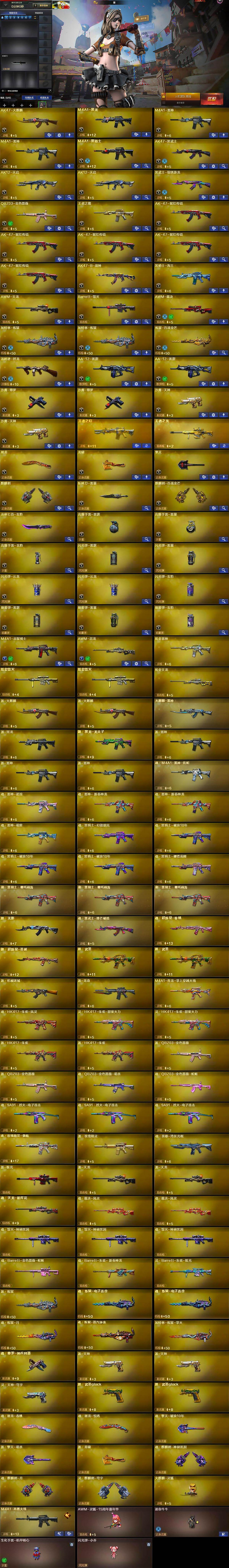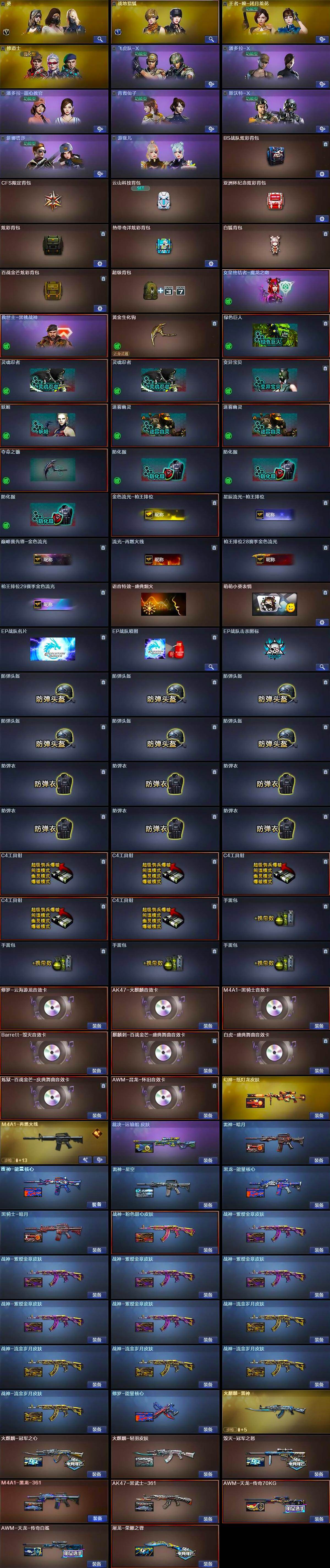 【英雄级武器】:AK47-火麒麟,M4A1-黑龙,M4A1-雷神*2,M4A1-黑骑士,AK47-黑武士,AK12-天启*2,黑武士-锦绣游龙,QBZ03-金色蔷薇,王者之魄-觉醒版,AK-47-猩红传说*5,AK47-B-战神,黑骑士-海王,AWM-天龙,Barrett-毁灭,AWM-裁决,加特林-炼狱*2,炼狱-百战金芒,汤姆逊-烈龙,AA-12-雷霆*2,沙鹰-修罗*2,沙鹰-天神*2,屠龙,龙啸,擎天,麒麟刺,斩神刀-雷暴,麒麟刺-百战金芒,丛林匕首-玄豹,高爆手雷-雷霆,高爆手雷-雷暴,高爆手雷-玄豹,闪光弹-雷霆,闪光弹-雷暴,闪光弹-云龙*2,闪光弹-玄豹,烟雾弹-雷霆,烟雾弹-雷暴,烟雾弹-玄豹,M4A1-赤狱骑士,AWM-昌龙