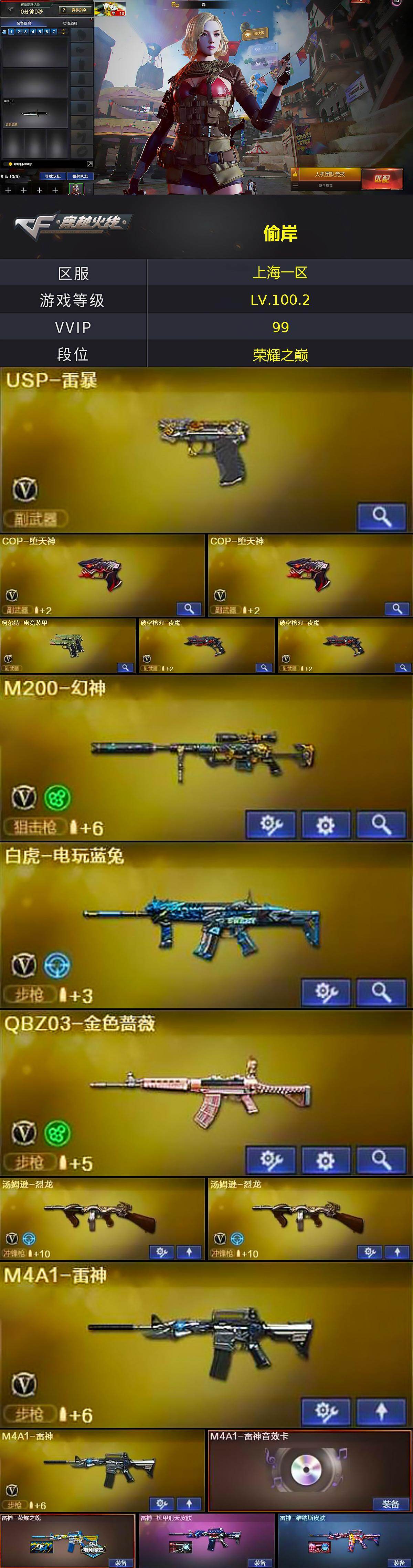 [15670133]上海一区-101V-2王者-1炫金 【热门武器】:QBZ03-金色蔷薇,HK417-朱雀,M200-幻神,白虎-电玩蓝兔,M4A1-黑骑士,汤姆逊-烈龙*2,斯泰尔-蝴蝶,USP-雷暴,COP-堕天神*2,沙鹰-修罗 【王者炫金武器】:炫金骑士 【音效卡】:M4A1-雷神音效卡,M4A1-黑龙音效卡,M4A1-黑骑士音效卡,Barrett-碧霄极光音效卡*3 【皮肤】:裁决-胜者为王 皮肤,雷神-荣耀之魄,雷神-机甲刑天皮肤,雷神-维纳斯皮肤,火麒麟-AG战队皮肤,火麒麟-雷神,火麒麟-平天大圣,火麒麟-百城,火麒麟-心动糖果,毁灭-暗月,毁灭-黑大圣皮肤,毁灭-英雄计划 皮肤,黑龙-能量核心,M4A1-黑龙-361,战神-流金岁月皮肤,AK47-B-常胜将军-曹操*3,AK47-B-常胜将军-刘备,AK47-B-常胜将军-孙权,极光-能量核心,修罗-能量核心,麒麟刺-甜蜜糖果 皮肤 【角色】:春,凌霄,战地猎狐,王者-葵-貂蝉,乔伊教练,修道士,云海玲珑,暗夜-X,北极狐-X,初恋灵狐,电竞少女,芳心审判者,风暴女,娟娟,灵狐者-X,灵狐者-黄金海岸,灵狐者-七夕宝贝,灵狐者-职业经理,龙儿,龙儿-小淘气,曼陀罗-X,潘多拉-X,潘多拉-甜心教官,潜龙队-X,邱刚敖,斯沃特-X,雪莉杨,雪莉杨-摸金校尉,樱-战斗天使,影武者-X,职业选手 【人偶武器】:斯泰尔-蝴蝶,M37-葵,迷你深渊冰龙,迷你裂空之翼,夺魂,迷你牛牛*5,深渊终结者手雷*2,闪光弹-貂蝉,高爆手雷-大乔,迷你艾比,迷你超能女侍,迷你巨石泰坦-魔花研究所,灵狐娃娃手雷 【暴走生化】:超级对讲机 【挑战大师】:神圣爆裂者III,AK47-冰龙粉碎者,激光毁灭者III-白马银枪,VEPR-12-金魔,激光毁灭者III*2,KAC-圣炎切割者III 【英雄级武器】:AK47-火麒麟*2,M4A1-黑龙,M4A1-雷神*2,M4A1-黑骑士,AK47-雷暴*2,HK417-朱雀,M4A1-夜魔,无影-神兵利器,QBZ03-金色蔷薇,王者之戮-觉醒版,AK-47-猩红传说,AK47-B-战神,黑骑士-海王*3,AK47-B-常胜将军*2,白虎-电玩蓝兔,Barrett-毁灭,Barrett-极光,M200-幻神,汤姆逊-烈龙*2,沙鹰-修罗,USP-雷暴,COP-堕天神*2,柯尔特-电竞装甲,破空枪刃-