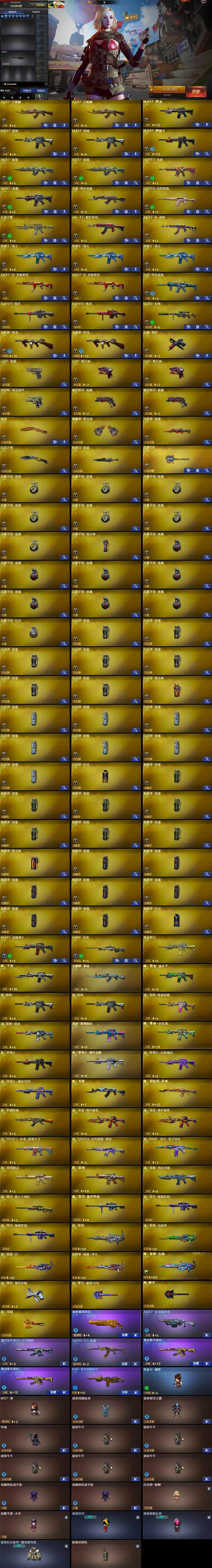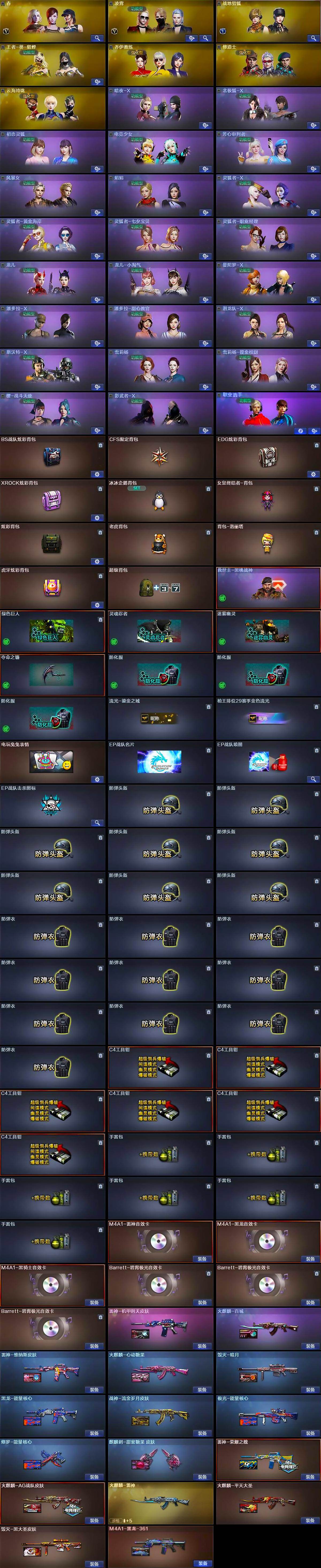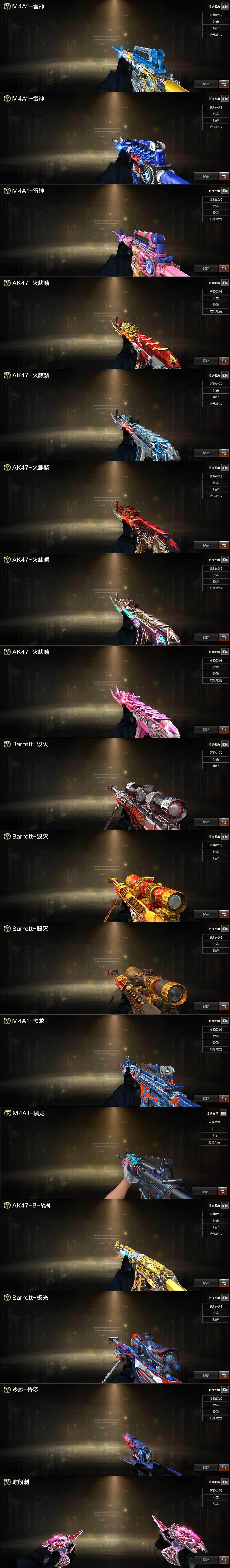【英雄级武器】:AK47-火麒麟*2,M4A1-黑龙,M4A1-雷神*2,M4A1-黑骑士,AK47-雷暴*2,HK417-朱雀,M4A1-夜魔,无影-神兵利器,QBZ03-金色蔷薇,王者之戮-觉醒版,AK-47-猩红传说,AK47-B-战神,黑骑士-海王*3,AK47-B-常胜将军*2,白虎-电玩蓝兔,Barrett-毁灭,Barrett-极光,M200-幻神,汤姆逊-烈龙*2,沙鹰-修罗,USP-雷暴,COP-堕天神*2,柯尔特-电竞装甲,破空枪刃-