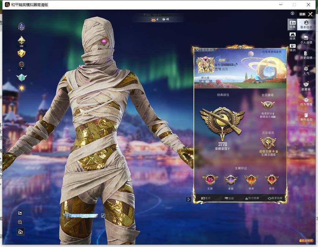 - PX_2078094-实名: 可修改 贵族等级: V7 英雄数: 122 皮肤数: 212 星传说: 未来机甲,金色仲夏夜 传说皮: 黄金白羊座,炽阳神光,一念神魔,末日机甲-孙尚香,淬星耀世,山海·炽霜斩,幻光神枪 限定皮: 天狼溯光者,逐梦之影,一生所爱,五谷丰年,鸣野蒿,逐霄战戟,愿照·山河定