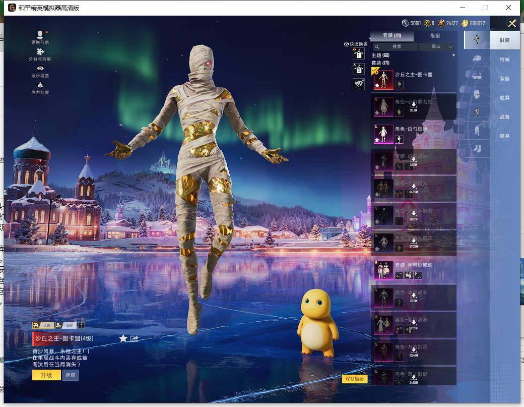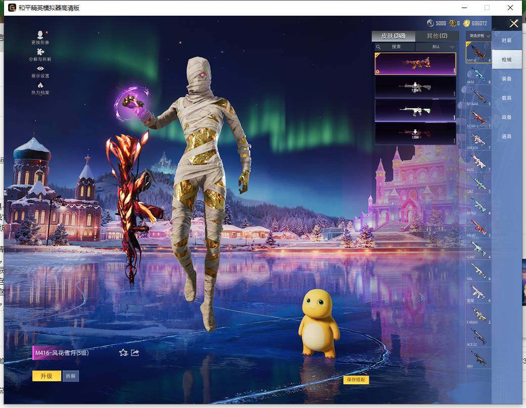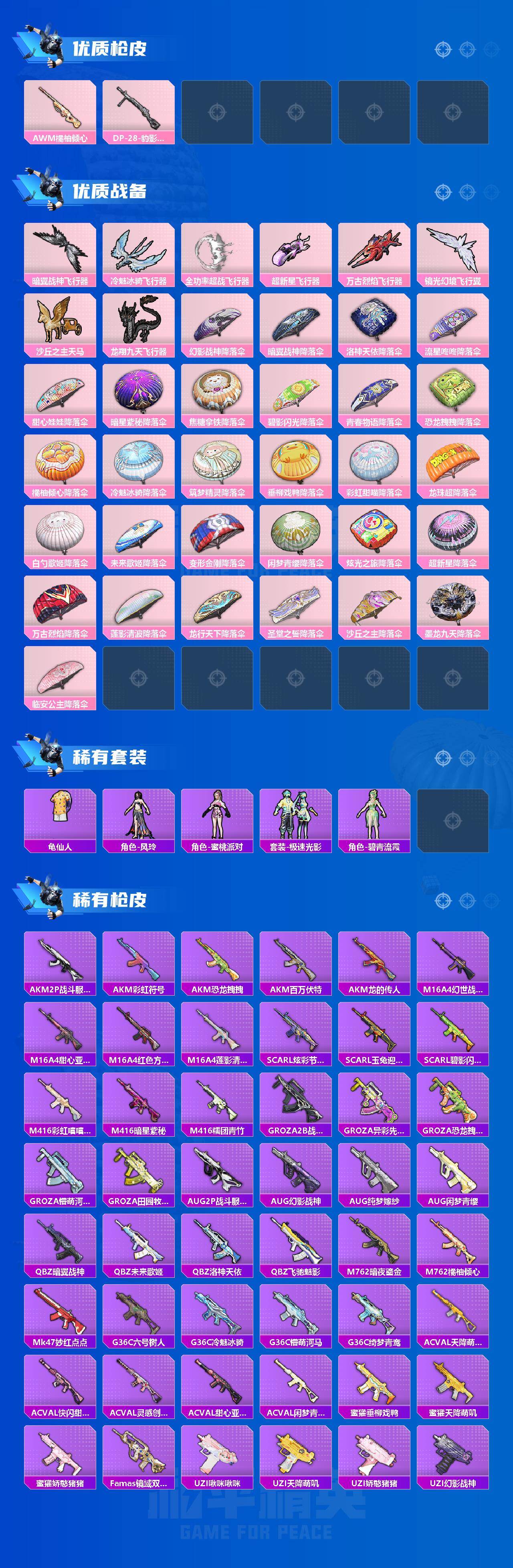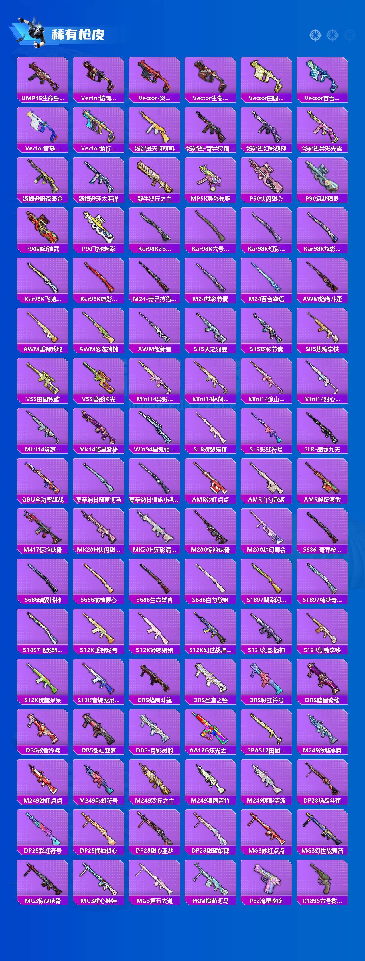 AKM-熔岩统帅,SCAR-L-青春物语,M416-风花雪月,GROZA-焦糖拿铁,GROZA-巴啦啦小魔仙,AUG-甜心首席,M762-甜心娃娃,M762-冷魅冰骑,UZI-绮梦青鸾,UMP45-恐龙拽拽,P90-能量风暴,P90-沙丘之主,Kar98K-未来歌姬,Kar98K-巳巳如意,M24-暗星紫秘,AWM-橘柚倾心
