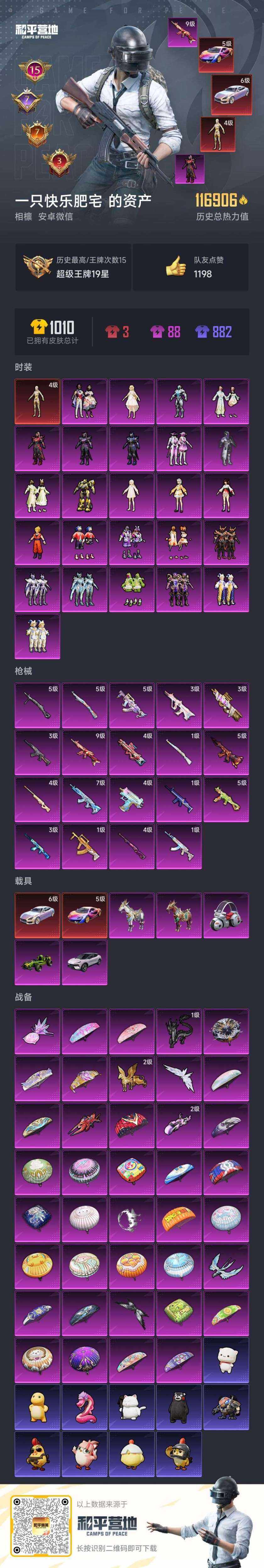 - PX_2088605- 可二次 苹果手Q-5王牌印记-10粉装-11特效枪-2载具-62864热力值-144套装-176枪皮-2卓越印记-1传奇印记, 【10粉装】,梦幻火箭,幻彩电音,星穹咏叹调,幻影飞狐,小可学妹,女娲灵识,银刃赛罗,冰霜白皇,绚金战神,呆萌星弥, 【11特效枪】,AKM-炫紫旋律-4级,SCAR-L-童趣迷兔-5级,M416-女娲灵识-3级,AUG-暖羊咩咩-5级,Kar98